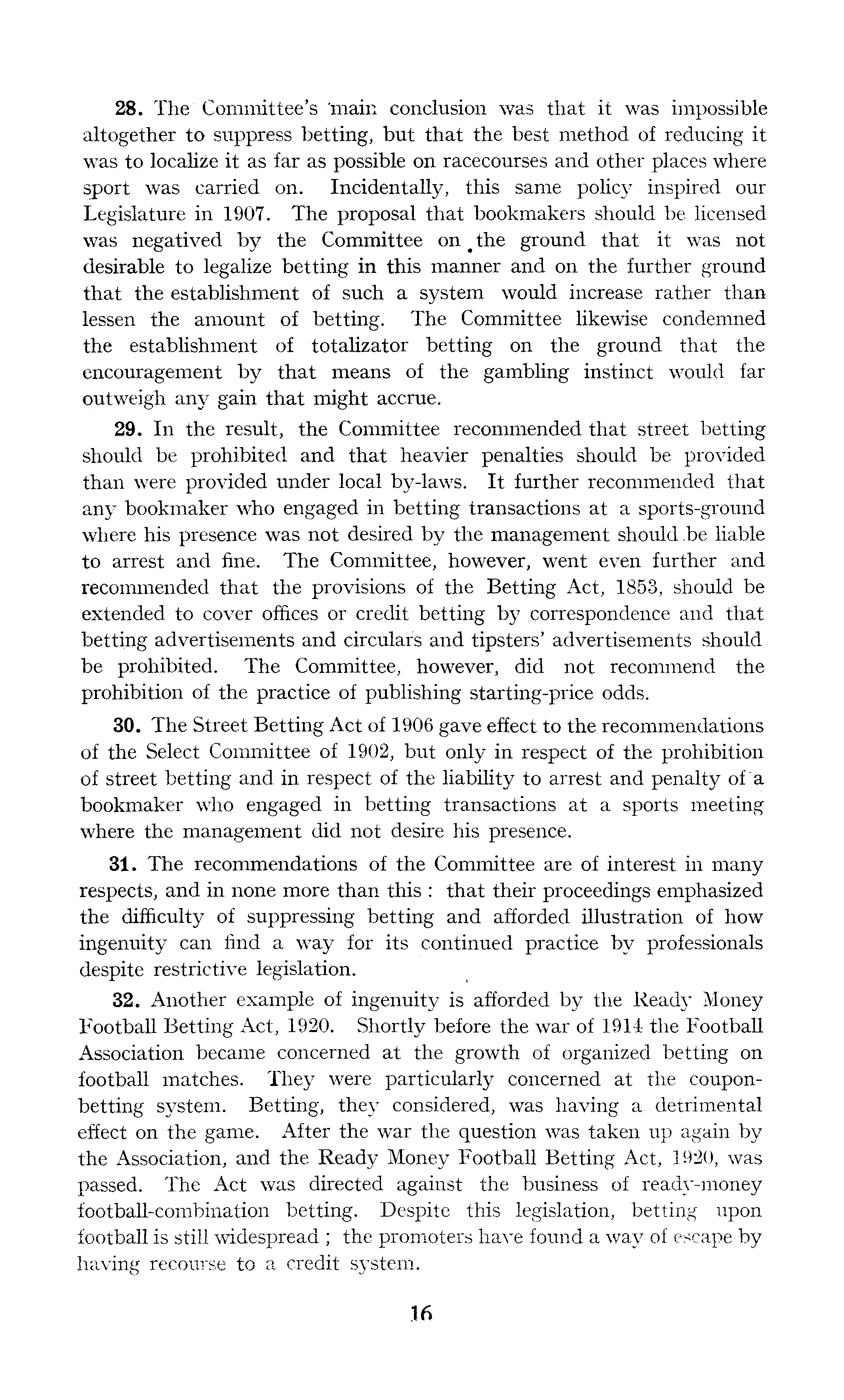 28. The Committee's 'main conclusion was that it was impossible altogether to suppress betting, but that the best method of reducing it was to localize it as far as possible on racecourses and other places where sport was carried on. Incidentally, this same policy inspired our Legislature in 1907. The proposal that bookmakers should be licensed was negatived by the Committee on # the ground that it was not desirable to legalize betting in this manner and on the further ground that the establishment of such a system would increase rather than lessen the amount of betting. The Committee likewise condemned the establishment of totalizator betting on the ground that the encouragement by that means of the gambling instinct would far outweigh any gain that might accrue. 29. In the result, the Committee recommended that street betting should be prohibited and that heavier penalties should be provided than were provided under local by-laws. It further recommended that any bookmaker who engaged in betting transactions at a sports-ground where his presence was not desired by the management should be liable to arrest and fine. The Committee, however, went even further and recommended that the provisions of the Betting Act, 1853, should be extended to cover offices or credit betting by correspondence and that betting advertisements and circulars and tipsters' advertisements should be prohibited. The Committee, however, did not recommend the prohibition of the practice of publishing starting-price odds. 30. The Street Betting Act of 1906 gave effect to the recommendations of the Select Committee of 1902, but only in respect of the prohibition of street betting and in respect of the liability to arrest and penalty of a bookmaker who engaged in betting transactions at a sports meeting where the management did not desire his presence. 31. The recommendations of the Committee are of interest in many respects, and in none more than this : that their proceedings emphasized the difficulty of suppressing betting and afforded illustration of how ingenuity can find a way for its continued practice by professionals despite restrictive legislation. 32. Another example of ingenuity is afforded by the Ready Money Football Betting Act, 1920. Shortly before the war of 1914 the Football Association became concerned at the growth of organized betting on football matches. They were particularly concerned at the couponbetting system. Betting, they considered, was having a detrimental effect on the game. After the war the question was taken up again by the Association, and the Ready Money Football Betting Act, 1920, was passed. The Act was directed against the business of ready-money football-combination betting. Despite this legislation, betting upon football is still widespread ; the promoters have found a way of escape by having recourse to a credit system.