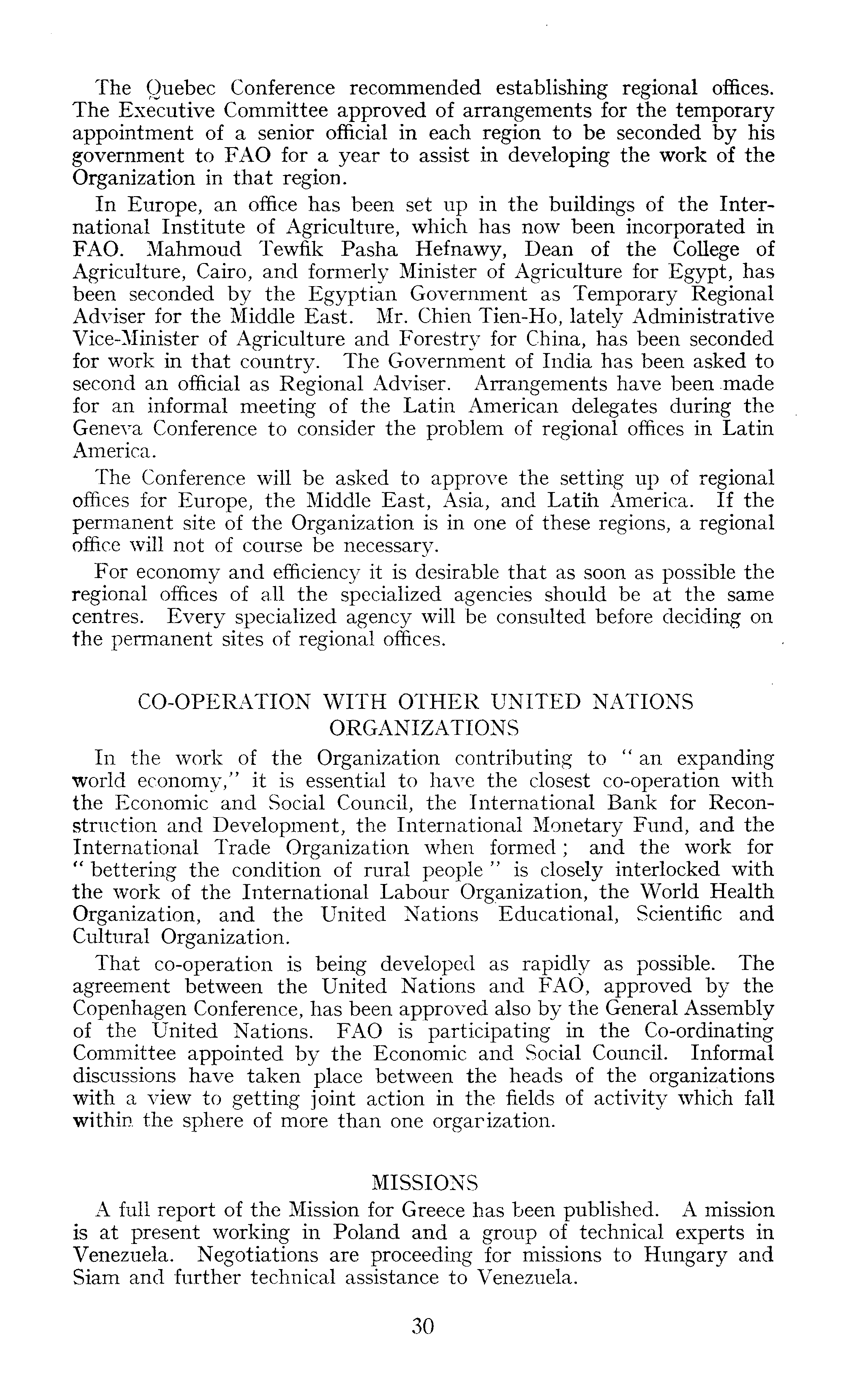 The Quebec Conference recommended establishing regional offices. The Executive Committee approved of arrangements for the temporary appointment of a senior official in each region to be seconded by his government to FAO for a year to assist in developing the work of the Organization in that region. In Europe, an office has been set up in the buildings of the International Institute of Agriculture, which has now been incorporated in FAO. Mahmoud Tewfik Pasha Hefnawy, Dean of the College of Agriculture, Cairo, and formerly Minister of Agriculture for Egypt, has been seconded by the Egyptian Government as Temporary Regional Adviser for the Middle East. Mr. Chien Tien-Ho, lately Administrative Vice-Minister of Agriculture and Forestry for China, has been seconded for work in that country. The Government of India has been asked to second an official as Regional Adviser. Arrangements have been made for an informal meeting of the Latin American delegates during the Geneva Conference to consider the problem of regional offices in Latin America. The Conference will be asked to approve the setting up of regional offices for Europe, the Middle East, Asia, and Latin America. If the permanent site of the Organization is in one of these regions, a regional office will not of course be necessary. For economy and efficiency it is desirable that as soon as possible the regional offices of all the specialized agencies should be at the same centres. Every specialized agency will be consulted before deciding on the permanent sites of regional offices. CO-OPERATION WITH OTHER UNITED NATIONS ORGANIZATIONS In the work of the Organization contributing to "an expanding world economy," it is essential to have the closest co-operation with the Economic and Social Council, the International Bank for Reconstruction and Development, the International Monetary Fund, and the International Trade Organization when formed; and the work for " bettering the condition of rural people " is closely interlocked with the work of the International Labour Organization, the World Health Organization, and the United Nations Educational, Scientific and Cultural Organization. That co-operation is being developed as rapidly as possible. The agreement between the United Nations and FAO, approved by the Copenhagen Conference, has been approved also by the General Assembly of the United Nations. FAO is participating in the Co-ordinating Committee appointed by the Economic and Social Council. Informal discussions have taken place between the heads of the organizations with a view to getting joint action in the fields of activity which fall within the sphere of more than one organization. MISSIONS A full report of the Mission for Greece has been published. A mission is at present working in Poland and a group of technical experts in Venezuela. Negotiations are proceeding for missions to Hungary and Siam and further technical assistance to Venezuela.