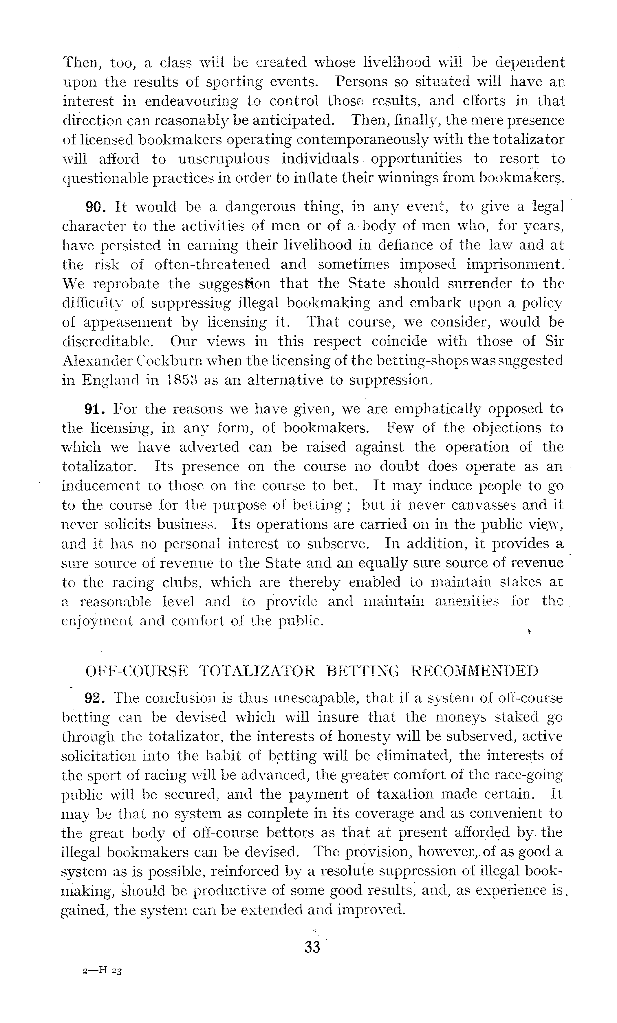 Then, too, a class will be created whose livelihood will be dependent upon the results of sporting events. Persons so situated will have an interest in endeavouring to control those results, and efforts in that direction can reasonably be anticipated. Then, finally, the mere presence of licensed bookmakers operating contemporaneously with the totalizator will afford to unscrupulous individuals opportunities to resort to questionable practices in order to inflate their winnings from bookmakers., 90. It would be a dangerous thing, in any event, to give a legal character to the activities of men or of a body of men who, for years, have persisted in earning their livelihood in defiance of the law and at the risk of often-threatened and sometimes imposed imprisonment. We reprobate the suggestion that the State should surrender to the difficulty of suppressing illegal bookmaking and embark upon a policy of appeasement by licensing it. ' That course, we consider, would be discreditable. Our views in this respect coincide with those of Sir Alexander Cockburn when the licensing of the betting-shops was suggested in England in 1853 as an alternative to suppression. 91. For the reasons we have given, we are emphatically opposed to the licensing, in any form, of bookmakers. Few of the objections to which we have adverted can be raised against the operation of the totalizator. Its presence on the course no doubt does operate as an inducement to those on the course to bet. It may induce people to go to the course for the purpose of betting ; but it never canvasses and it never solicits business. Its operations are carried on in the public view, and it has no personal interest to subserve. In addition, it provides a sure, source of revenue to the State and an equally sure source of revenue to the racing clubs, which are, thereby enabled to maintain stakes at a reasonable level and to provide and maintain amenities for the enjoyment and comfort of the public. OFF-COURSE TOTALIZATOR BETTING RECOMMENDED 92. The conclusion is thus unescapable, that if a system of off-course betting can be devised which will insure that the moneys staked go through the totalizator, the interests of honesty will be subserved, active solicitation into the habit of betting will be eliminated, the interests of the sport of racing will be advanced, the greater comfort of the race-going public will be secured, and the payment of taxation made certain. It may be that no system as complete in its coverage and as convenient to the great body of off-course bettors as that at present afforded by- the illegal bookmakers can be devised. The provision, however,- of as good a system as is possible, reinforced by a resolute suppression of illegal bookmaking, should be productive of some good results, and, as experience is, gained, the system can be extended and improved.