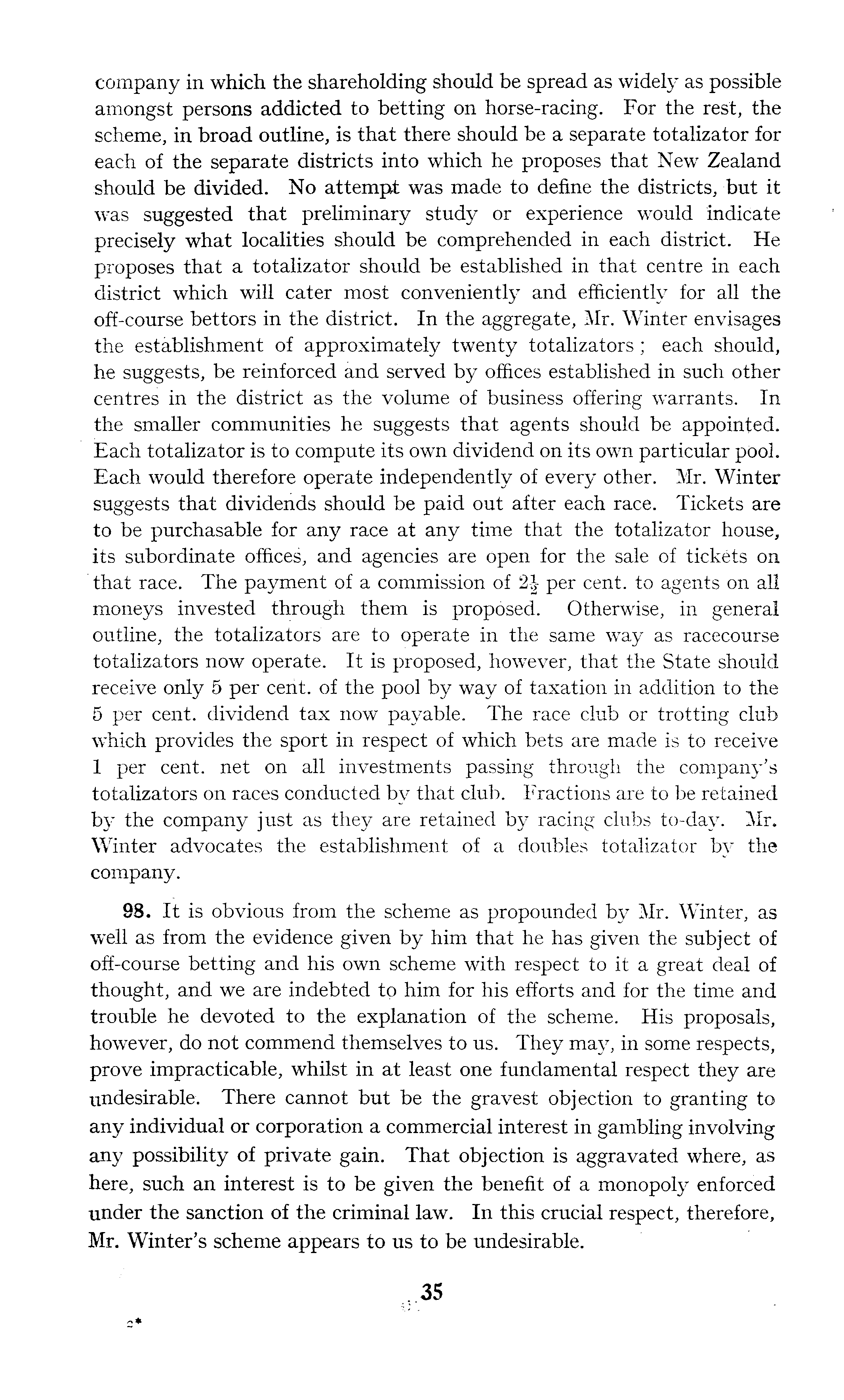company in which the shareholding should be spread as widely as possible amongst persons addicted to betting on horse-racing. For the rest, the scheme, in broad outline, is that there should be a separate totalizator for each of the separate districts into which he proposes that New Zealand should be divided. No attempt was made to define the districts, but it was suggested that preliminary study or experience would indicate precisely what localities should be comprehended in each district. He proposes that a totalizator should be established in that centre in each district which will cater most conveniently and efficiently for all the off-course bettors in the district. In the aggregate, Mr. Winter envisages the establishment of approximately twenty totalizators; each should, he suggests, be reinforced and served by offices established in such other centres in the district as the volume of business offering warrants. In the smaller communities he suggests that agents should be appointed. Each totalizator is to compute its own dividend on its own particular pool. Each would therefore operate independently of every other. Mr. Winter suggests that dividends should be paid out after each race. Tickets are to be purchasable for any race at any time that the totalizator house, its subordinate offices, and agencies are open for the sale of tickets on that race. The payment of a commission of per cent, to agents on all moneys invested through them is proposed. Otherwise, in general outline, the totalizators are to operate in the same way as racecourse totalizators now operate. It is proposed, however, that the State should receive only 5 per cent, of the pool by way of taxation in addition to the 5 per cent, dividend tax now payable. The race club or trotting club which provides the sport in respect of which bets are made is to receive 1 per cent, net on all investments passing through the company's totalizators on races conducted by that club. Fractions are to be retained by the company just as they are retained by racing clubs to-day. Mr. Winter advocates the establishment of a doubles totalizator by the company. 98. It is obvious from the scheme as propounded by Mr. Winter, as well as from the evidence given by him that he has given the subject of off-course betting and his own scheme with respect to it a great deal of thought, and we are indebted to him for his efforts and for the time and trouble he devoted to the explanation of the scheme. His proposals, however, do not commend themselves to us. They may, in some respects, prove impracticable, whilst in at least one fundamental respect they are undesirable. There cannot but be the gravest objection to granting to any individual or corporation a commercial interest in gambling involving any possibility of private gain. That objection is aggravated where, as here, such an interest is to be given the benefit of a monopoly enforced under the sanction of the criminal law. In this crucial respect, therefore, Mr. Winter's scheme appears to us to be undesirable.