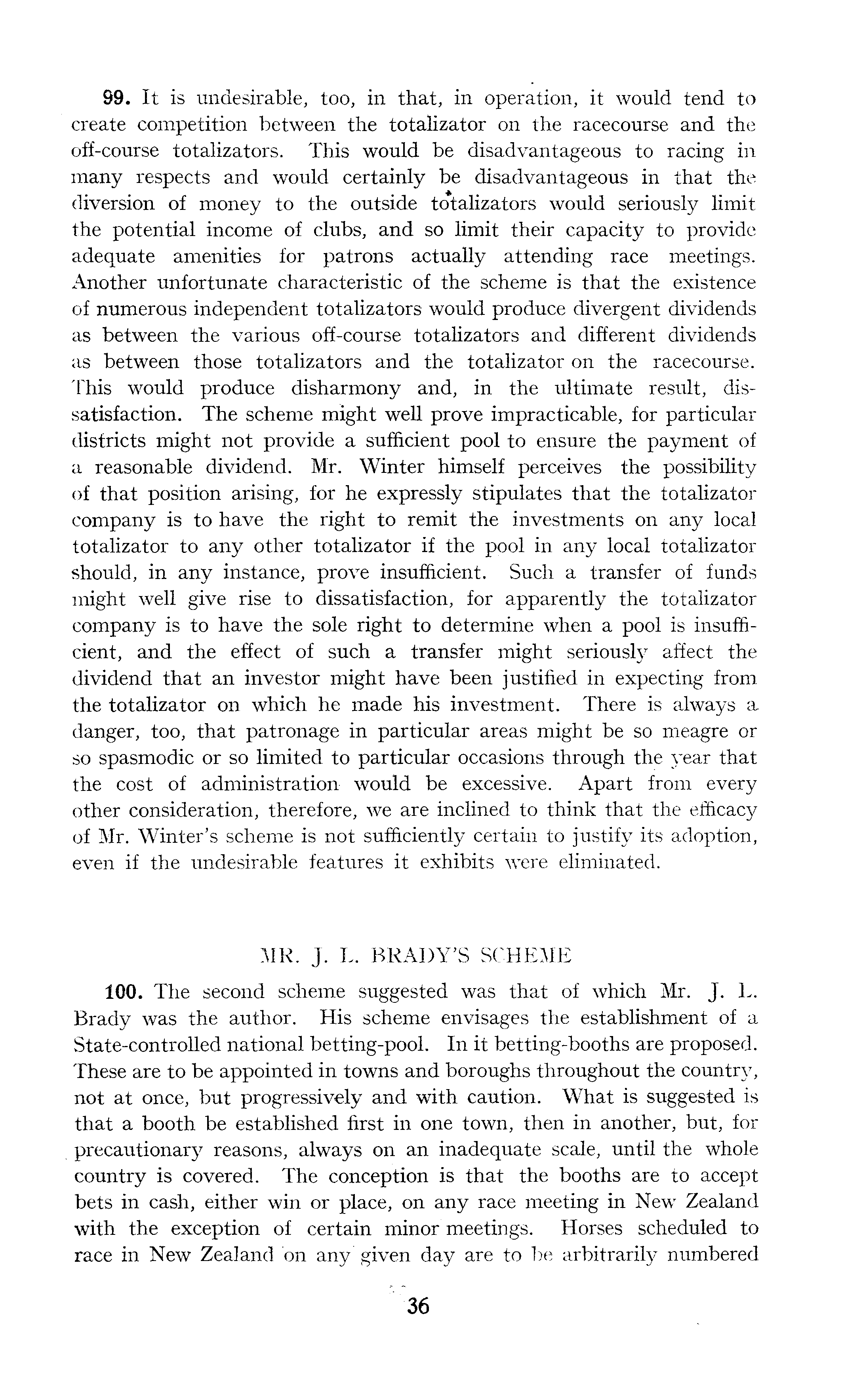 99. It is undesirable, too, in that, in operation, it would tend to create competition between the totalizator on the racecourse and the off-course totalizators. This would be disadvantageous to racing in many respects and would certainly be disadvantageous in that the diversion of money to the outside totalizators would seriously limit the potential income of clubs, and so limit their capacity to provide adequate amenities for patrons actually attending race meetings. Another unfortunate characteristic of the scheme is that the existence of numerous independent totalizators would produce divergent dividends as between the various off-course totalizators and different dividends as between those totalizators and the totalizator on the racecourse. This would produce disharmony and, in the ultimate result, dissatisfaction. The scheme might well prove impracticable, for particular districts might not provide a sufficient pool to ensure the payment of a reasonable dividend. Mr. Winter himself perceives the possibility of that position arising, for he expressly stipulates that the totalizator company is to have the right to remit the investments on any local totalizator to any other totalizator if the pool in any local totalizator should, in any instance, prove insufficient. Such a transfer of funds might well give rise to dissatisfaction, for apparently the totalizator company is to have the sole right to determine when a pool is insufficient, and the effect of such a transfer might seriously affect the dividend that an investor might have been justified in expecting from the totalizator on which he made his investment. There is always a danger, too, that patronage in particular areas might be so meagre or so spasmodic or so limited to particular occasions through the year that the cost of administration would be excessive. Apart from every other consideration, therefore, we are inclined to think that the efficacy of Mr. Winter's scheme is not sufficiently certain to justify its adoption, even if the undesirable features it exhibits were eliminated. MR. J. L. BRADY'S SCHEME 100. The second scheme suggested was that of which Mr. J. L. Brady was the author. His scheme envisages the establishment of a State-controlled national betting-pool. In it betting-booths are proposed. These are to be appointed in towns and boroughs throughout the country, not at once, but progressively and with caution. What is suggested is that a booth be established first in one town, then in another, but, for precautionary reasons, always on an inadequate scale, until the whole country is covered. The conception is that the booths are to accept bets in cash, either win or place, on any race meeting in New Zealand with the exception of certain minor meetings. Horses scheduled to race in New Zealand on any given day are to be arbitrarily numbered