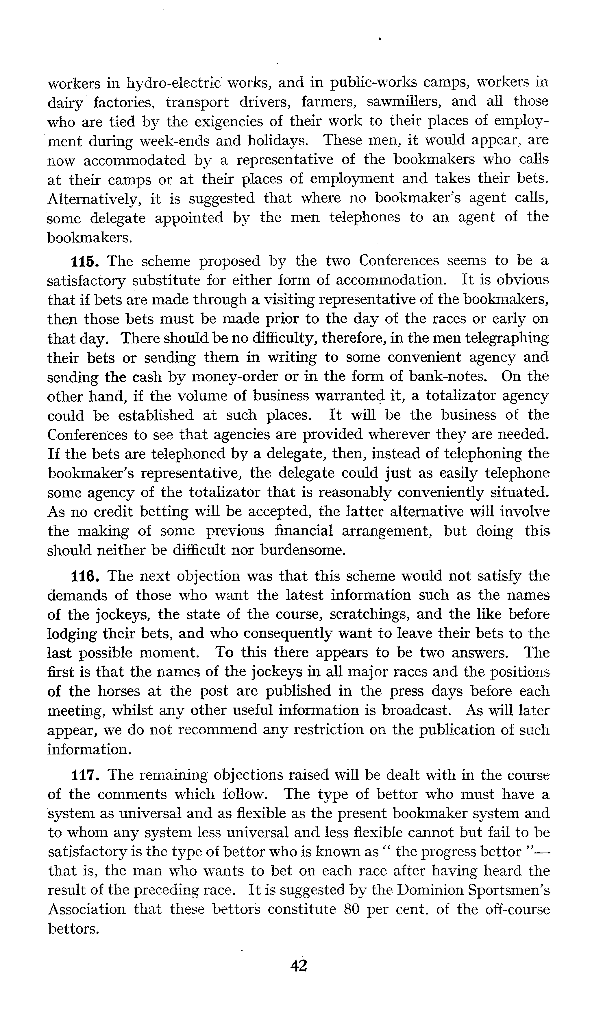 workers in hydro-electric works, and in public-works camps, workers in dairy factories, transport drivers, farmers, sawmillers, and all those who are tied by the exigencies of their work to their places of employment during week-ends and holidays. These men, it would appear, are now accommodated by a representative of the bookmakers who calls at their camps or at their places of employment and takes their bets. Alternatively, it is suggested that where no bookmaker's agent calls, some delegate appointed by the men telephones to an agent of the bookmakers. 115. The scheme proposed by the two Conferences seems to be a satisfactory substitute for either form of accommodation. It is obvious that if bets are made through a visiting representative of the bookmakers, then those bets must be made prior to the day of the races or early on that day. There should be no difficulty, therefore, in the men telegraphing their bets or sending them in writing to some convenient agency and sending the cash by money-order or in the form of bank-notes. On the other hand, if the volume of business warranted it, a totalizator agency could be established at such places. It will be the business of the Conferences to see that agencies are provided wherever they are needed. If the bets are telephoned by a delegate, then, instead of telephoning the bookmaker's representative, the delegate could just as easily telephone some agency of the totalizator that is reasonably conveniently situated. As no credit betting will be accepted, the latter alternative will involve the making of some previous financial arrangement, but doing this should neither be difficult nor burdensome. 116. The next objection was that this scheme would not satisfy the demands of those who want the latest information such as the names of the jockeys, the state of the course, scratchings, and the like before lodging their bets, and who consequently want to leave their bets to the last possible moment. To this there appears to be two answers. The first is that the names of the jockeys in all major races and the positions of the horses at the post are published in the press days before each meeting, whilst any other useful information is broadcast. As will later appear, we do not recommend any restriction on the publication of such information. 117. The remaining objections raised will be dealt with in the course of the comments which follow. The type of bettor who must have a system as universal and as flexible as the present bookmaker system and to whom any system less universal and less flexible cannot but fail to be satisfactory is the type of bettor who is known as " the progress bettor " that is, the man who wants to bet on each race after having heard the result of the preceding race. It is suggested by the Dominion Sportsmen's Association that these bettors constitute 80 per cent, of the off-course bettors.