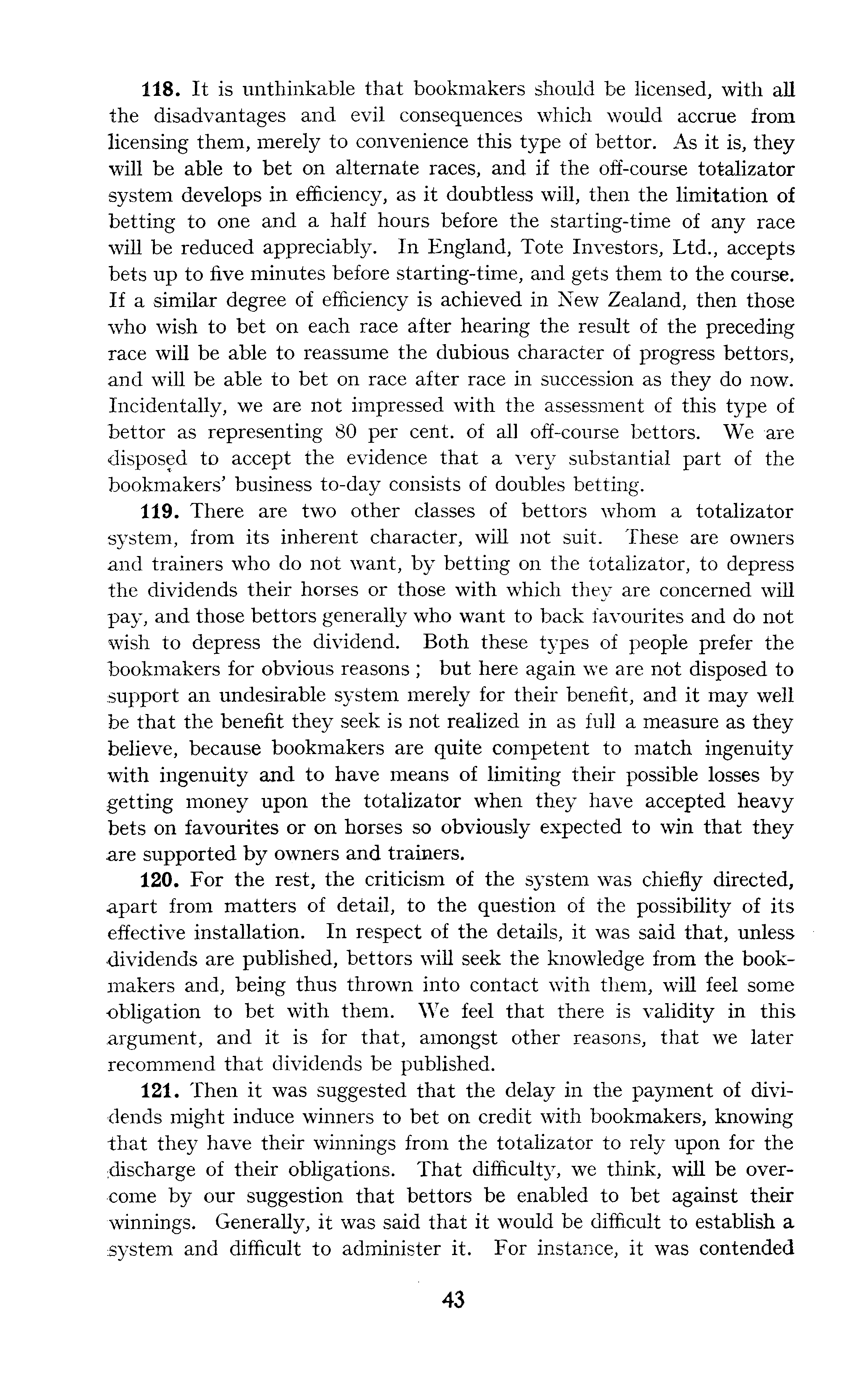 118. It is unthinkable that bookmakers should be licensed, with all the disadvantages and evil consequences which would accrue from licensing them, merely to convenience this type of bettor. As it is, they will be able to bet on alternate races, and if the off-course totalizator system develops in efficiency, as it doubtless will, then the limitation of betting to one and a half hours before the starting-time of any race will be reduced appreciably. In England, Tote Investors, Ltd., accepts bets up to five minutes before starting-time, and gets them to the course. If a similar degree of efficiency is achieved in New Zealand, then those who wish to bet on each race after hearing the result of the preceding race will be able to reassume the dubious character of progress bettors, and will be able to bet on race after race in succession as they do now. Incidentally, we are not impressed with the assessment of this type of bettor as representing 80 per cent, of all off-course bettors. We are disposed to accept the evidence that a very substantial part of the bookmakers' business to-day consists of doubles betting. 119. There are two other classes of bettors whom a totalizator system, from its inherent character, will not suit. These are owners and trainers who do not want, by betting on the totalizator, to depress the dividends their horses or those with which they are concerned will pay, and those bettors generally who want to back favourites and do not wish to depress the dividend. Both these types of people prefer the bookmakers for obvious reasons ; but here again we are not disposed to support an undesirable system merely for their benefit, and it may well be that the benefit they seek is not realized in as full a measure as they believe, because bookmakers are quite competent to match ingenuity with ingenuity and to have means of limiting their possible losses by getting money upon the totalizator when they have accepted heavy bets on favourites or on horses so obviously expected to win that they are supported by owners and trainers. 120. For the rest, the criticism of the system was chiefly directed, apart from matters of detail, to the question of the possibility of its effective installation. In respect of the details, it was said that, unless dividends are published, bettors will seek the knowledge from the bookmakers and, being thus thrown into contact with them, will feel some ■obligation to bet with them. We" feel that there is validity in this argument, and it is for that, amongst other reasons, that we later recommend that dividends be published. 121. Then it was suggested that the delay in the payment of dividends might induce winners to bet on credit with bookmakers, knowing that they have their winnings from the totalizator to rely upon for the discharge of their obligations. That difficulty, we think, will be overcome by our suggestion that bettors be enabled to bet against their winnings. Generally, it was said that it would be difficult to establish a system and difficult to administer it. For instance, it was contended