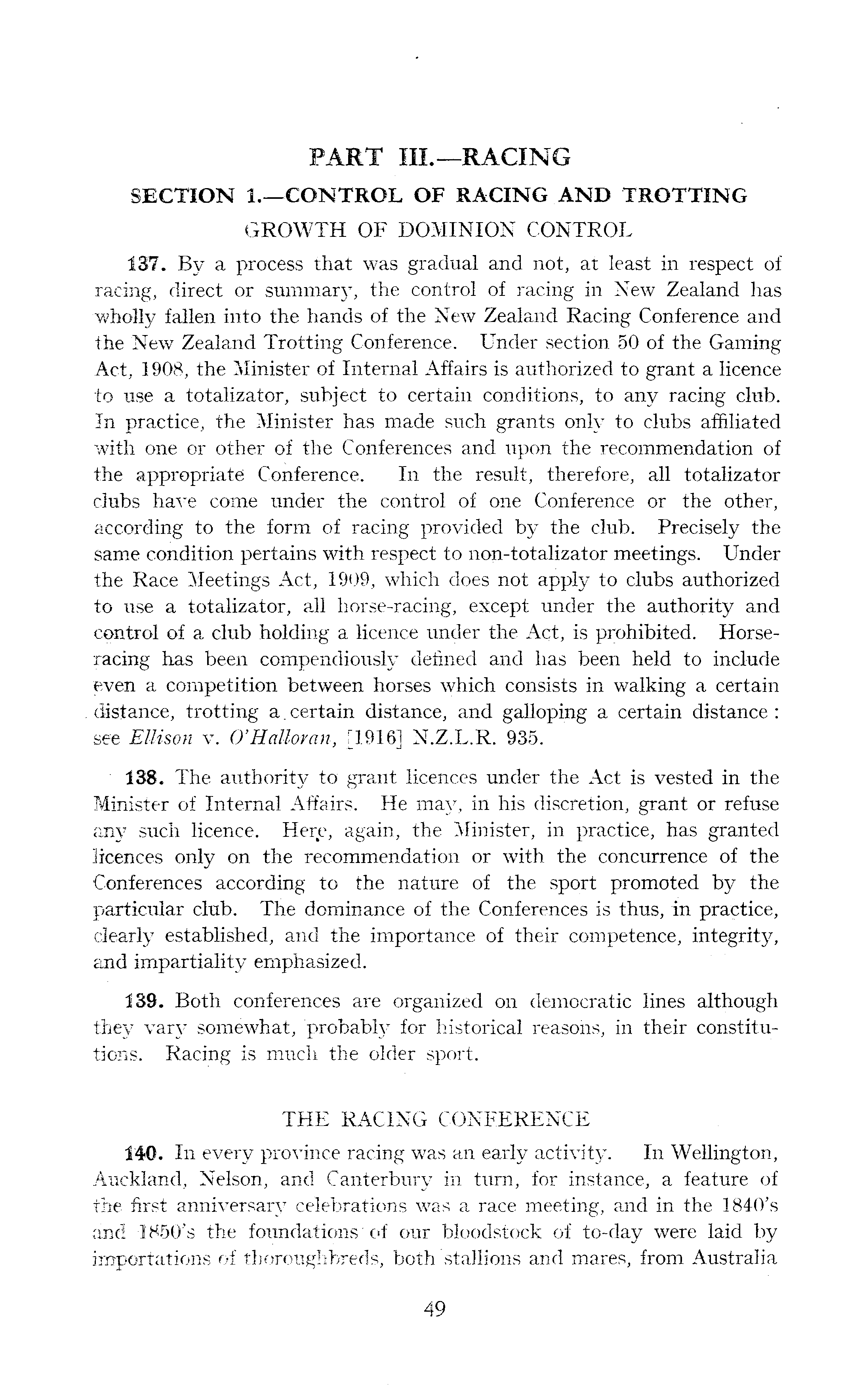 PART III.—RACING SECTION I.—CONTROL OF RACING AND TROTTING GROWTH OF DOMINION CONTROL 137. By a process that was gradual and not, at least in respect of racing, direct or summary, the control of racing in New Zealand has wholly fallen into the hands of the New Zealand Racing Conference and the New Zealand Trotting Conference. Under section 50 of the Gaming Act, 1908, the Minister of Internal Affairs is authorized to grant a licence to use a totalizator, subject to certain conditions, to any racing club. In practice, the Minister has made such grants only to clubs affiliated with one or other of the Conferences and upon the recommendation of the appropriate Conference. In the result, therefore, all totalizator clubs have come under the control of one Conference or the other, according to the form of racing provided by the club. Precisely the same condition pertains with respect to non-totalizator meetings. Under the Race Meetings Act, 1909, which does not apply to clubs authorized to use a totalizator, all horse-racing, except under the authority and control of a club holding a licence under the Act, is prohibited. Horseracing has been compendiously defined and has been held to include even a competition between horses which consists in walking a certain distance, trotting a/certain distance, and galloping a certain distance : see Ellison v. O'Halloran, £1916} N.Z.L.R. 935. 138. The authority to grant licences under the Act is vested in the Minister of Internal Affairs. He may, in his discretion, grant or refuse any such licence. Here, again, the Minister, in practice, has granted licences only on the recommendation or with the concurrence of the Conferences according to the nature of the sport promoted by the particular club. The dominance of the Conferences is thus, in practice, clearly established, and the importance of their competence, integrity, and impartiality'emphasized. 139. Both conferences are organized on democratic lines although they vary somewhat, probably for historical reasons, in their constitutions.. Racing is much the older sport. THE RAGING CONFERENCE 140. In every province racing was an early activity. In Wellington, Auckland, Nelson, and Canterbury in turn, for instance, a feature of the first anniversary celebrations was a race meeting, and in the 1840's and 1850's the foundations' of our bloodstock of to-day were laid'by importations of thoroughbreds, both stallions and mares, from Australia