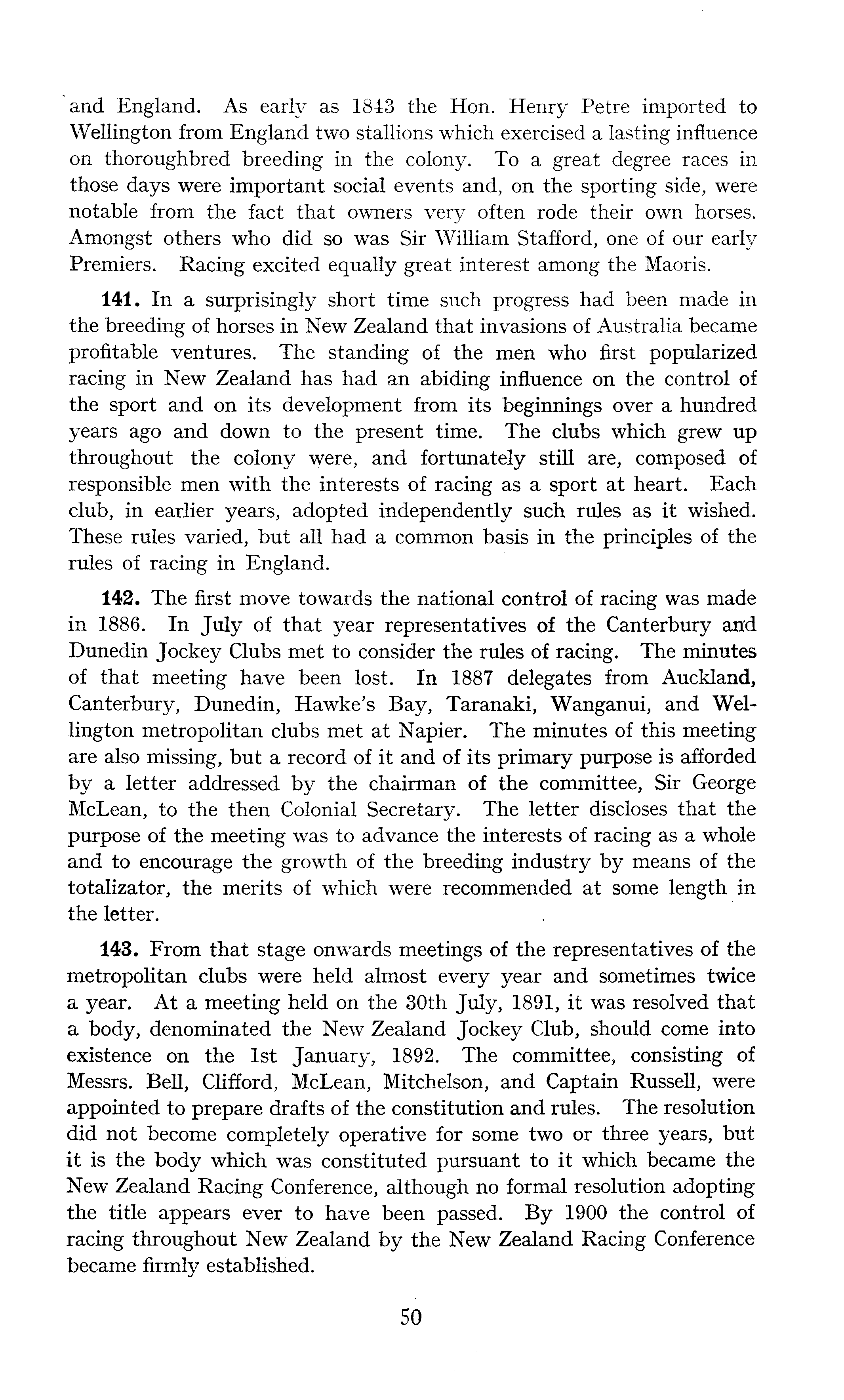 and England. As early as 1843 the Hon. Henry Petre imported to Wellington from England two stallions which exercised a lasting influence on thoroughbred breeding in the colony. To a great degree races in those days were important social events and, on the sporting side, were notable from the fact that owners very often rode their own horses. Amongst others who did so was Sir William Stafford, one of our early Premiers. Racing excited equally great interest among the Maoris. 141. In a surprisingly short time such progress had been made in the breeding of horses in New Zealand that invasions of Australia became profitable ventures. The standing of the men who first popularized racing in New Zealand has had an abiding influence on the control of the sport and on its development from its beginnings over a hundred years ago and down to the present time. The clubs which grew up throughout the colony were, and fortunately still are, composed of responsible men with the interests of racing as a sport at heart. Each club, in earlier years, adopted independently such rules as it wished. These rules varied, but all had a common basis in the principles of the rules of racing in England. 142. The first move towards the national control of racing was made in 1886. In July of that year representatives of the Canterbury and Dunedin Jockey Clubs met to consider the rules of racing. The minutes of that meeting have been lost. In 1887 delegates from Auckland, Canterbury, Dunedin, Hawke's Bay, Taranaki, Wanganui, and Wellington metropolitan clubs met at Napier. The minutes of this meeting are also missing, but a record of it and of its primary purpose is afforded by a letter addressed by the chairman of the committee, Sir George McLean, to the then Colonial Secretary. The letter discloses that the purpose of the meeting was to advance the interests of racing as a whole and to encourage the growth of the breeding industry by means of the totalizator, the merits of which were recommended at some length in the letter. 143. From that stage onwards meetings of the representatives of the metropolitan clubs were held almost every year and sometimes twice a year. At a meeting held on the 30th July, 1891, it was resolved that a body, denominated the New Zealand Jockey Club, should come into existence on the Ist January, 1892. The committee, consisting of Messrs. Bell, Clifford, McLean, Mitchelson, and Captain Russell, were appointed to prepare drafts of the constitution and rules. The resolution did not become completely operative for some two or three years, but it is the body which was constituted pursuant to it which became the New Zealand Racing Conference, although no formal resolution adopting the title appears ever to have been passed. By 1900 the control of racing throughout New Zealand by the New Zealand Racing Conference became firmly established.