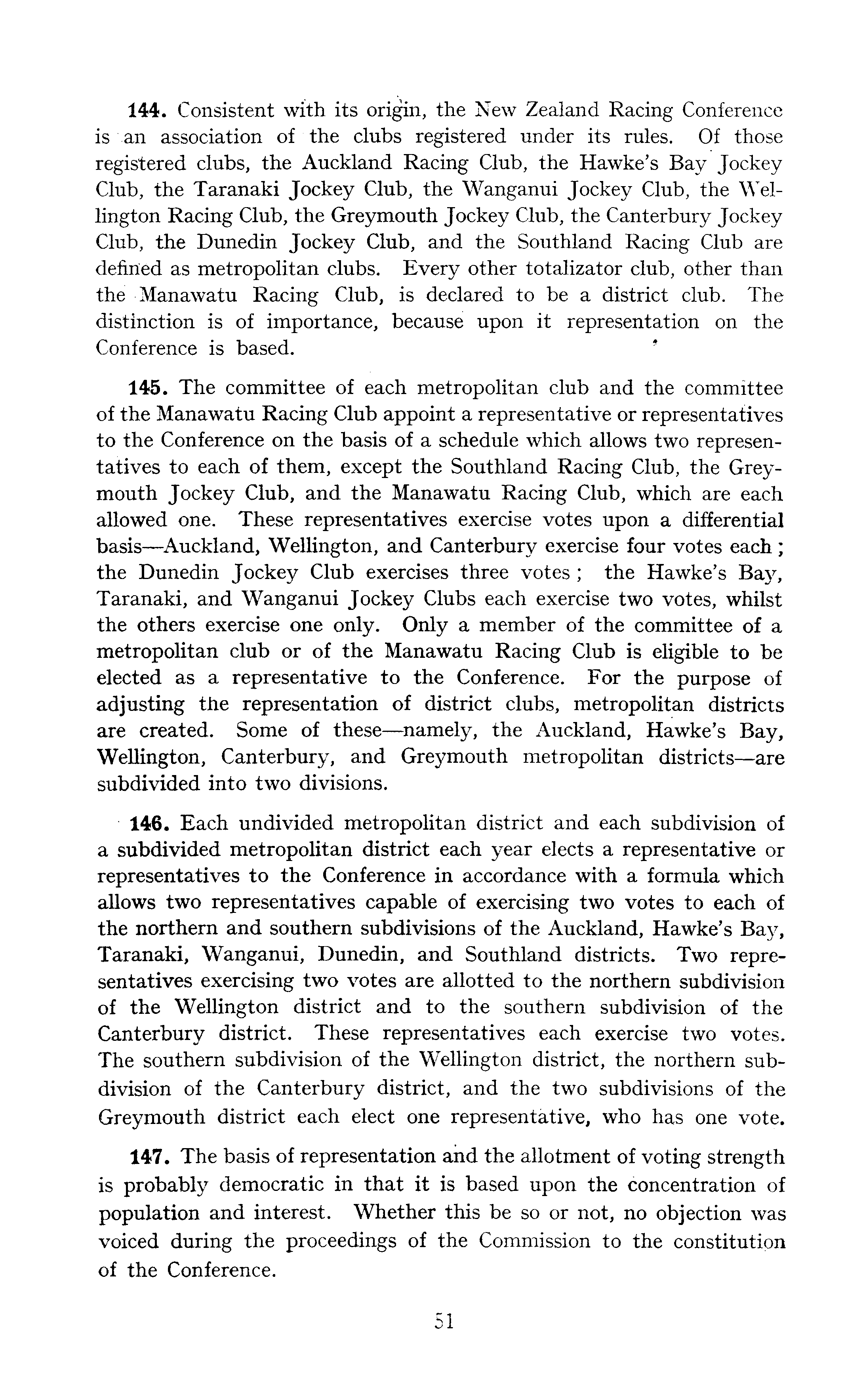 144. Consistent with its origin, the New Zealand Racing Conference is an association of the clubs registered under its rules. Of those registered clubs, the Auckland Racing Club, the Hawke's Bay Jockey Club, the Taranaki Jockey Club, the Wanganui Jockey Club, the Wellington Racing Club, the Greymouth Jockey Club, the Canterbury Jockey Club, the Dunedin Jockey Club, and the Southland Racing Club are defined as metropolitan clubs. Every other totalizator club, other than the Manawatu Racing Club, is declared to be a district club. The distinction is of importance, because upon it representation on the Conference is based. 145. The committee of each metropolitan club and the committee of the Manawatu Racing Club appoint a representative or representatives to the Conference on the basis of a schedule which allows two representatives to each of them, except the Southland Racing Club, the Greymouth Jockey Club, and the Manawatu Racing Club, which are each allowed one. These representatives exercise votes upon a differential basis—Auckland, Wellington, and Canterbury exercise four votes each ; the Dunedin Jockey Club exercises three votes ; the Hawke's Bay, Taranaki, and Wanganui Jockey Clubs each exercise two votes, whilst the others exercise one only. Only a member of the committee of a metropolitan club or of the Manawatu Racing Club is eligible to be elected as a representative to the Conference. For the purpose of adjusting the representation of district clubs, metropolitan districts are created. Some of these —namely, the Auckland, Hawke's Bay, Wellington, Canterbury, and Greymouth metropolitan districts—are subdivided into two divisions. 146. Each undivided metropolitan district and each subdivision of a subdivided metropolitan district each year elects a representative or representatives to the Conference in accordance with a formula which allows two representatives capable of exercising two votes to each of the northern and southern subdivisions of the Auckland, Hawke's Bay, Taranaki, Wanganui, Dunedin, and Southland districts. Two representatives exercising two votes are allotted to the northern subdivision of the Wellington district and to the southern subdivision of the Canterbury district. These representatives each exercise two votes. The southern subdivision of the Wellington district, the northern subdivision of the Canterbury district, and the two subdivisions of the Greymouth district each elect one representative, who has one vote. 147. The basis of representation and the allotment of voting strength is probably democratic in that it is based upon the concentration of population and interest. Whether this be so or not, no objection was voiced during the proceedings of the Commission to the constitution of the Conference.