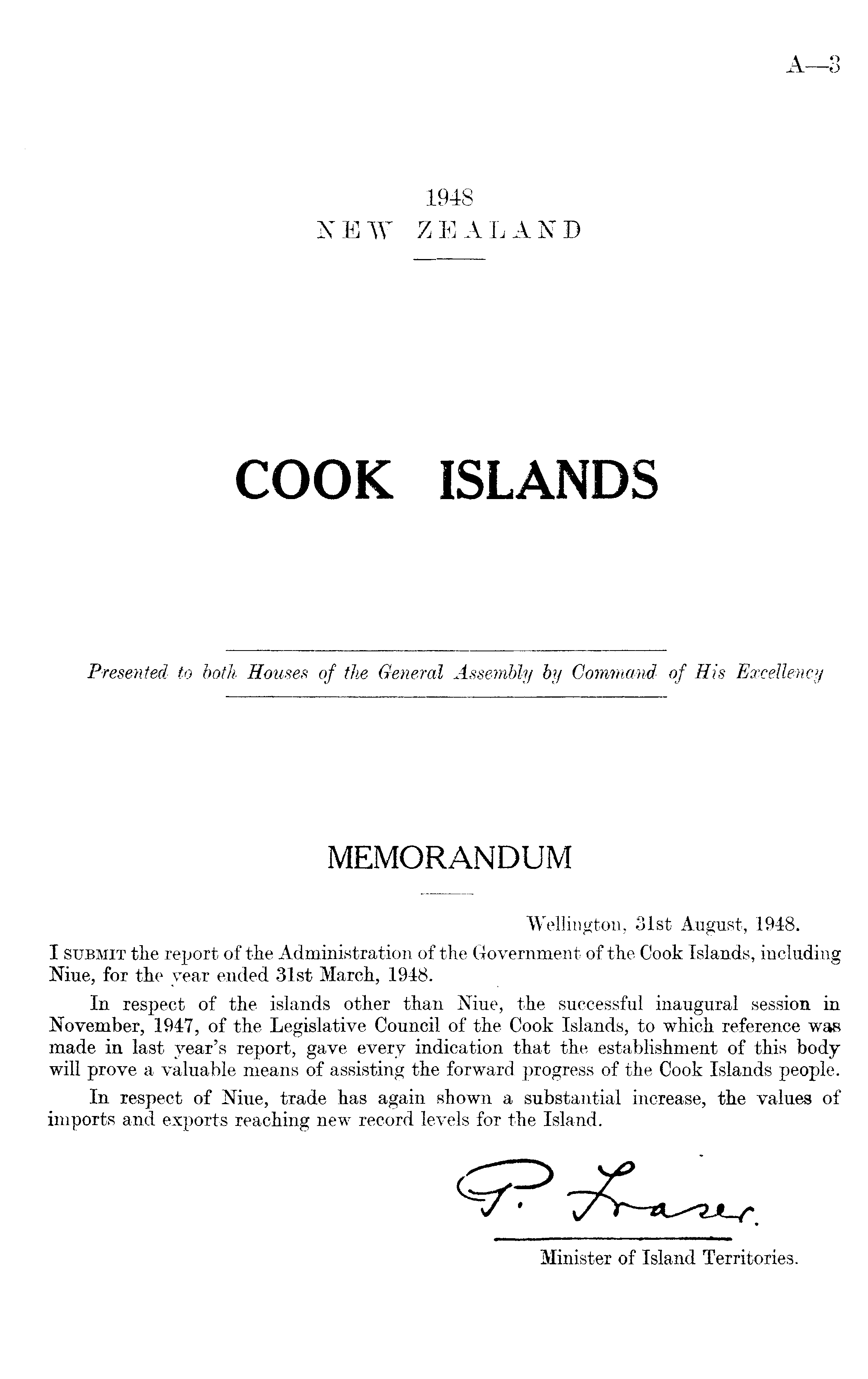 MEMORANDUM Wellington, 31st August, 1948. I submit the report of the Administration of the Government of the Cook Islands, including Mue, for the year ended 31st March, 1948. In respect of the islands other than Mue, the successful inaugural session in November, 1947, of the Legislative Council of the Cook Islands, to which reference was made in last year's report, gave every indication that the establishment of this body will prove a valuable means of assisting the forward progress of the Cook Islands people. In respect of Niue, trade has again shown a substantial increase, the values of imports and exports reaching new record levels for the Island. Minister of Island Territories.
