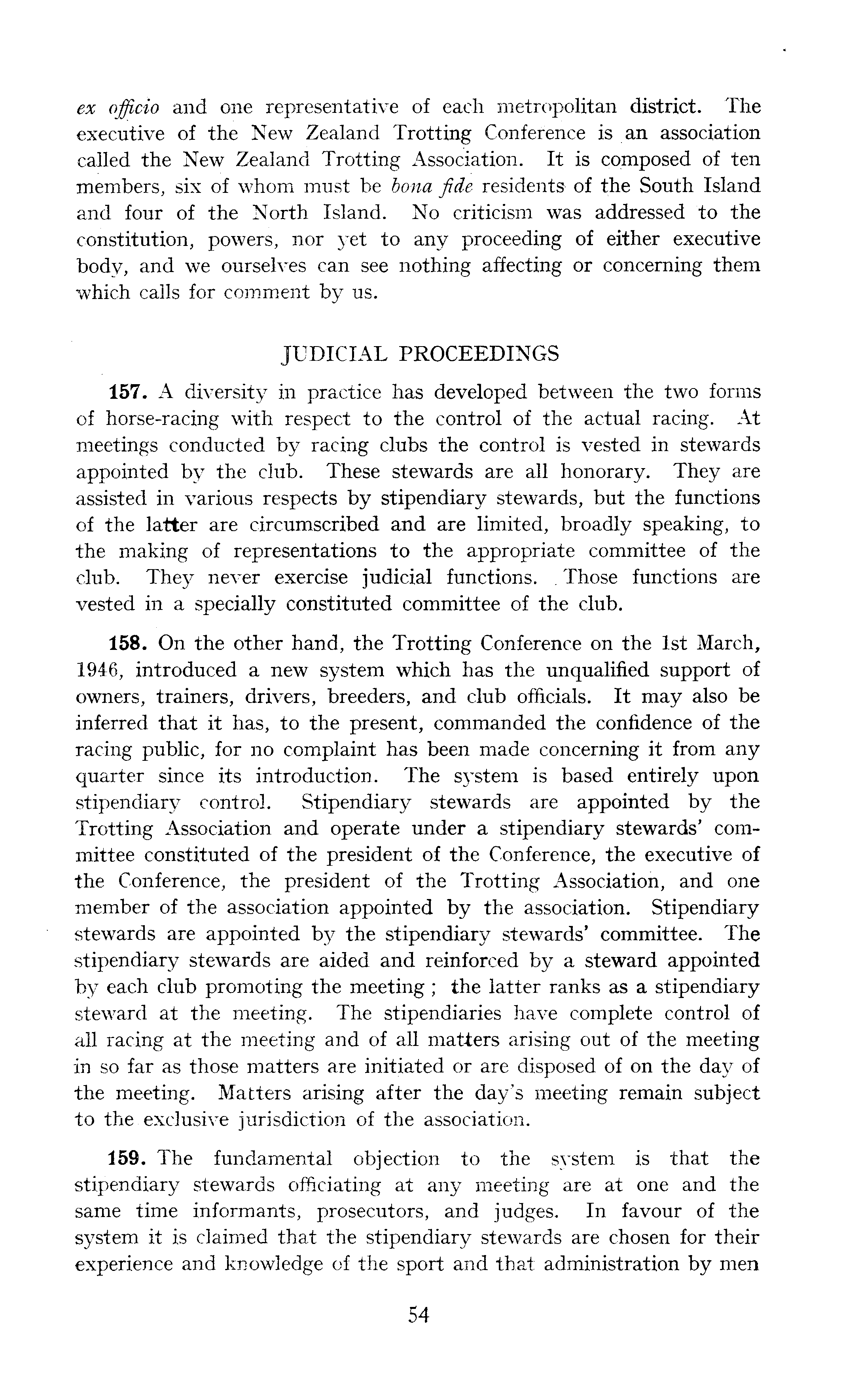 ex officio and one representative of each metropolitan district. The executive of the New Zealand Trotting Conference is an association called the New Zealand Trotting Association. It is composed of ten members, six of whom must be bona fide residents of the South Island and four of the North Island. No criticism was addressed to the constitution, powers, nor yet to any proceeding of either executive body, and we ourselves can see nothing affecting or concerning them which calls for comment by us. JUDICIAL PROCEEDINGS 157. A diversity in practice has developed between the two forms of horse-racing with respect to the control of the actual racing. At meetings conducted by racing clubs the control is vested in stewards appointed by the club. These stewards are all honorary. They are assisted in various respects by stipendiary stewards, but the functions of the latter are circumscribed and are limited, broadly speaking, to the making of representations to the appropriate committee of the club. They never exercise judicial functions. . Those functions are vested in a specially constituted committee of the club. 158. On the other hand, the Trotting Conference on the Ist March, 1946, introduced a new system which has the unqualified support of owners, trainers, drivers, breeders, and club officials. It may also be inferred that it has, to the present, commanded the confidence of the racing public, for no complaint has been made concerning it from any quarter since its introduction. The system is based entirely upon stipendiary control. Stipendiary stewards are appointed by the Trotting Association and operate under a stipendiary stewards' committee constituted of the president of the Conference, the executive of the Conference, the president of the Trotting Association, and one member of the association appointed by the association. Stipendiary stewards are appointed by the stipendiary stewards' committee. The stipendiary stewards are aided and reinforced by a steward appointed by each club promoting the meeting; the latter ranks as a stipendiary steward at the meeting. The stipendiaries have complete control of all racing at the meeting and of all matters arising out of the meeting in so far as those matters are initiated or are disposed of on the day of the meeting. Matters arising after the day's meeting remain subject to the, exclusive jurisdiction of the association. 159. The fundamental objection to the system is that the stipendiary stewards officiating at any meeting are at one and the same time informants, prosecutors, and judges. In favour of the system it is claimed that the stipendiary stewards are chosen for their experience and knowledge of the sport and that administration by men