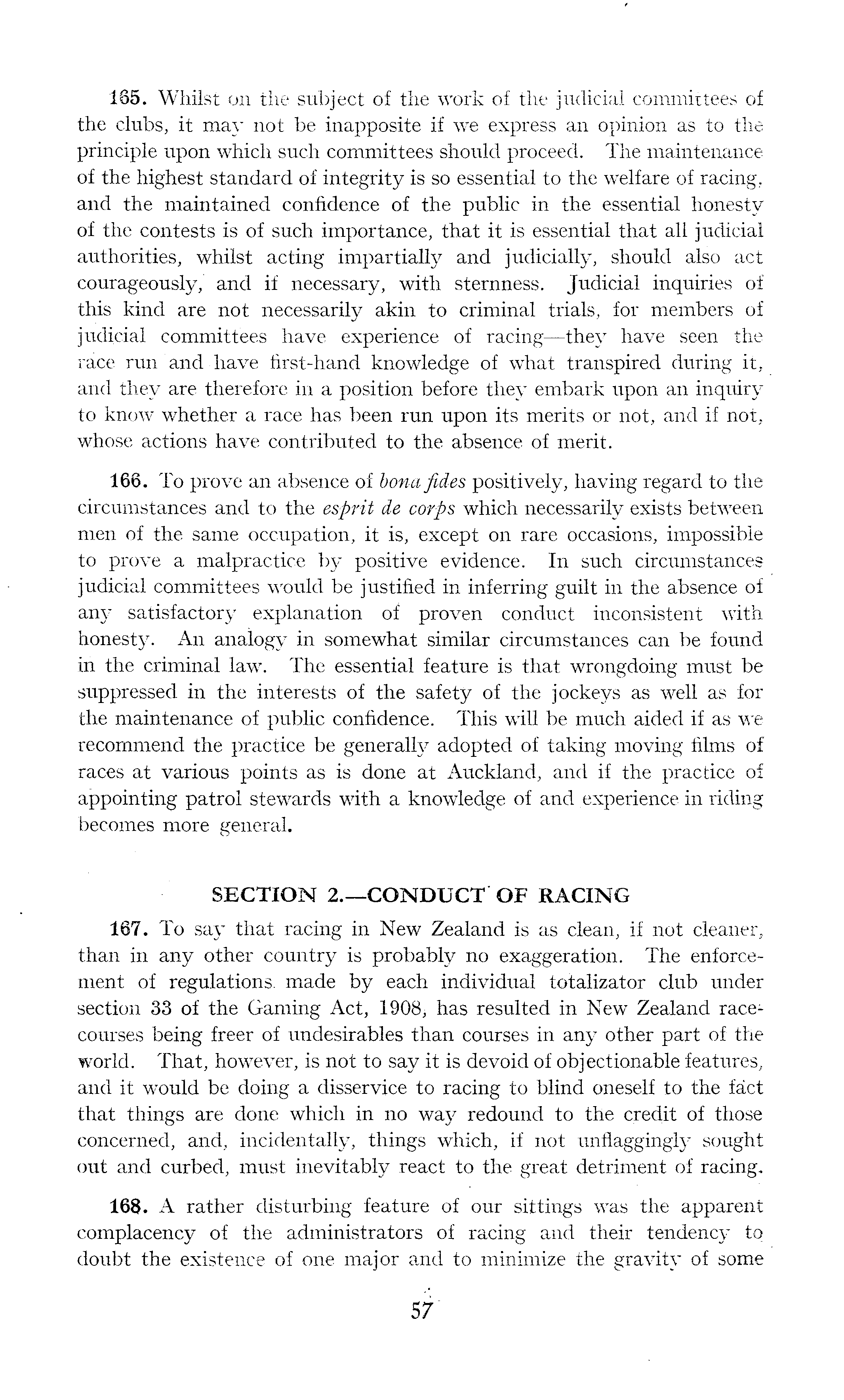 -165. Whilst on the subject of the work of the judicial committees of the clubs, it may not be inapposite if we express an opinion as to the principle upon which such committees should proceed. The maintenance of the highest standard of integrity is so essential to the welfare of racing, and the maintained confidence of the public in the essential honesty of the contests is of such importance, that it is essential that all judicial authorities, whilst acting impartially and judicially, should also act courageously, and if necessary, with sternness. Judicial inquiries of this kind are not necessarily akin to criminal trials, for members of judicial committees have experience of racing—they have seen the race run and have first-hand knowledge of what transpired during it, and they are therefore in a position before they embark upon an inquiry to know whether a race has been run upon its merits or not, and if not, whose actions have contributed to the absence of merit. 166. To prove an absence of bona fides positively, having regard to the circumstances and to the esprit de corps which necessarily exists between men of the same occupation, it is, except on rare occasions, impossible to prove a malpractice by positive evidence. In such circumstances judicial committees would be justified in inferring guilt in the absence of any satisfactory explanation of proven conduct inconsistent with honesty. An analogy in somewhat similar circumstances can be found in the criminal law. The essential feature is that wrongdoing must be suppressed in the interests of the safety of the jockeys as well as for the maintenance of public confidence. This will be much aided if as we recommend the practice be generally adopted of taking moving films of races at various points as is done at Auckland, and if the practice of appointing patrol stewards with a knowledge of and experience in riding becomes more general. SECTION 2.—CONDUCT OF RACING 167. To say that racing in New Zealand is as clean, if not cleaner, than in any other country is probably no exaggeration. The enforcement of regulations, made by each individual totalizator club under section 33 of the Gaming Act, 1908, has resulted in New Zealand racecourses being freer of undesirables than courses in any other part of the world. That, however, is not to say it is devoid of objectionable features, and it would be doing a disservice to racing to blind oneself to the fact that things are done which in no way redound to the credit of those concerned, and, incidentally, things which, if not unflaggingly sought out and curbed, must inevitably react to the great detriment of racing. 168. A rather disturbing feature of our sittings was the apparent complacency of the administrators of racing and their tendency to doubt the existence of one major and to minimize the gravity of some