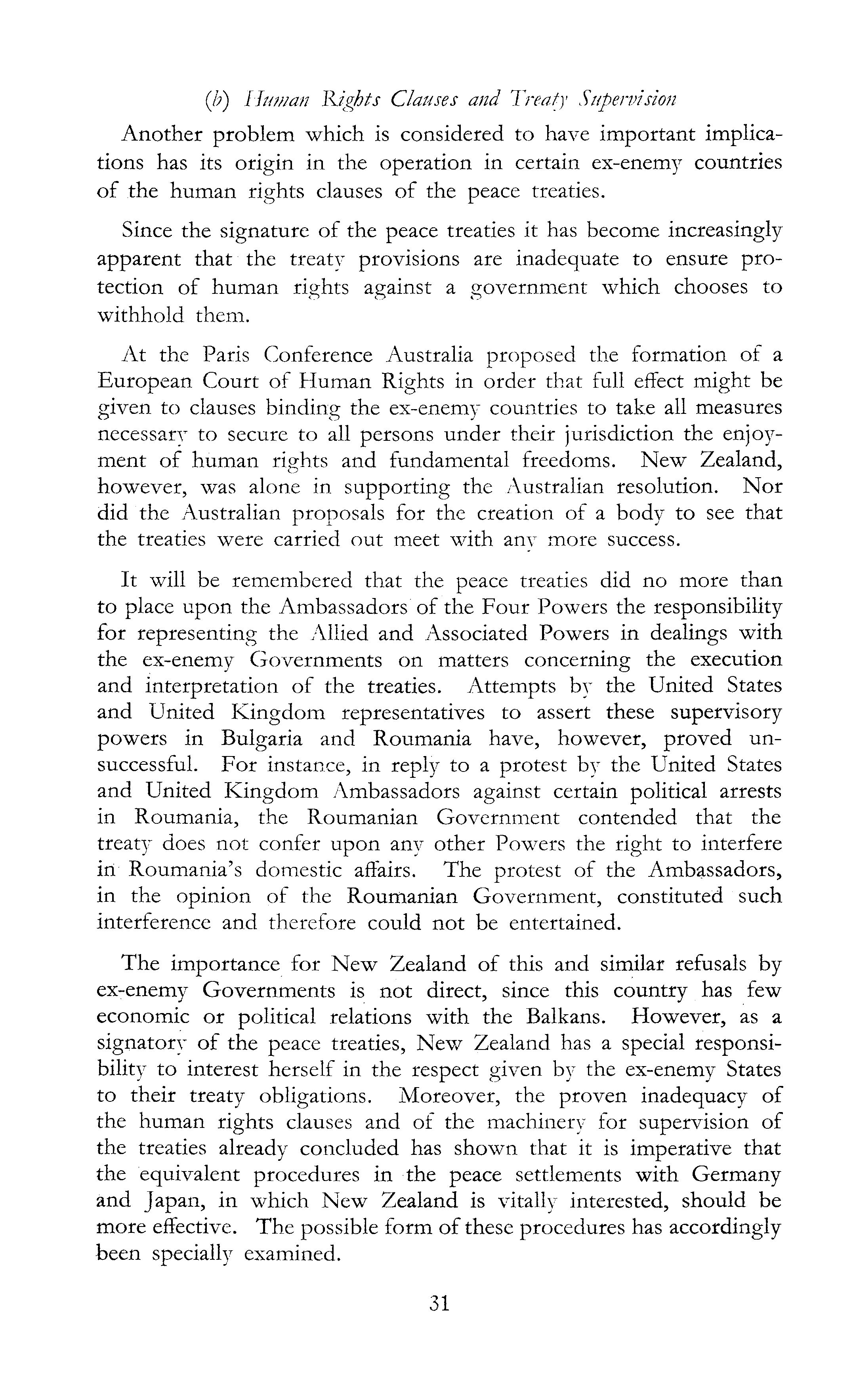 (/?) Human Rights Clauses and Treaty Supervision Another problem which is considered to have important implications has its origin in the operation in certain ex-enemy countries of the human rights clauses of the peace treaties. Since the signature of the peace treaties it has become increasingly apparent that the treaty provisions are inadequate to ensure protection of human rights against a government which chooses to withhold them. At the Paris Conference Australia proposed the formation of a European Court of Human Rights in order that full effect might be given to clauses binding the ex-enemy countries to take all measures necessary to secure to all persons under their jurisdiction the enjoyment of human rights and fundamental freedoms. New Zealand, however, was alone in supporting the Australian resolution. Nor did the Australian proposals for the creation of a body to see that the treaties were carried out meet with any more success. It will be remembered that the peace treaties did no more than to place upon the Ambassadors of the Four Powers the responsibility for representing the Allied and Associated Powers in dealings with the ex-enemy Governments on matters concerning the execution and interpretation of the treaties. Attempts by the United States and United Kingdom representatives to assert these supervisory powers in Bulgaria and Roumania have, however, proved unsuccessful. For instance, in reply to a protest by the United States and United Kingdom Ambassadors against certain political arrests in Roumania, the Roumanian Government contended that the treaty does not confer upon any other Powers the right to interfere in Roumania's domestic affairs. The protest of the Ambassadors, in the opinion of the Roumanian Government, constituted such interference and therefore could not be entertained. The importance for New Zealand of this and similar refusals by ex-enemy Governments is not direct, since this country has few economic or political relations with the Balkans. However, as a signatory of the peace treaties, New Zealand has a special responsibility to interest herself in the respect given by the ex-enemy States to their treaty obligations. Moreover, the proven inadequacy of the human rights clauses and of the machinery for supervision of the treaties already concluded has shown that it is imperative that the equivalent procedures in the peace settlements with Germany and Japan, in which New Zealand is vitally interested, should be more effective. The possible form of these procedures has accordingly been specially examined.