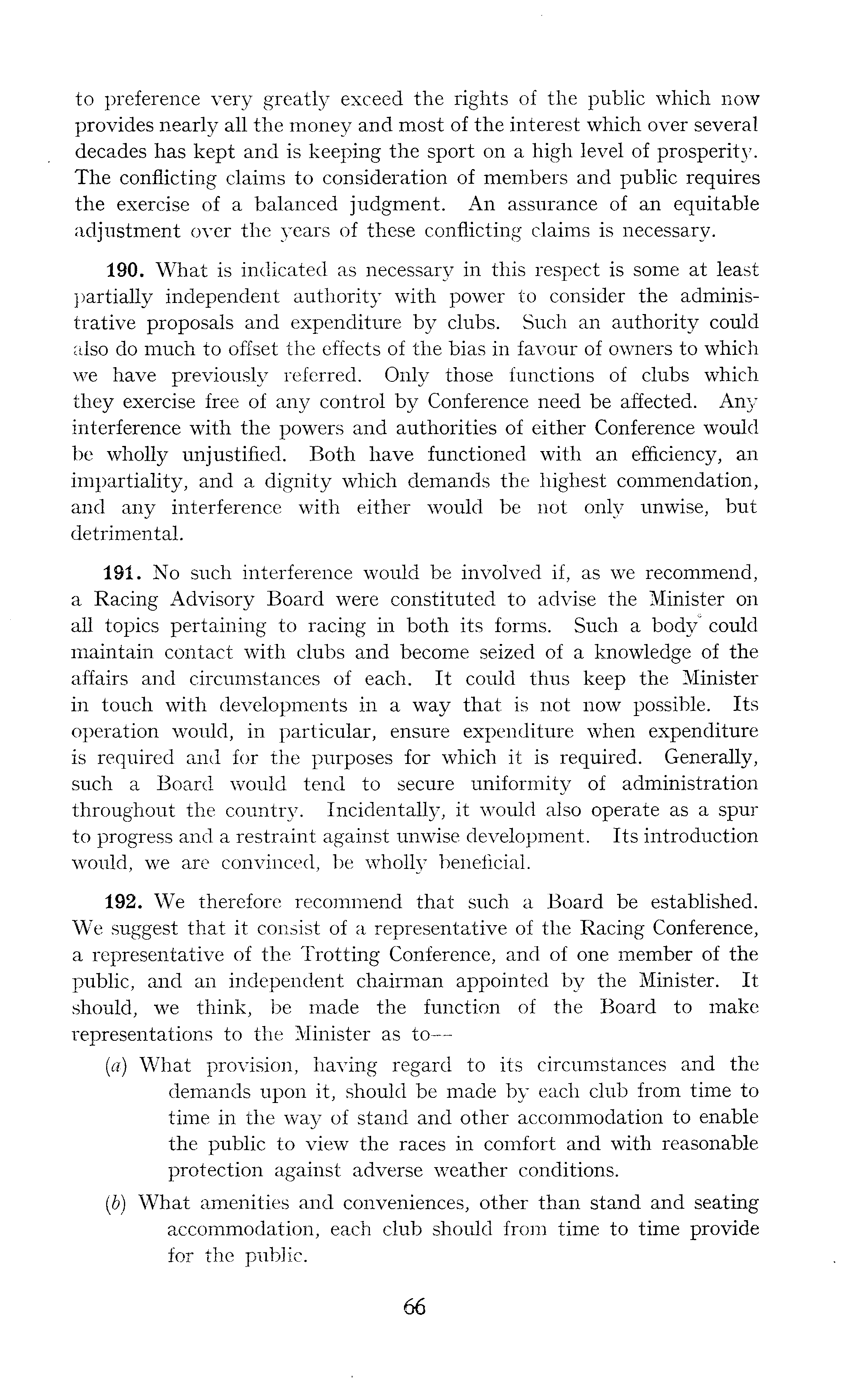to preference very greatly exceed the rights of the public which now provides nearly all the money and most of the interest which over several decades has kept and is keeping the sport on a high level of prosperity. The conflicting claims to consideration of members and public requires the exercise of a balanced judgment. An assurance of an equitable adjustment over the years of these conflicting claims is necessary. 190. What is indicated as necessary in this respect is some at least partially independent authority with power to consider the administrative proposals and expenditure by clubs. Such an authority could also do much to offset the effects of the bias in favour of owners to which we have previously referred. Only those functions of clubs which they exercise free of any control by Conference need be affected. Any interference with the powers and authorities of either Conference would be wholly unjustified. Both have functioned with an efficiency, an impartiality, and a dignity which demands the highest commendation, and any interference with either would be not only unwise, but detrimental. 191. No such interference would be involved if, as we recommend, a Racing Advisory Board were constituted to advise the Minister on all topics pertaining to racing in both its forms. Such a body* could maintain contact with clubs and become seized of a knowledge of the affairs and circumstances of each. It could thus keep the Minister in touch with developments in a way that is not now possible. Its operation would, in particular, ensure expenditure when expenditure is required and for the purposes for which it is required. Generally, such a Board would tend to secure uniformity of administration throughout the country. Incidentally, it would also operate as a spur to progress and a restraint against unwise development. Its introduction would, we are convinced, be wholly beneficial. 192. We therefore recommend that such a Board be established. We suggest that it consist of a representative of the Racing Conference, a representative of the Trotting Conference, and of one member of the public, and an independent chairman appointed by the Minister. It should, we think, be made the function of the Board to make representations to the Minister as to — (а) What provision, having regard to its circumstances and the demands upon it, should be made by each club from time to time in the way of stand and other accommodation to enable the public to view the races in comfort and with reasonable protection against adverse weather conditions. (б) What amenities and conveniences, other than stand and seating accommodation, each club should from time to time provide for the public.