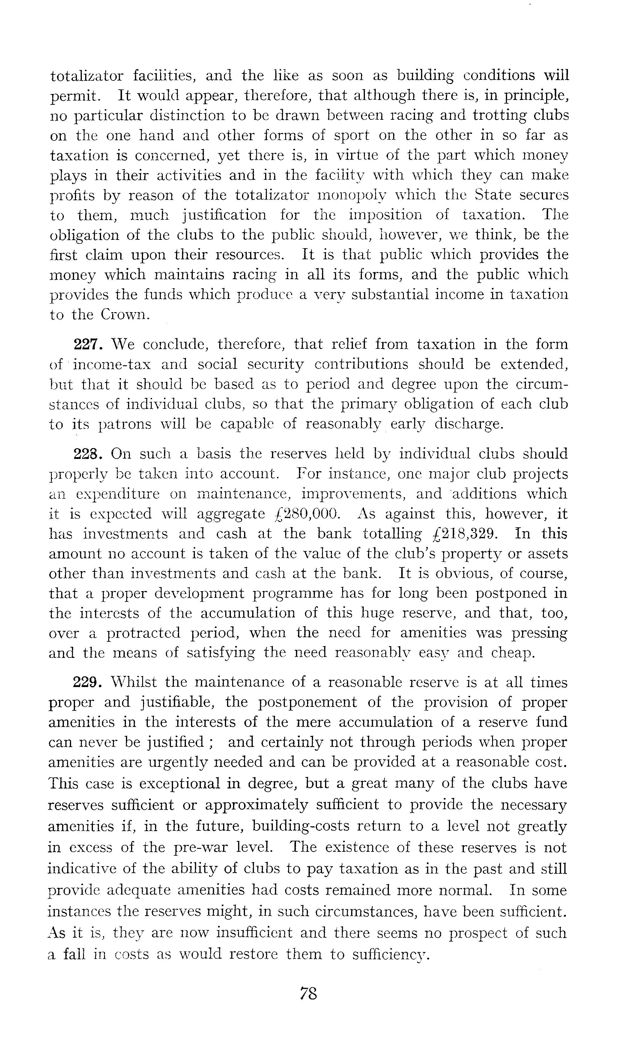 totalizator facilities, and the like as soon as building conditions will permit. It would appear, therefore, that although there is, in principle, no particular distinction to be drawn between racing and trotting clubs on the one hand and other forms of sport on the other in so far as taxation is concerned, yet there is, in virtue of the part which money plays in their activities and in the facility with which they can make profits by reason of the totalizator monopoly which the State secures to them, much justification for the imposition of taxation. The obligation of the clubs to the public should, however, we think, be the first claim upon their resources. It is that public which provides the money which maintains racing in all its forms, and the public which provides the funds which produce a very substantial income in taxation to the Crown. 227. We conclude, therefore, that relief from taxation in the form of income-tax and social security contributions should be extended, but that it should be based as to period and degree upon the circumstances of individual clubs, so that the primary obligation of each club to its patrons will be capable of reasonably early discharge. 228. On such a basis the reserves held by individual clubs should properly be taken into account. For instance, one major club projects an expenditure on maintenance, improvements, and additions which it is expected will aggregate £280,000. As against this, however, it has investments and cash at the bank totalling £218,329. In this amount no account is taken of the value of the club's property or assets other than investments and cash at the bank. It is obvious, of course, that a proper development programme has for long been postponed in the interests of the accumulation of this huge reserve, and that, too, over a protracted period, when the. need for amenities was pressing and the means of satisfying the need reasonably easy and cheap. 229. Whilst the maintenance of a reasonable reserve is at all times proper and justifiable, the postponement of the provision of proper amenities in the interests of the mere accumulation of a reserve fund can never be justified; and certainly not through periods when proper amenities are urgently needed and can be provided at a reasonable cost. This case is exceptional in degree, but a great many of the clubs have reserves sufficient or approximately sufficient to provide the necessary amenities if, in the future, building-costs return to a level not greatly in excess of the pre-war level. The existence of these reserves is not indicative of the ability of clubs to pay taxation as in the past and still provide adequate amenities had costs remained more normal. In some instances the reserves might, in such circumstances, have been sufficient. As it is, they are now insufficient and there seems no prospect of such a fall in costs as would restore them to sufficiency.