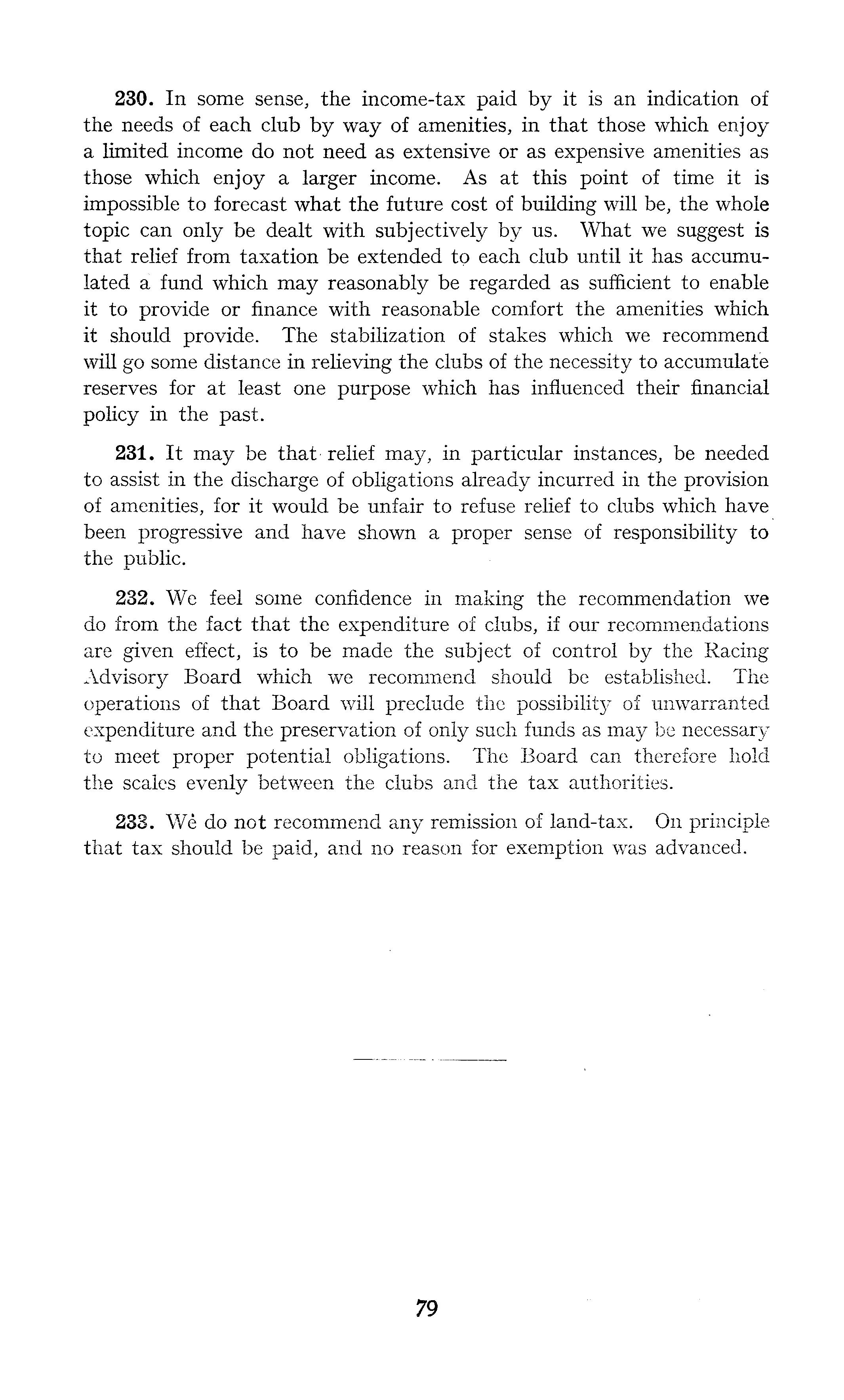 230. In some sense, " the income-tax paid by it is an indication of the needs of each club by way of amenities, in that those which enjoy a limited income do not need as extensive or as expensive amenities as those which enjoy a larger income. As at this point of time it is impossible to forecast what the future cost of building will be, the whole topic can only be dealt with subjectively by us. What we suggest is that relief from taxation be extended to each club until it has accumulated a fund which may reasonably be regarded as sufficient to enable it to provide or finance with reasonable comfort the amenities which it should provide. The stabilization of stakes which we recommend will go some distance in relieving the clubs of the necessity to accumulate reserves for at least one purpose which has influenced their financial policy in the past. 231. It may be that relief may, in particular instances, be needed to assist in the discharge of obligations already incurred in the provision of amenities, for it would be unfair to refuse relief to clubs which have been progressive and have shown a proper sense of responsibility to the public. 232. We feel some confidence in making the recommendation we do from the fact that the expenditure of clubs, if our recommendations are given effect, is to be made the subject of control by the Racing Advisory Board which we recommend should be established. The operations of that Board will preclude the possibility of unwarranted expenditure and the preservation of only such funds as may be necessary to meet proper potential obligations. The Board can therefore hold the scales evenly between the clubs and the tax authorities. 233. We do not recommend any remission of land-tax. On principle that tax should be paid, and no reason for exemption was advanced.