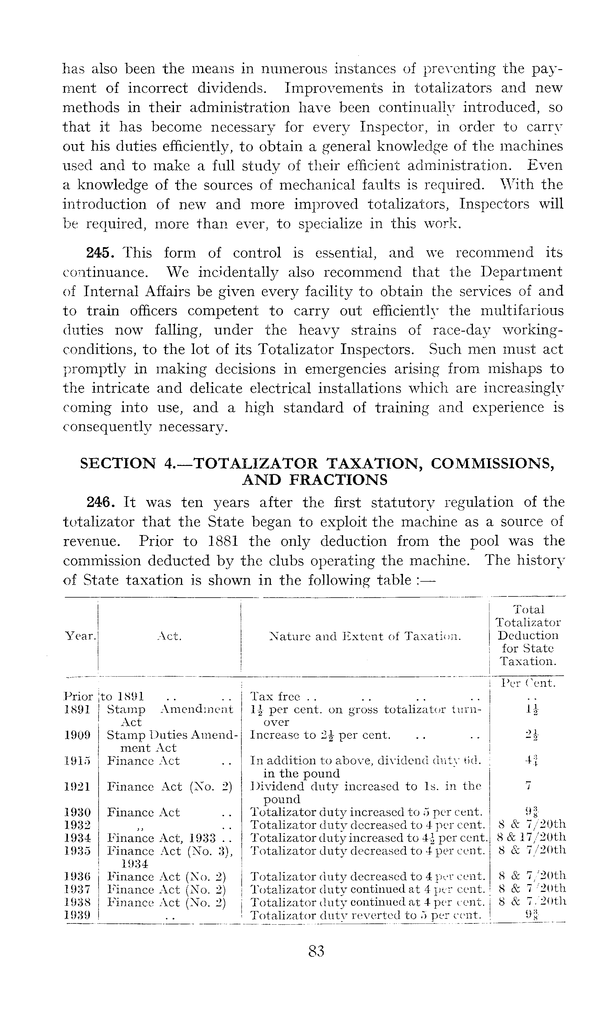 has also been the means in numerous instances of preventing the payment of incorrect dividends. Improvements in totalizators and new methods in their administration have been continually introduced, so that it has become necessary for every Inspector, in order to carry out his duties efficiently, to obtain a general knowledge of the machines used and to make a full study of their efficient administration. Even a knowledge of the sources of mechanical faults is required. With the introduction of new and more improved totalizators, Inspectors will be required, more than ever, to specialize in this work. 245. This form of control is essential, and we recommend its continuance. We incidentally also recommend that the Department of Internal Affairs be given every facility to obtain the services of and to train officers competent to carry out efficiently the multifarious duties now falling, under the heavy strains of race-day workingconditions, to the lot of its Totalizator Inspectors. Such men must act promptly in making decisions in emergencies arising from mishaps to the intricate and delicate electrical installations which are increasingly coming into use, and a high standard of training and experience is consequently necessary. SECTION 4.—TOTALIZATOR TAXATION, COMMISSIONS, AND FRACTIONS 246. It was ten years after the first statutory regulation of the totalizator that the State began to exploit the machine as a source of revenue. Prior to 1881 the only deduction from the pool was the commission deducted by the clubs operating the machine. The history of State taxation is shown in the following table :
