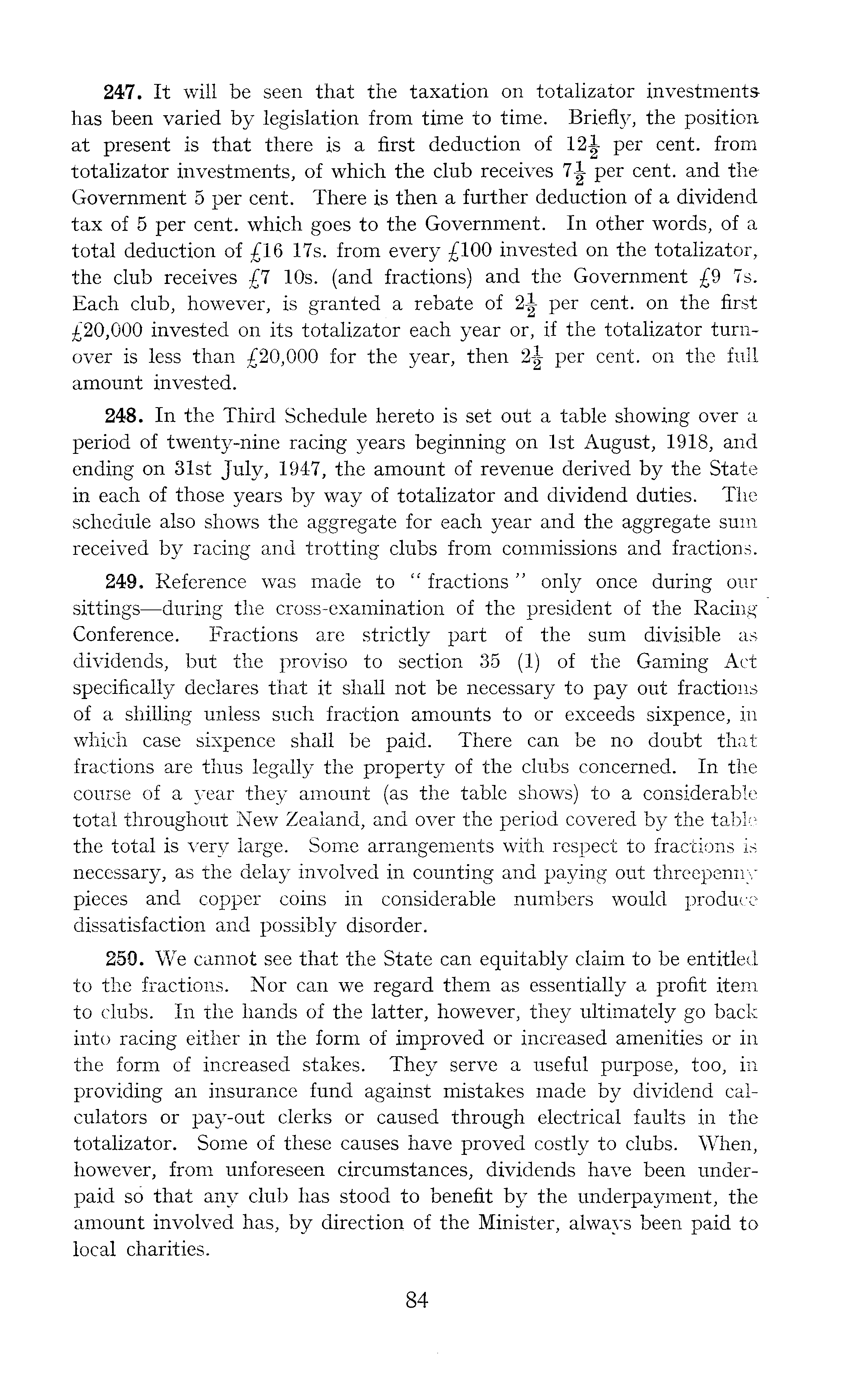 247. It will be seen that the taxation on totalizator investments has been varied by legislation from time to time. Briefly, the position at present is that there is a first deduction of 121 per cent, from totalizator investments, of which the club receives 7|- per cent, and the Government 5 per cent. There is then a further deduction of a dividend tax of 5 per cent, which goes to the Government. In other words, of a total deduction of £l6 17s. from every £lOO invested on the totalizator,, the club receives £7 10s. (and fractions) and the Government £9 7s. Each club, however, is granted a rebate of 2-| per cent, on the first £20,000 invested on its totalizator each year or, if the totalizator turnover is less than £20,000 for the year, then per cent, on the full amount invested. 248. In the Third Schedule hereto is set out a table showing over a period of twenty-nine racing years beginning on Ist August, 1918, and ending on 31st July, 1947, the amount of revenue derived by the State in each of those years by way of totalizator and dividend duties. The schedule also shows the aggregate for each year and the aggregate sum received by racing and trotting clubs from commissions and fractions. 249. Reference was made to " fractions" only once during our sittings —during the cross-examination of the president of the Racing Conference. Fractions are strictly part of the sum divisible as dividends, but the proviso to section 35 (1) of the Gaming Act specifically declares that it shall not be necessary to pay out fractions of a shilling unless such fraction amounts to or exceeds sixpence, in which case sixpence shall be paid. There can be no doubt that fractions are thus legally the property of the clubs concerned. In the course of a year they amount (as the table shows) to a considerable total throughout New Zealand, and over the period covered by the table the total is very large. Some arrangements with respect to fractions is necessary, as the delay involved in counting and paying out threepenny pieces and copper coins in considerable numbers would produce dissatisfaction and possibly disorder. 250. We cannot see that the State can equitably claim to be entitled to the fractions. Nor can we regard them as essentially a profit item to clubs. In the hands of the latter, however, they ultimately go back into racing either in the form of improved or increased amenities or in the form of increased stakes. They serve a useful purpose, too, in providing an insurance fund against mistakes made by dividend calculators or pay-out clerks or caused through electrical faults in the totalizator. Some of these causes have proved costly to clubs. When, hpwever, from unforeseen circumstances, dividends have been underpaid so that any club has stood to benefit by the underpayment, the amount involved has, by direction of the Minister, always been paid to local charities.