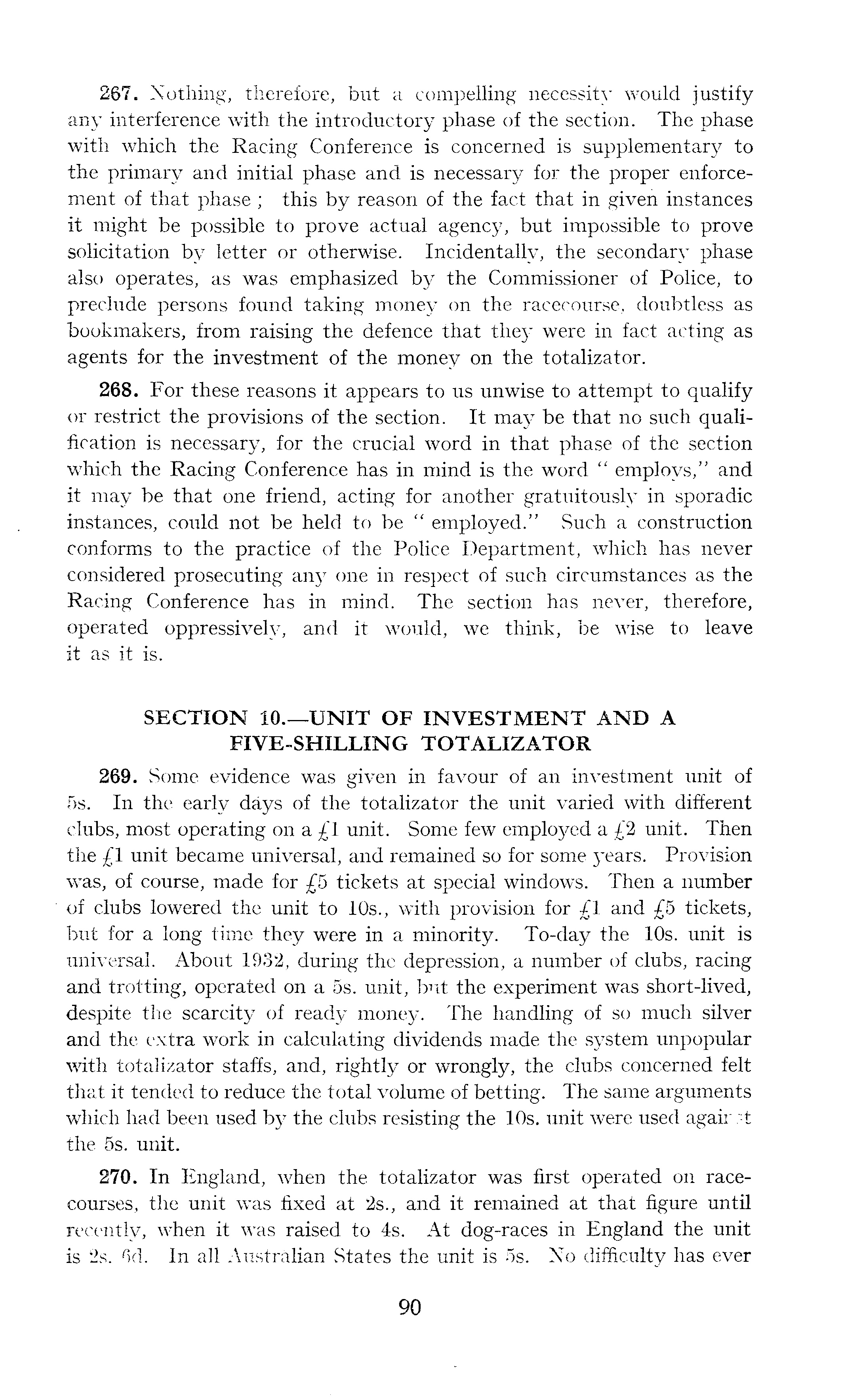 267. Nothing, therefore, but a compelling necessity would justify any interference with the introductory phase of the section. The phase with which the Racing Conference is concerned is supplementary to the primary and initial phase and is necessary for the proper enforcement of that phase ; this by reason of the fact that in given instances it might be possible to prove actual agency, but impossible to prove solicitation by letter or otherwise. Incidentally, the secondary phase also operates, as was emphasized by the Commissioner of Police, to preclude persons found taking money on the racecourse, doubtless as bookmakers, from raising the defence that they were in fact acting as agents for the investment of the money on the totalizator. 268. For these reasons it appears to us unwise to attempt to qualify or restrict the provisions of the section. It may be that no such qualification is necessary, for the crucial word in that phase of the section which the Racing Conference has in mind is the word " employs," and it may be that one friend, acting for another gratuitously in sporadic instances, could not be held to be " employed." Such a construction conforms to the practice of the Police Department, which has never considered prosecuting any one in respect of such circumstances as the Racing Conference has in mind. The section has never, therefore, operated oppressively, and it would, we think, be wise to leave it as it is. SECTION 10.—UNIT OF INVESTMENT AND A FIVE-SHILLING TOTALIZATOR 269. Some evidence was given in favour of an investment unit of ss. In the early days of the totalizator the unit varied with different clubs, most operating on a£l unit. Some few employed a£2 unit. Then the £1 unit became universal, and remained so for some years. Provision was, of course, made for £5 tickets at special windows. Then a number of clubs lowered the unit to 10s., with provision for £1 and £5 tickets, but for a long time they were in a minority. To-day the 10s. unit is universal. About 1932, during the depression, a number of clubs, racing and trotting, operated on a ss. unit, but the experiment was short-lived, despite the scarcity of ready money. The handling of so much silver and the extra work in calculating dividends made the system unpopular with totalizator staffs, and, rightly or wrongly, the clubs concerned felt that it tended to reduce the total volume of betting. The same arguments which had been used by the clubs resisting the 10s. unit were used agair :t the ss. unit. 270. In England, when the totalizator was first operated on racecourses, the unit was fixed at 25., and it remained at that figure until recently, when it was raised to 4s. At dog-races in England the unit is 2s. 6d. In all Australian States the unit is ss. No difficulty has ever