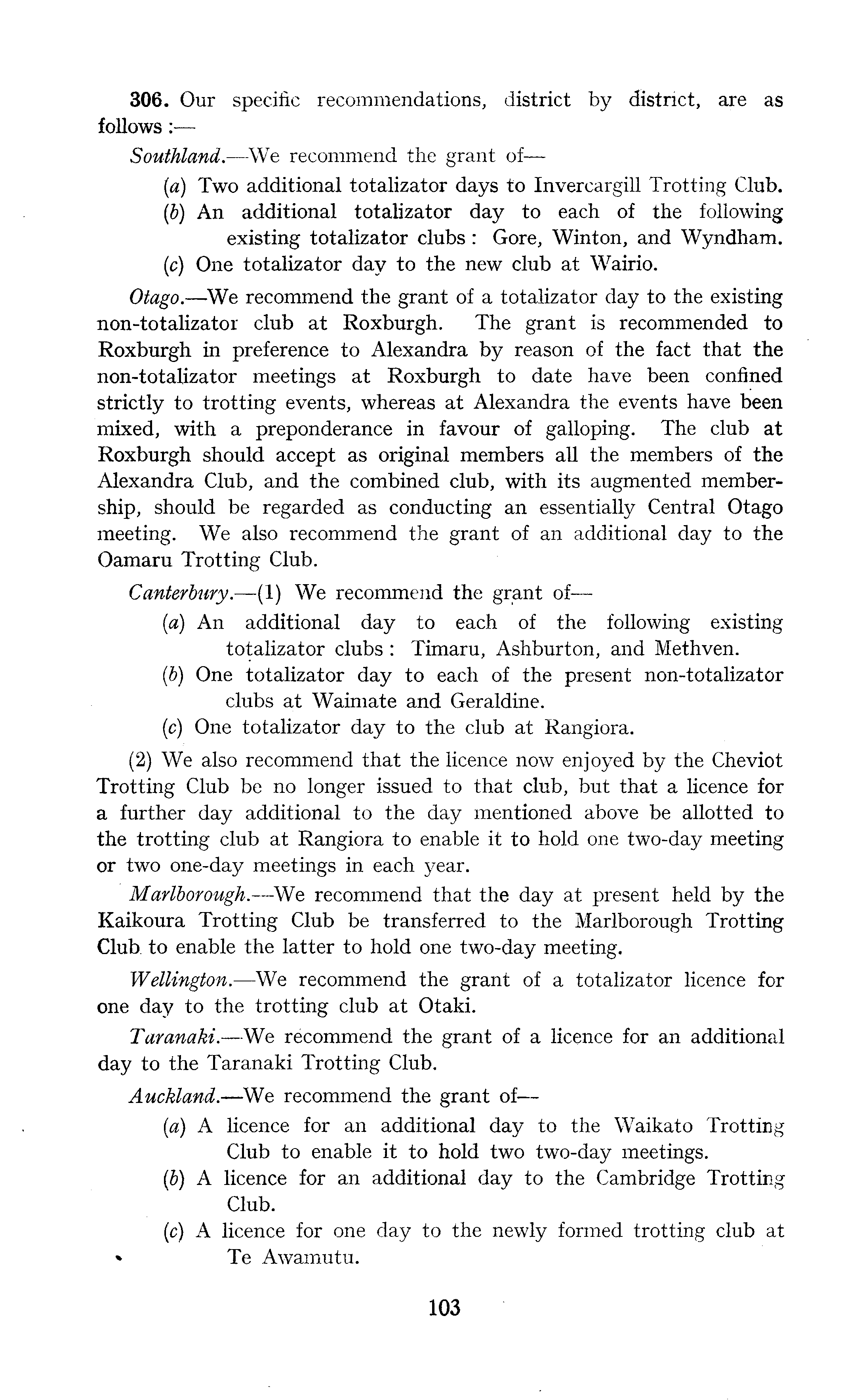 306. Our specific recommendations, district by district, are as follows: Southland.-—We recommend the grant of—(a) Two additional totalizator days to Invercargill Trotting Club. (Ib) An additional totalizator day to each of the following existing totalizator clubs : Gore, Winton, and Wyndham. (c) One totalizator day to the new club at Wairio. Otago.—We recommend the grant of a totalizator day to the existing non-totalizator club at Roxburgh. The grant is recommended to Roxburgh in preference to Alexandra by reason of the fact that the non-totalizator meetings at Roxburgh to date have been confined strictly to trotting events, whereas at Alexandra the events have been mixed, with a preponderance in favour of galloping. The club at Roxburgh should accept as original members all the members of the Alexandra Club, and the combined club, with its augmented membership, should be regarded as conducting an essentially Central Otago meeting. We also recommend the grant of an additional day to the Oamaru Trotting Club. Canterbury.—(l) We recommend the grant of—{a) An additional day to each of the following existing totalizator clubs : Timaru, Ashburton, and Methven. (b) One totalizator day to each of the present non-totalizator clubs at Waimate and Geraldine. (c) One totalizator day to the club at Rangiora. (2) We also recommend that the licence now enjoyed by the Cheviot Trotting Club be no longer issued to that club, but that a licence for a further day additional to the day mentioned above be allotted to the trotting club at Rangiora to enable it to hold one two-day meeting or two one-day meetings in each year. Marlborough.—We recommend that the day at present held by the Kaikoura Trotting Club be transferred to the Marlborough Trotting Club to enable the latter to hold one two-day meeting. Wellington. —We recommend the grant of a totalizator licence for one day to the trotting club at Otaki. Taranaki. —We recommend the grant of a licence for an additional day to the Taranaki Trotting Club. Auckland.—We recommend the grant of—(a) A licence for an additional day to the Waikato Trotting Club to enable it to hold two two-day meetings. (b) A licence for an additional day to the Cambridge Trotting Club. (c) A licence for one day to the newly formed trotting club at » Te Awamutu.