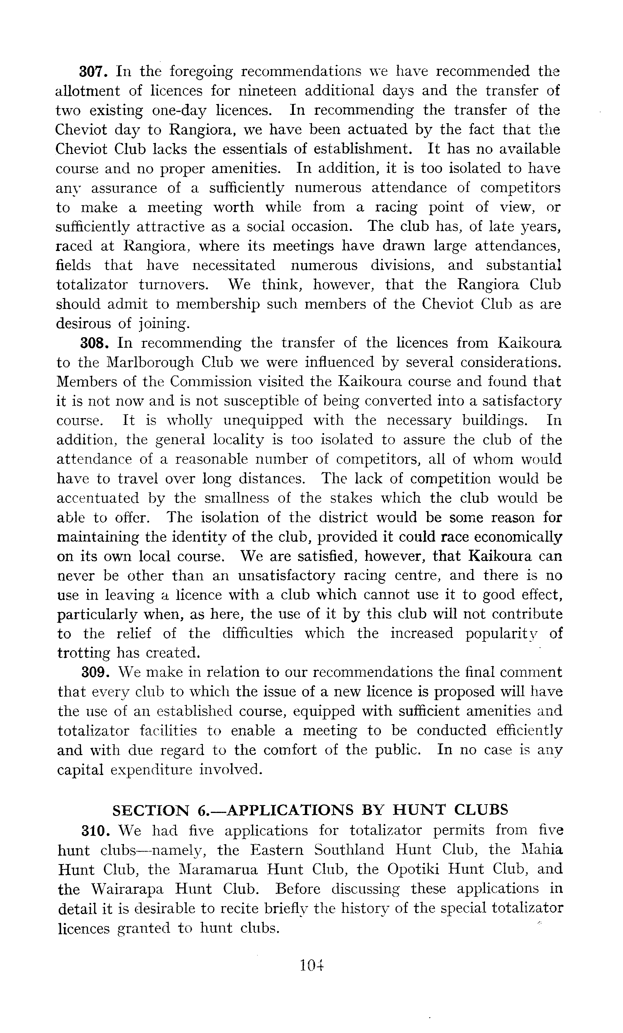 307. In the foregoing recommendations we have recommended the allotment of licences for nineteen additional days and the transfer of two existing one-day licences. In recommending the transfer of the Cheviot day to Rangiora, we have been actuated by the fact that the Cheviot Club lacks the essentials of establishment. It has no available course and no proper amenities. In addition, it is too isolated to have any assurance of a sufficiently numerous attendance of competitors to make a meeting worth while from a racing point of view, or sufficiently attractive as a social occasion. The club has, of late years, raced at Rangiora, where its meetings have drawn large attendances, fields that have necessitated numerous divisions, and substantial totalizator turnovers. We think, however, that the Rangiora Club should admit to membership such members of the Cheviot Club as are desirous of joining. 308. In recommending the transfer of the licences from Kaikoura to the Marlborough Club we were influenced by several considerations. Members of the Commission visited the Kaikoura course and found that it is not now and is not susceptible of being converted into a satisfactory course. It is wholly unequipped with the necessary buildings. In addition, the general locality is too isolated to assure the club of the attendance of a reasonable number of competitors, all of whom would have to travel over long distances. The lack of competition would be accentuated by the smallness of the stakes which the club would be able to offer. The isolation of the district would be some reason for maintaining the identity of the club, provided it could race economically on its own local course. We are satisfied, however, that Kaikoura can never be other than an unsatisfactory racing centre, and there is no use in leaving a licence with a club which cannot use it to good effect, particularly when, as here, the use of it by this club will not contribute to the relief of the difficulties which the increased popularity of trotting has created. 309. We make in relation to our recommendations the final comment that every club to which the issue of a new licence is proposed will have the use of an established course, equipped with sufficient amenities and totalizator facilities to enable a meeting to be conducted efficiently and with due regard to the comfort of the public. In no case is any capital expenditure involved. SECTION 6.—APPLICATIONS BY HUNT CLUBS 310. We had five applications for totalizator permits from five hunt clubs —namely, the Eastern Southland Hunt Club, the Mahia Hunt Club, the Maramarua Hunt Club, the Opotiki Hunt Club, and the Wairarapa Hunt Club. Before discussing these applications in detail it is desirable to recite briefly the history of the special totalizator licences granted to hunt clubs.