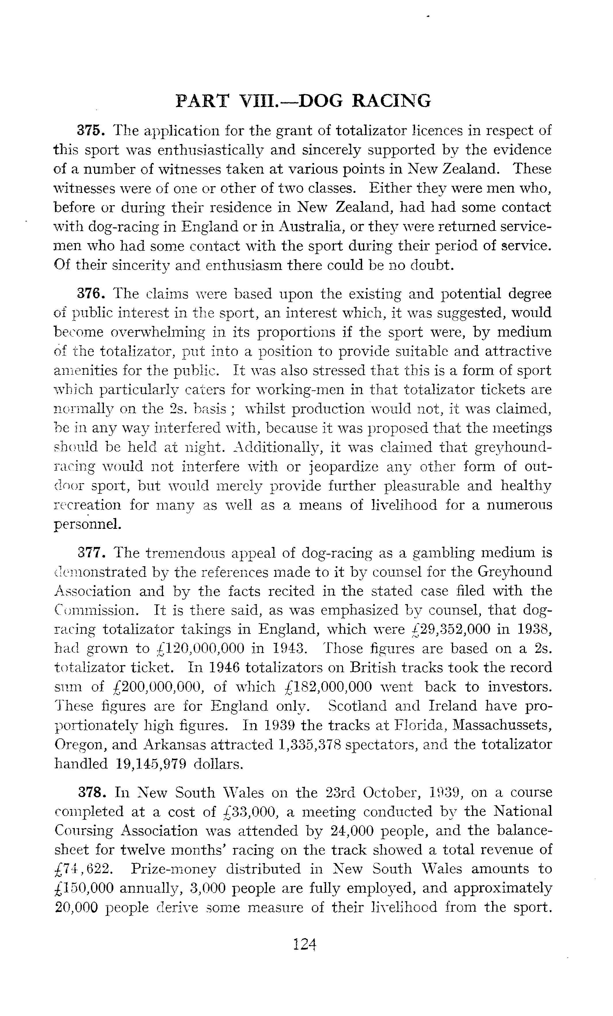 PART VIII.—DOG RACING 375. The application for the grant of totalizator licences in respect of this sport was enthusiastically and sincerely supported by the evidence of a number of witnesses taken at various points in New Zealand. These witnesses were of one or other of two classes. Either they were men who, before or during their residence in New Zealand, had had some contact with dog-racing in England or in Australia, or they were returned servicemen who had some contact with the sport during their period of service. Of their sincerity and enthusiasm there could be no doubt. 376. The claims were based upon the existing and potential degree of public interest in the sport, an interest which, it was suggested, would become overwhelming in its proportions if the sport were, by medium of the totalizator, put into a position to provide suitable and attractive amenities for the public. It was also stressed that this is a form of sport which particularly caters for working-men in that totalizator tickets are normally on the 2s. basis ; whilst production would not, it was claimed, be in any way interfered with, because it was proposed that the meetings should be held at night. Additionally, it was claimed that greyhoundracing would not interfere with or jeopardize any other form of outdoor sport, but would merely provide further pleasurable and healthy recreation for many as well as a means of livelihood for a numerous personnel. 377. The tremendous appeal of dog-racing as a gambling medium is demonstrated by the references made to it by counsel for the Greyhound Association and by the facts recited in the stated case filed with the Commission. It is there said, as was emphasized by counsel, that dogracing totalizator takings in England, which were £29,352,000 in 1938, had grown to £120,000,000 in 1943. Those figures are based on a 2s. totalizator ticket. In 1946 totalizators on British tracks took the record sum of £200,000,000, of which £182,000,000 went back to investors. These figures are for England only. Scotland and Ireland have proportionately high figures. In 1939 the tracks at Florida, Massachussets, Oregon, and Arkansas attracted 1,335,378 spectators, and the totalizator handled 19,145,979 dollars. 378. In New South Wales on the 23rd October, 1939, on a course completed at a cost of £33,000, a meeting conducted by the National Coursing Association was attended by 24,000 people, and the balancesheet for twelve months' racing on the track showed a total revenue of £74,622. Prize-money distributed in New South Wales amounts to £150,000 annually, 3,000 people are fully employed, and approximately 20,000 people derive some measure of their livelihood from the sport.