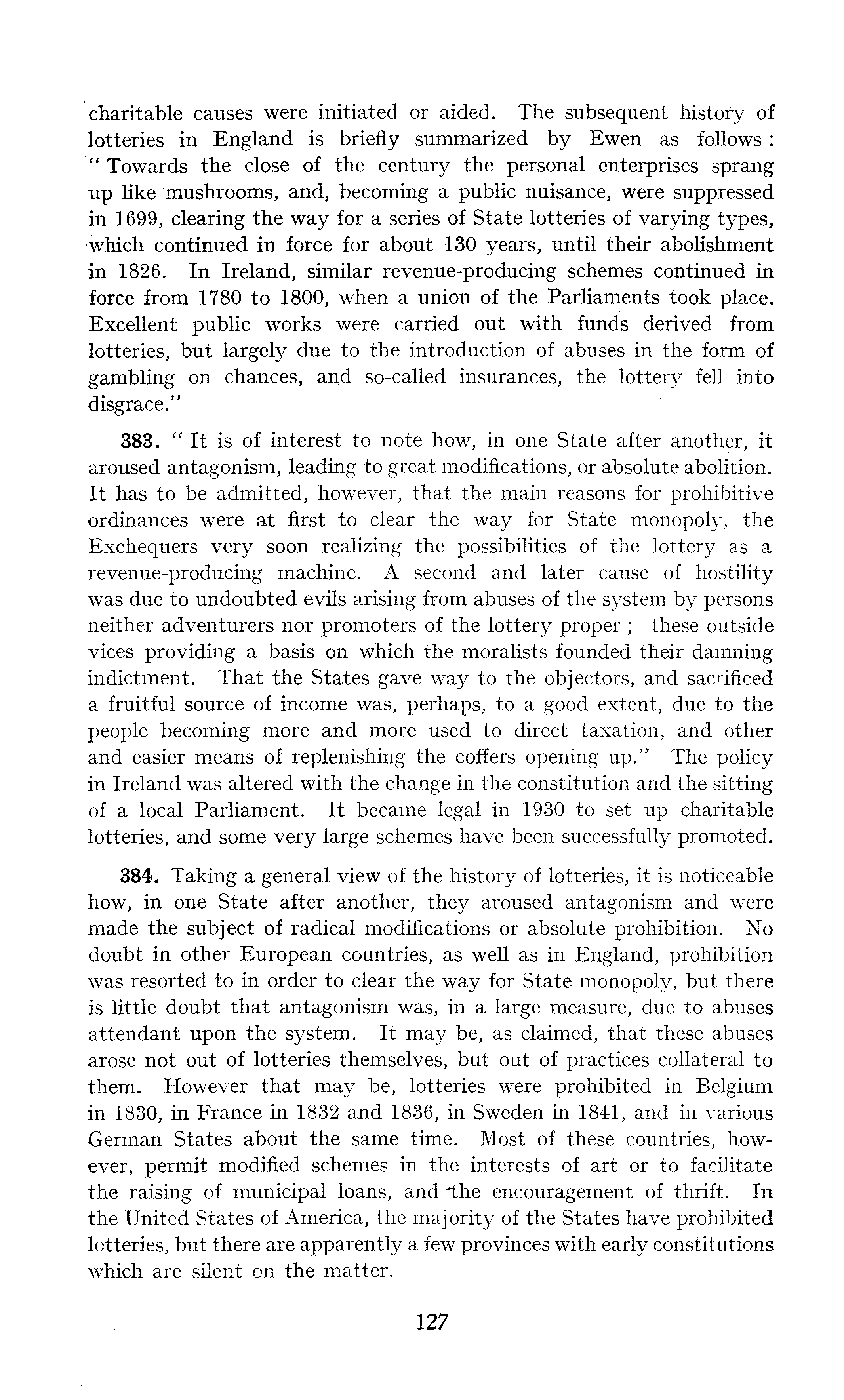 charitable causes were initiated or aided. The subsequent history of lotteries in England is briefly summarized by Ewen as follows : "Towards the close of.the century the personal enterprises sprang up like mushrooms, and, becoming a public nuisance, were suppressed in 1699, clearing the way for a series of State lotteries of varying types, which continued in force for about 130 years, until their abolishment in 1826. In Ireland, similar revenue-producing schemes continued in force from 1780 to 1800, when a union of the Parliaments took place. Excellent public works were carried out with funds derived from lotteries, but largely due to the introduction of abuses in the form of gambling on chances, and so-called insurances, the lottery fell into disgrace." 383. "It is of interest to note how, in one State after another, it aroused antagonism, leading to great modifications, or absolute abolition. It has to be admitted, however, that the main reasons for prohibitive ordinances were at first to clear the way for State monopoly, the Exchequers very soon realizing the possibilities of the lottery as a revenue-producing machine. A second and later cause of hostility was due to undoubted evils arising from abuses of the system by persons neither adventurers nor promoters of the lottery proper ; these outside vices providing a basis on which the moralists founded their damning indictment. That the States gave way to the objectors, and sacrificed a fruitful source of income was, perhaps, to a good extent, due to the people becoming more and more used to direct taxation, and other and easier means of replenishing the coffers opening up." The policy in Ireland was altered with the change in the constitution and the sitting of a local Parliament. It became legal in 1930 to set up charitable lotteries, and some very large schemes have been successfully promoted. 384. Taking a general view of the history of lotteries, it is noticeable how, in one State after another, they aroused antagonism and were made the subject of radical modifications or absolute prohibition. No doubt in other European countries, as well as in England, prohibition was resorted to in order to clear the way for State monopoly, but there is little doubt that antagonism was, in a large measure, due to abuses attendant upon the system. It may be, as claimed, that these abases arose not out of lotteries themselves, but out of practices collateral to them. However that may be, lotteries were prohibited in Belgium in 1830, in France in 1832 and 1836, in Sweden in 1841, and in various German States about the same time. Most of these countries, however, permit modified schemes in the interests of art or to facilitate the raising of municipal loans, and ~the encouragement of thrift. In the United States of America, the majority of the States have prohibited lotteries, but there are apparently a few provinces with early constitutions which are silent on the matter.