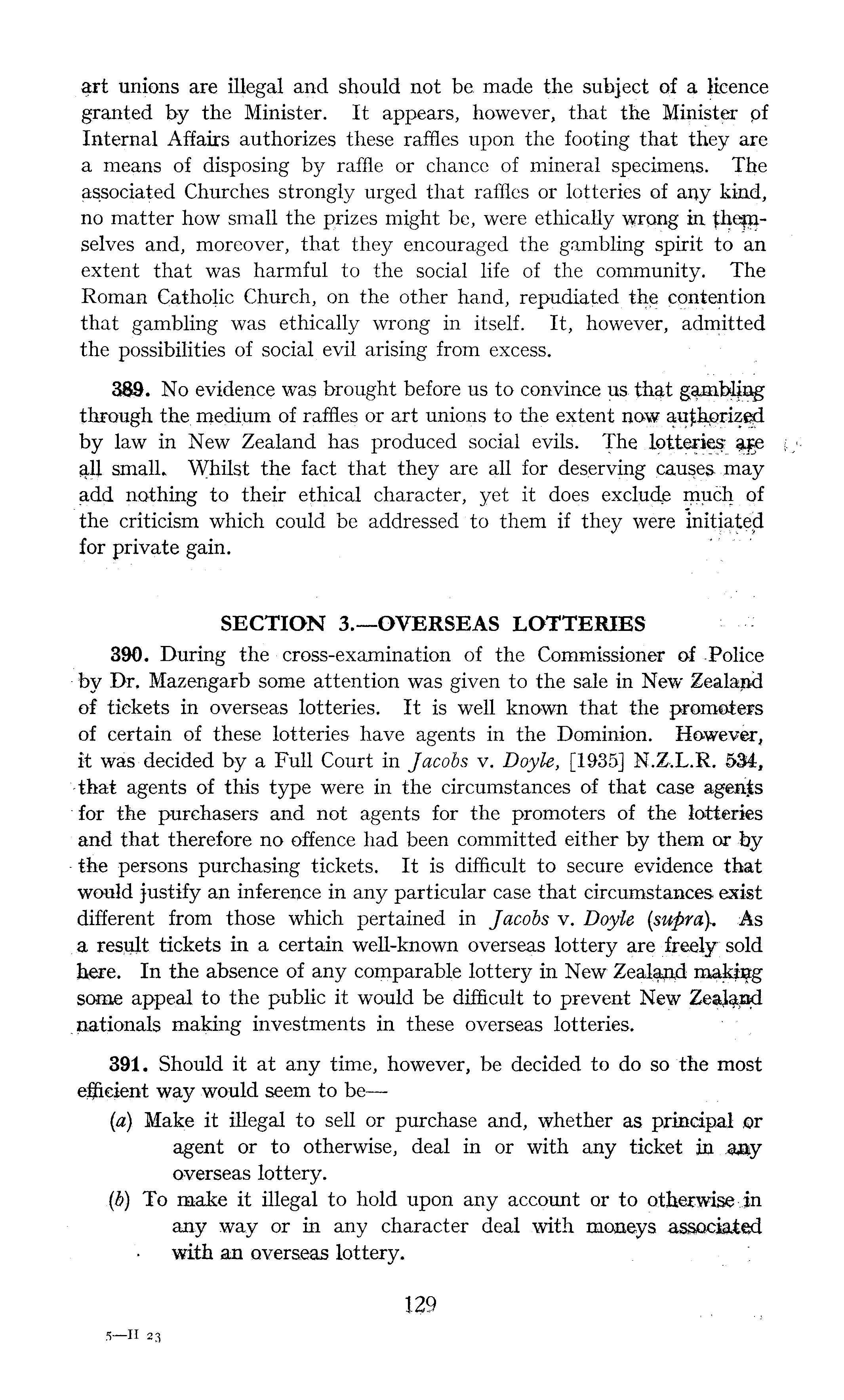 art unions are illegal and. should not be made the subject of a licence granted by the Minister. It appears, |ioweyer, that the. lsini§ter pf Interpal Affairs authorizes these raffles upon the footing that they gxe a means of disposing by raffle or chance of mineral specimens. The associated Churches strongly urged that raises or lotteries of any kind, no matter how small the prizes might be, were ethically wrqiig in |l}ejs- - and, moreover, that they encouraged the gambling spirit to an extent that was harmful to the social life of the community. The Roman Catholic SJrnrch, on the other hand, repudiated. t}i ( e ppntefition that gambling was ethically wrong in itself. It, however, admitted the possibilities of social, evil arising from excess. 389. No evidence was brought before us to convince us th&t through the medium of raffles or art unions to the extent ijow by law in New Zealand has produced social evils. The §ge ah smq.ll. Whil§t the fact that they are all for deserving causes may 3,d4 nothing to their epical character, yet it does exclude much of the criticism which could be addressed to them if they were initiated for private gain. SECTION 3.—OVERSEAS LOTTERIES 390. During the cross-examination of the Commissioner of -Police by Dr. Mazengarb some attention was given to the sale in New Zealand of tickets in overseas lotteries. It is well known that the promoters of certain of these lotteries have agents in the Dominion. However, it was decided by a Full Court in Jacobs v. Doyle, [I&3SJ N.Z.L.R. 534, •that agents of this type were in the circumstances of that case agents for the purchasers and not agents for the promoters of the lotteries and that therefore no offence had been committed either by them orby the persons purchasing tickets. It is difficult to secure evidence that would justify an inference in any particular case that circumstances, exist different from those which pertained in Jacobs v. Doyle (supra}. 'As a result tickets in a certain well-known overseas lottery are freely sold here. In the absence of any comparable lottery in New making some appeal to the public it would be difficult to prevent New Zealand nationals making investments in these overseas lotteries. 391. Should it at any time, however, be decided to do so the most efficient way would seem to be—(a) Make it illegal to sell or purchase and, whether as principal or agent or to otherwise, deal in or with any ticket in ajay overseas lottery. ,(s>) To make it illegal to hold upon any account or to otherwise in any way or in any character deal .with moneys associated with an overseas lottery.