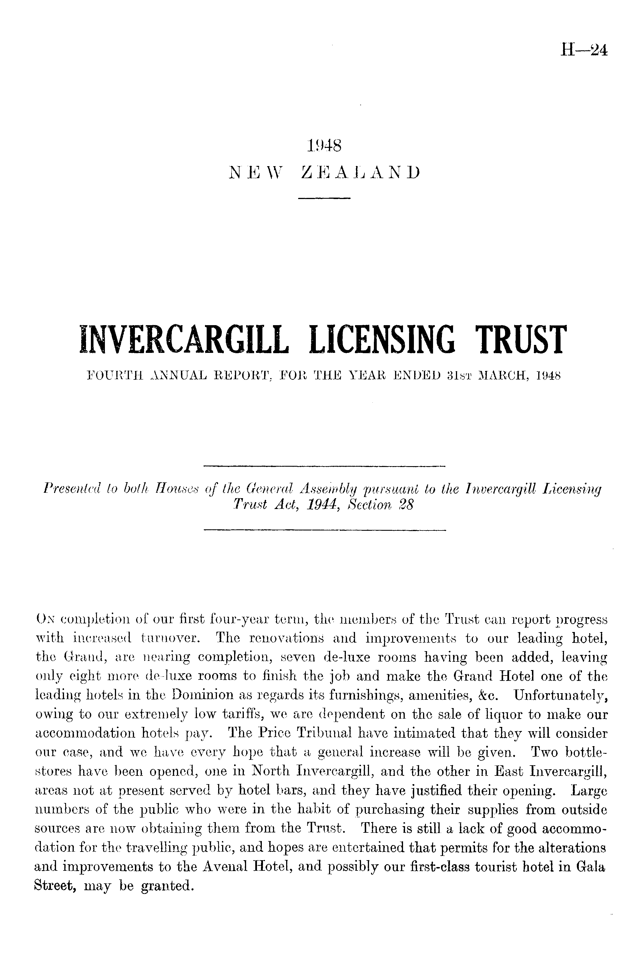 Presented to both Houses of the General Assembly 'pursuant to the Invercargill Licensing Trust Act, 19M, Section 28