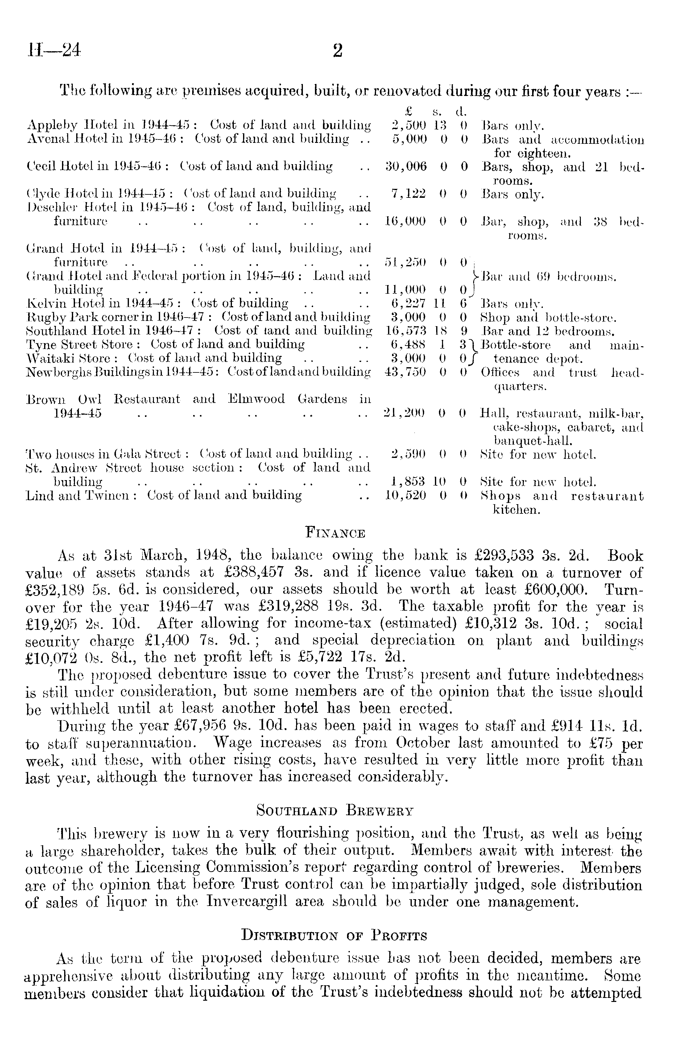 The following are premises acquired, built, or renovated during our first four years £ s. d. Appleby Hotel in 1944-45 : Cost of land and building 2,500 13 0 Bars only. A venal Hotel in 1945-46 : Cost of land and building .. 5,000 0 0 Bars and accommodation for eighteen. Cecil Hotel in 1945-46 : Cost of land and building .. 30,006 0 0 Bars, shop, and 21 bedrooms. Clyde Hotel in 1944-45 : Cost of land and building .. 7,122 0 0 Bars only. Deschler Hotel in 1945-46 : Cost of land, building, and furniture .. .. .. .. .. 16,000 0 0 Bar, shop, and 38 bedrooms. Grand Hotel in 1944-45 : Cost of land, building, and furniture .. .. .. .. .. 51,250 0 0) Grand Hotel and Federal portion in 1945-46 : Land and and 69 bedrooms. building .. .. .. .. .. 11,000 0 0J Kelvin Hotel in 1944-45 : Cost of building .. .. 6,227 11 6 Bars only. Rugby Park corner in 1946-47 : Cost of land and building 3,000 0 0 Shop and bottle-store. Southland Hotel in 1946-47 : Cost of land and building 16,573 18 9 Bar and 12 bedrooms. Tyne Street Store : Cost of land and building .. 6,488 1 3 \ Bottle-store and mainWaitaki Store : Cost of land and building .. . . 3,000 0 0j tenance depot. Newberghs Buildings in 1944-45: Cost of land and building 43,750 0 0 Offices and trust headquarters. Brown Owl Restaurant and Elmwood Gardens in 1944-45 .. .. .. .. .. 21,200 0 0 Hall, restaurant, milk-bar, cake-shops, cabaret, and banquet-hall. Two houses in Gala Street: Cost of land and building .. 2,590 0 0 Site for new hotel. St. Andrew Street house section : Cost of land and building .. .. .. .. .. 1,853 10 0 Site for new hotel. Lind and Twinen : Cost of land and building .. 10,520 0 0 Shops and restaurant kitchen. Finance As at 31st March, 1948, the balance owing the bank is £293,533 3s. 2d. Book value of assets stands at £388,457 3s. and if licence value taken on a turnover of £352,189 ss. 6d. is considered, our assets should be worth at least £600,000. Turnover for the year 1946-47 was £319,288 19s. 3d. The taxable profit for the year is £19,205 2s. lOd. After allowing for income-tax (estimated) £10,312 3s. lOd. ; social security charge £1,400 7s. 9d.; and special depreciation on plant and buildings £10,072 os. Bd., the net profit left is £5,722 17s. 2d. The proposed debenture issue to cover the Trust's present and future indebtedness is still under consideration, but some members are of the opinion that the issue should be withheld until at least another hotel has been erected. During the year £67,956 9s. lOd. has been paid in wages to staff and £914 lis. Id. to staff superannuation. Wage increases as from October last amounted to £75 per week, and these, with other rising costs, have resulted in very little more profit than last year, although the turnover has increased considerably. Southland Brewery This brewery is now in a very flourishing position, and the Trust, as well as being a large shareholder, takes the bulk of their output. Members await with interest the outcome of the Licensing Commission's report regarding control of breweries. Members are of the opinion that before Trust control can be impartially judged, sole distribution of sales of liquor in the Invereargill area should be under one management. Distribution of Profits As the term of the proposed debenture issue has not been decided, members are apprehensive about distributing any large amount of profits in the meantime. Some members consider that liquidation of the Trust's indebtedness should not be attempted