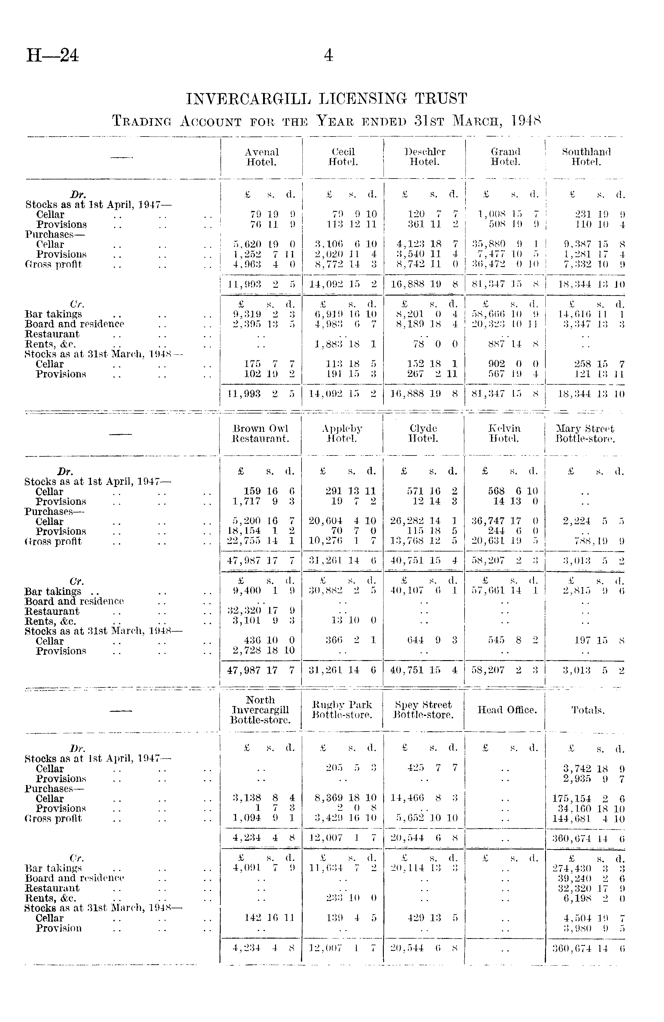 — Avenal Hotel. Cecil Hotel. Deschler Hotel. Grand Hotel. Southland Hotel. Dr. Stocks as at 1st April, 1947 — Cellar Provisions Purchases — Cellar Provisions Gross profit Cr. Bar takings .. .. Board and residence Restaurant Rents, &c. Stocks as at 31st March, 1948— Cellar Provisions £ s. d. 79 19 9 76 11 9 5,620 19 0 1,252 7 11 4,963 4 0 £ s. d. 79 9 10 113 12 11 3,106 6 10 2,020 11 4 8,772 14 3 £ s. d. 120 7 7 361 11 2 4,123 18 7 3,540 11 4 8,742 11 0 £ s. d. 1,008 15 7 508 19 9 35,880 9 1 7,477 10 5 36,472 0 10 £ s. d. 231 19 9 110 10 4 9,387 15 8 1,281 17 4 7,332 10 9 11,993 2 5 14,092 15 2 16,888 19 8 81,347 15 8 18,344 13 10 £ s. d. 9,319 2 3 2,395 13 5 175 7 7 102 19 2 £ s. d. 6,919 16 10 4,983 6 7 1,883 18 1 113 18 5 191 15 3 £ s. d. 8,201 0 4 8,189 18 4 78' 0 0 152 18 1 267 2 11 £ s. d. 58,666 10 9 20,323 10 11 887'14 8 902 0 0 567 19 4 £ s. d. 14,616 11 1 3,347 13 3 258 15 7 121 13 11 11,993 2 5 14,092 15 2 16,888 19 8 81,347 15 8 18,344 13 10 Brown Owl Restaurant. Appleby Hotel. Clyde Hotel. Kelvin Hotel. Mary Street Bottle-store. Dr. Stocks as at 1st April, 1947 — Cellar Provisions Purchases — Cellar Provisions Gross profit Cr. Bar takings Board ana residence Restaurant Rents, &c. Stocks as at 31st March, 1948— Cellar Provisions £ s. d. 159 16 6 1,717 9 3 5,200 16 7 18,154 1 2 22,755 14 1 £ s. d. 291 13 11 19 7 2 20,604 4 10 70 7 0 10,276 1 7 £ s. d. 571 16 2 12 14 3 26,282 14 1 115 18 5 13,768 12 5 £ s. d. 568 6 10 14 13 0 36,747 17 0 244 6 0 20,631 19 5 £ s. d. 2,224 5 5 788,19 9 47,987 17 7 31,261 14 6 40,751 15 4 58,207 2 3 3,013 5 2 £ s. d. 9,400 1 9 32,320 17 9 3,101 9 3 436 10 0 2,728 18 10 £ s. d. 30,882 2 5 1310 0 366 2 1 £ s. d. 40,107 6 1 644 9 3 £ s. d. 57,661 14 1 545 8 2 £ s. d. 2,815 9 6 197 15 8 47,987 17 7 31,261 14 6 40,751 15 4 58,207 2 3 3,013 5 2 North Invercargill Bottle-store. Rugby Park Bottle-store. Spey Street Bottle-store. Head Office. Totals. Dr. Stocks as at 1st April, 1947 — Cellar Provisions Purchases — Cellar Provisions Gross profit Cr. Bar takings Board and residence .. Restaurant Rents, &c. Stocks as at 31st March, 1948 — Cellar Provision £ s. d. 3,138 8 4 17 3 1,094 9 1 £ s. d. 205 5 3 8,369 18 10 2 0 8 3,429 16 10 £ s. d. 425 7 7 14,466 8 3 5,65210 10 £ s. d. £ s. d. 3,742 18 9 2,935 9 7 175,154 2 6 34,160 18 10 144,681 4 10 4,234 4 8 12,007 1 7 20,544 6 8 360,674 14 6 £ s. d. 4,091 7 9 142 16 11 £ s. d. 11,634 7 2 233 10 0 139 4 5 £ s. d. 20,114 13 3 429 13 5 £ s. d. £ s. d. 274,430 3 3 39,240 2 6 32,320 17 9 6,198 2 0 4,504 19 7 3,980 9 5 4,234 4 8 12,007 1 7 20,544 6 8 360,674 14 6