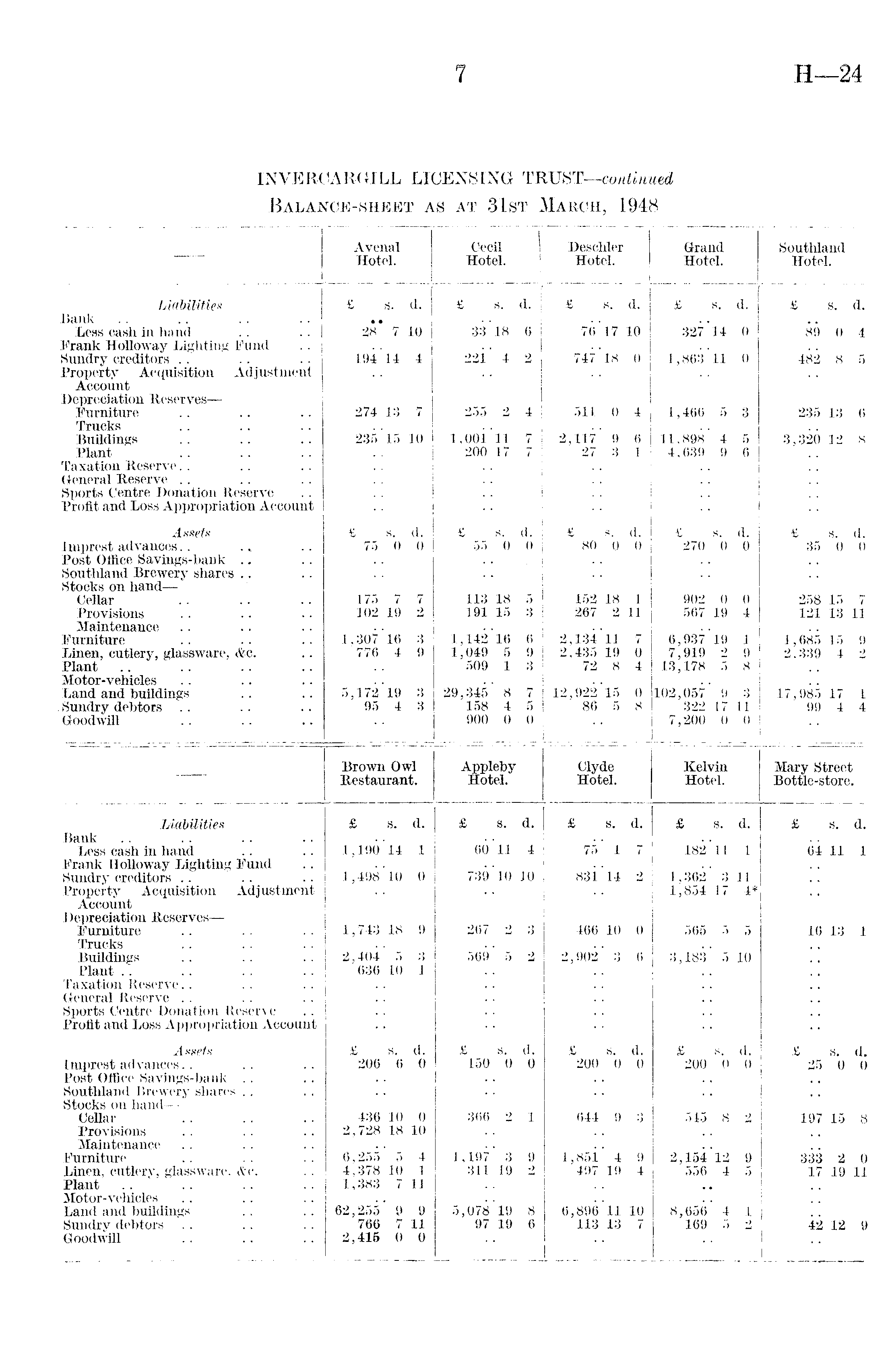 Avenal Cecil 1 Deschler Grand Southland Hotel. Hotel. Hotel. Hotel. Hotel. Liabilities £ s. d. £ s. d. £ s. d. £ s. d. £ s. d. Bank ., Less cash in hand 28 7 10 33 18 6 76'l7 10 327 14 0 89 0 4 Frank Holloway Lighting Fund Sundry creditors 194 14 4 221. 4 2 747 18 0 1,863 11 0 482 8 5 Property Acquisition Adjustment Account Depreciation Reserves— Furniture 274 13 7 255 2 4 511 0 4 1,466 5 3 235 13 6 Trucks Buildings 235'15 10 i,ooi'n 7 2,117' 9 6 11,898 4 5 3,320 12 8 Plant 200 17 7 27 3 1 4,639 9 6 Taxation Reserve. . General Reserve Sports Centre Donation Reserve Profit and Loss Appropriation Account Assets £ s. d. £ s. d. £ s. d. £ s. d. £ s. d. Imprest advances 75 0 0 55 0 0 80 0 0 270 0 0 35 0 0 Post Office Savings-bank Southland Brewery shares Stocks on hand — Cellar 175 7 7 113 18 5 152 18 1 902 0 0 258 15 7 Provisions 102 19 2 191 15 3 267 2 11 567 19 4 121 13 11 Maintenance Furniture 1,30716 3 1,14216 6 2,134 11 . 7 6,93719 1 1,685 15 9 Linen, cutlery, glassware, <fcc. 776 4 9 1,049 5 9 2,435 19 0 7,919 2 9 2,339 4 2 Plant 509 1 3 72 8 4 13,178 5 8 Motor-vehicles Land and buildings 5,172 19 3 29,345' 8 7 12,92215 0 102,057' 9 3 17,985 17 1 Sundry debtors 95 4 3 158 4 5 86 5 8 322 17 11 99 4 4 Goodwill 900 0 0 1 7,200 0 0 Brown Owl Appleby Clyde Kelvin Mary Street Restaurant. Hotel. Hotel. Hotel. Bottle-store. Liabilities £ s. d. £ s. d. £ s. d. £ s. d. £ s. d. Bank Less cash in hand 1,19014 1 6011 4 75 1 7 182 11 1 64 11 1 Frank Holloway Lighting Fund Sundry creditors ■1,498 10 0 739'10 10 831. 14 2 1,362' 3 11 Property Acquisition Adjustment 1,854 17 4* Account Depreciation Reserves — Furniture 1,743 18 9 267 2 3 466 10 0 565 5 5 10 13 1 Trucks Buildings 2,404 5 3 569 5 2 2,902' 3 6 3,183' 5 10 Plant 636 10 1 Taxation Reserve General Reserve Sports Centre Donation Reserve Profit and Loss Appropriation Account Assets £ s. d. £ s. d. £ s. d. £ s. d. £ s. d. Imprest advances 206 6 0 150 0 0 200 0 0 200 0 0 25 0 0 Post Office Savings-bank Southland Brewery shares Stocks on hand — Cellar 436 10 0 366 2 1 644 9 3 545 8 2 197 15 8 Provisions 2,728 18 10 Maintenance .. Furniture 6,255 5 4 1,197' 3 9 l,85i' 4 9 2,154 12 9 333 2 0 Linen, cutlery, glassware, &c. 4,378 10 1 311 19 2 497 19 4 556 4 5 17 19 11 Plant 1,383 7 11 Motor-vehicles Land and buildings 62,255' 9 9 5,078 19 8 6,89611 10 8,656' 4 1 Sundry debtors 766 7 11 97 19 6 113 13 7 169 5 2 42 12 9 Goodwill 2,415 0 0