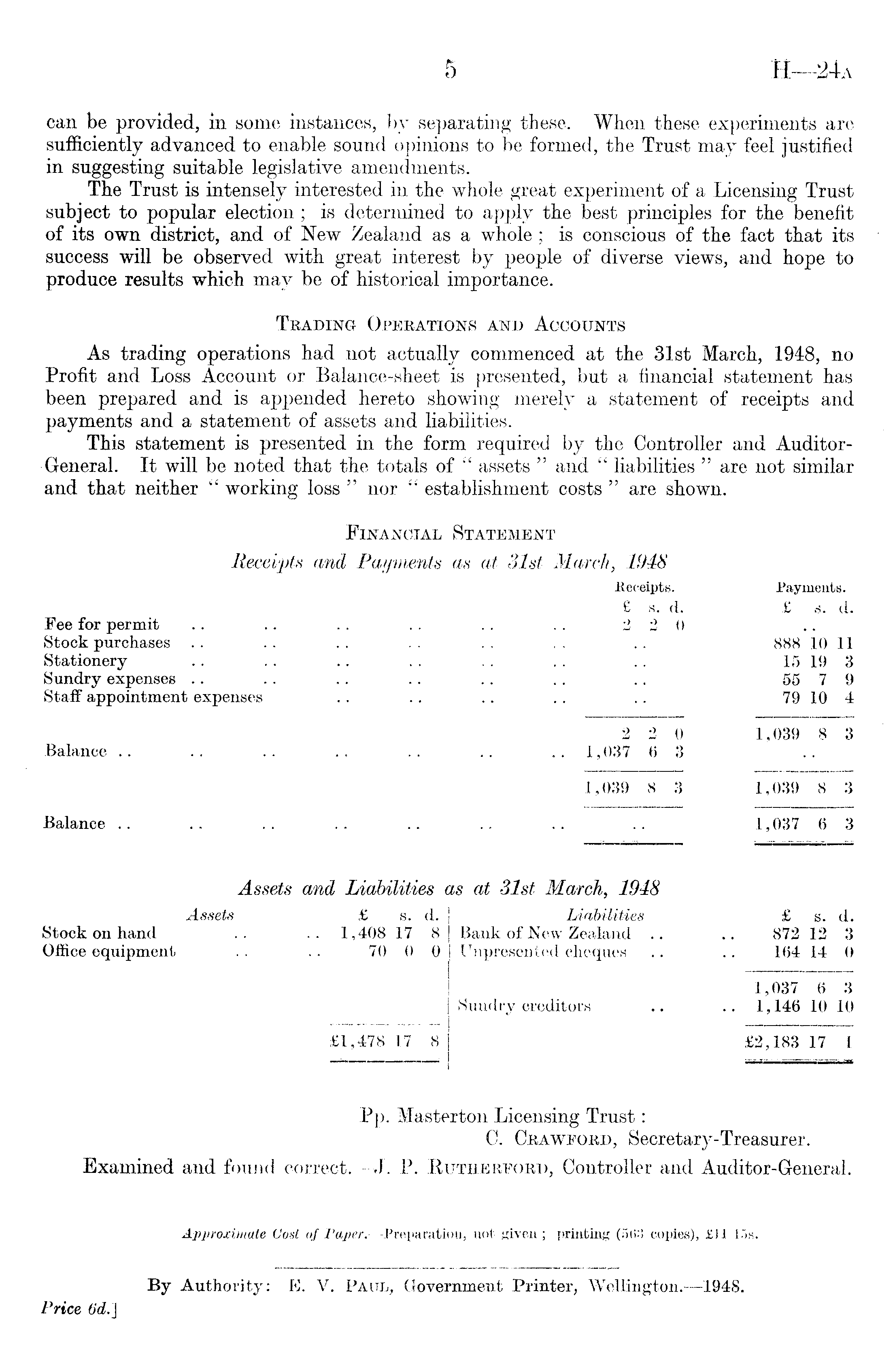 can be provided, in some instances, by separating these. When these experiments are sufficiently advanced to enable sound opinions to be formed, the Trust may feel justified in suggesting suitable legislative amendments. The Trust is intensely interested in the whole great experiment of a Licensing Trust subject to popular election ; is determined to apply the best principles for the benefit of its own district, and of New Zealand as a whole ; is conscious of the fact that its success will be observed with great interest by people of diverse views, and hope to produce results which may be of historical importance. Trading Operations and Accounts As trading operations had not actually commenced at the 31st March, 1948, no Profit and Loss Account or Balance-sheet is presented, but a financial statement has been prepared and is appended hereto showing merely a statement of receipts and payments and a statement of assets and liabilities. This statement is presented in the form required by the Controller and AuditorGeneral. It will be noted that the totals of " assets " and " liabilities " are not similar and that neither " working loss " nor " establishment costs " are shown. Financial Statement Receipts and Payments as at 31st March, 1948 Receipts. Payments. £ s. d. £ s. d. Fee for permit .. .. .. .. .. .. 220 Stock purchases . . . . . . . . .. 888 10 11 Stationery .. .. .. .. .. . . .. 15 19 3 Sundry expenses .. . . .. .. .. .. .. 55 7 9 Staff appointment expenses .. .. .. .. .. 79 10 4 22 0 1,039 8 3 Balance .. .. .. .. .. .. .. 1,037 6 3 1,039 8 3 1,039 8 3 Balance .. .. .. .. .. .. .. .. 1,037 6 3 Assets and Liabilities as at 31st March, 1948 Assets £ s. d. ] Liabilities £ s. d. Stock on hand .. .. 1,408 17 8 Bank of New Zealand .. .. 872 12 3 Office equipment . . .. 70 0 0 Unpresented cheques .. .. 164 14 0 1,037 6 3 Sundry creditors .. .. 1,146 10 10 | _ £1,478 17 8 £2,183 17 1 Pp. Masterton Licensing Trust: C. Crawford, Secretary-Treasurer. Examined and found correct. —J. P. Rutherford, Controller and Auditor-General. Approximate Cost of Paper.—Preparation, not given ; printing (563 copies), £ll 15s.
