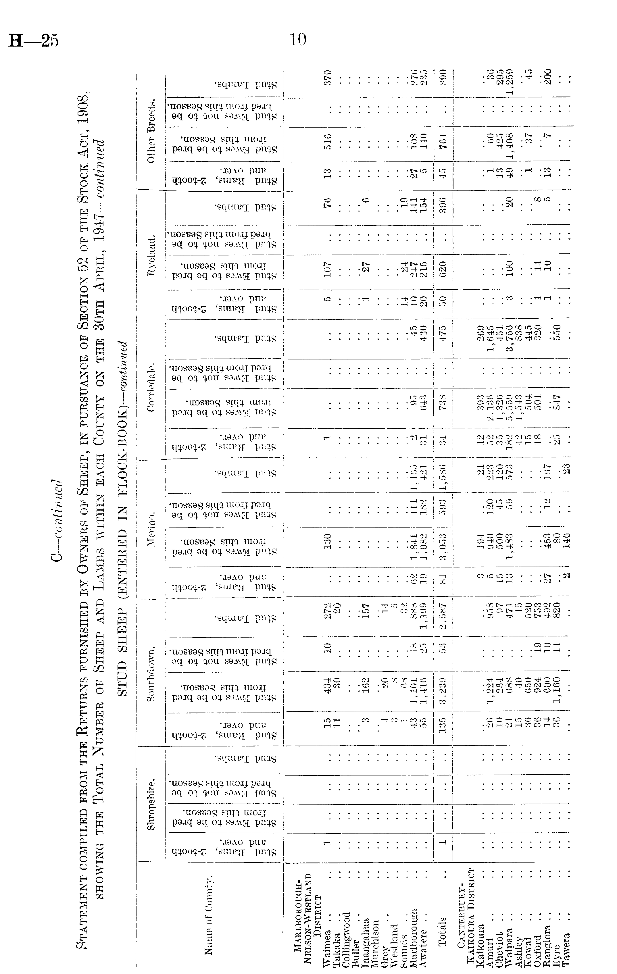 C— continued Statement compiled from the Returns furnished by Owners of Sheep, in pursuance of Section 52 of the Stock Act, 1908, showing the Total Number of Sheep and Lambs within each County on the 30th April, 1947— continued STUD SHEEP (ENTERED IN FLOCK-BOOK)— continued
