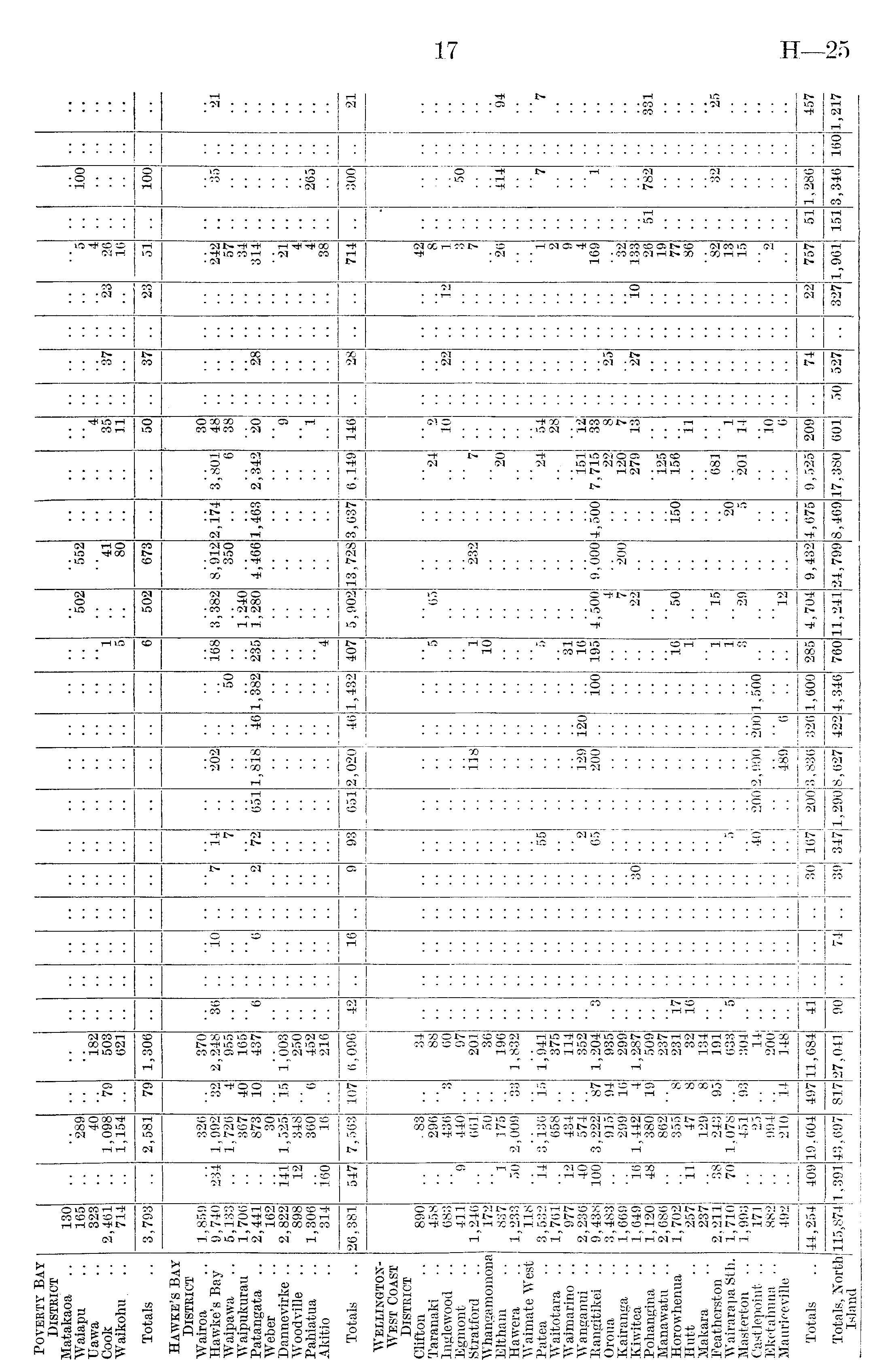 Poverty Bay District Matakaoa 130 Waiapu 165 289 502 '552 5 100 Uawa 323 40 182 4 4 Cook 2,461 1,098 79 503 1 ' 41 35 37 23 26 Waikohu 714 1,154 621 5 80 11 16 Totals 3,793 2,581 79 1,306 6 502 673 50 37 23 51 100 Hawke's Bay District Wairoa 1,859 326 370 30 Hawke's Bay 9,740 234 1,992 32 2,248 36 10 7 14 202 168 3,382 8 j 912 2,1.74 3801 48 242 35 21 Waipawa 5,133 1,726 4 955 7 50 350 6 38 57 Waipukurau Patangata .. 1,706 367 40 165 1 i 240 34 2,441 873 10 437 6 6 2 72 651 1,818 46 1,382 235 1,280 4^466 1,463 2,342 20 28 314 Weber 162 30 Dannevirlce .. 2,822 141 1,525 15 1,003 9 21 Woodville .. 898 12 348 250 4 Pahiatua 1,306 360 6 452 1 4 265 Akitio 314 160 16 216 4 38 Totals 26,381 547 7,563 107 6,096 42 16 9 93 651 2,020 46 1,432 407 5,902 13,728 3,637 6,149 146 28 714 300 21 WellingtonWest Coast District Clifton 890 . 83 34 42 Taranald 458 296 88 5 65 24 1 8 Inglewood .. 683 436 3 60 10 22 12 1 . . i . . Egmont 411 ' '9 440 97 3 50 Stratford 1,246 661 201 118 1 232 7 7 Whangamomona 172 50 36 10 Eltham 837 ' 1 175 196 20 26 414 94 Ha vera 1,233 50 2,009 '33 3,832 Waimate West 118 Patea 3,532 14 3,136 15 1,941 55 5 24 54 1 7 7 Waitotara .. 1,761 658 375 28 2 Waimarino .. 977 'l2 434 114 31 9 Wanganui .. 2,236 40 574 352; 2 129 120| ie 151 12 4 Eangitikei .. 9,438 100 3,222 '87 1,204 3 65 200 ioo 195 4^500 9^000 4,500 7,715 33 169 1 Oroua 3,483 915 94 935 4 22 8 25 Kairanga 1,669 299 16 299 7 '200 120 7 32 Kiwitea 1,649 ie 1,442 4 1,287 30 22 279 13 27 10 133 Pohangina .. 1,120 48 380 19 5f)9 26 51 782 331 Manawatu .. 2,686 862 237 125 19 Horowhenua 1,702 355 ' 'g 231 17 16 50 iio 156 77 Hutt 257 ii 47 8 32 16 1 11 86 Makara 237 129 8 134 Peatherston 2,211 '38 243 95 191 1 15 681 82 32 25 Wairarapa Sth. 1,710 70 1,078 633 5 5 1 '20 1 13 Masterton .. 1,993 3 ' '29 5 '201 14 15 Castlepoint .. 171 25 14] .. 40 200 2,900 200 1,500 Eketahrina .. 882 994 200 10 2 Maurioeville 492 210 'i4 148 . . 489 6 12 6 Totals 44,254 409 19,604 497, 11,684 41 30 167 200 3,836 326 1,600 285 4,704 9,432 4,675 9,525 209 74 22 757 51 1,286 457 Totals, North 115,874 1,391 43,697 817 27,041 90 74 39 347 1,290 8,627 422 4,346 760 11,241 24,799 8,469 17,380 601 50 527 327 1,961 151 3,346 160 1,217 Island 1