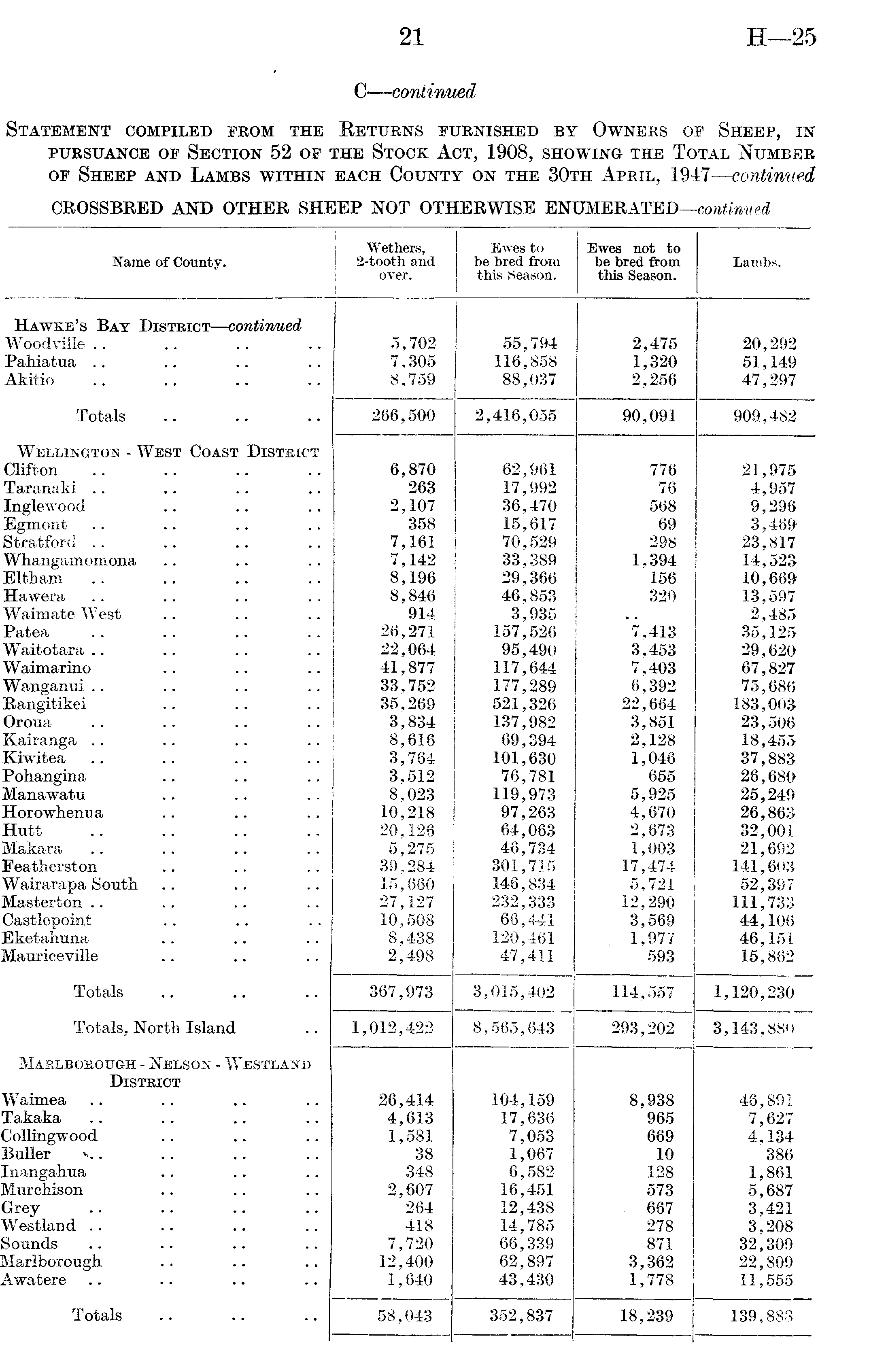 C—continued Statement compiled from the Returns furnished by Owners of Sheep, in pursunce of section 52 of the stock Act, 1908, showing the Total Number of Sheep and Lambs within each County on the 30th April, 1947—continued CROSSBRED AND OTHER SHEEP NOT OTHERWISE ENUMERATED—continued