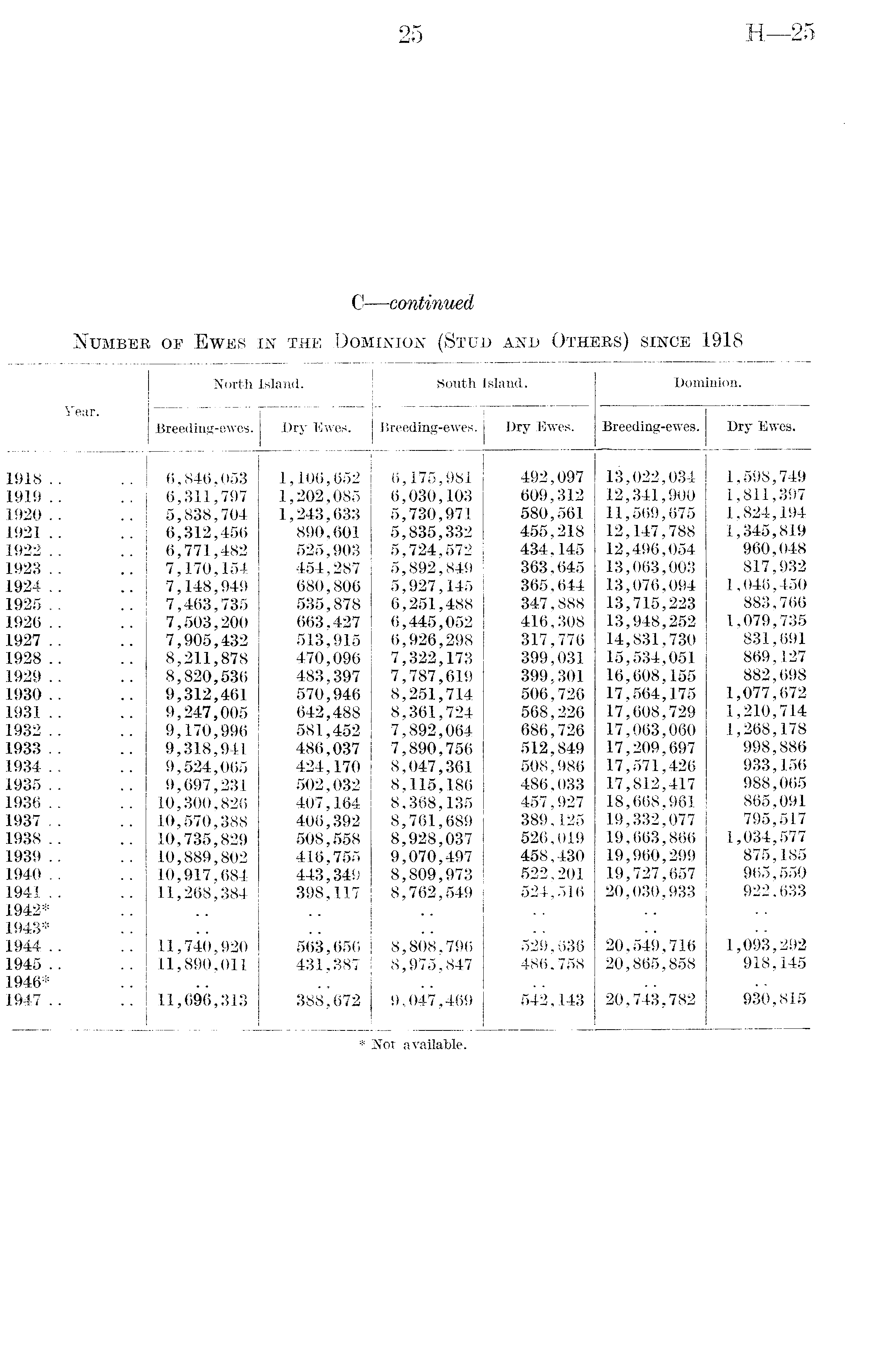 Year. North Island. South Island. Dominion. Breeding-ewes. Dry Ewes. Breeding-ewes. Dry Ewes. Breeding-ewes. Dry Ewes, 1918 6,846,053 1,106,652 6,175,981 492,097 13,022,034 1,598,749 1919 6,311,797 1,202,085 6,030,103 609,312 12,341,900 1,811,397 1920 5,838,704 1,243,633 5,730,971 580,561 11,569,675 1,824,194 1921 6,312,456 890,601 5,835,332 455,218 12,147,788 1,345,819 1922 6,771,482 525,903 5,724,572 434,145 12,496,054 960,048 1923 7,170,154 454,287 5,892,849 363,645 13,063,003 817,932 1924 7,148,949 680,806 5,927,145 365,644 13,076,094 1,046,450 1925 7,463,735 535,878 6,251,488 347,888 13,715,223 883,766 1926 7,503,200 663.427 6,445,052 416,308 13,948,252 1,079,735 1927 7,905,432 513,915 6,926,298 317,776 14,831,730 831,691 1928 8,211,878 470,096 7,322,173 399,031 15,534,051 869,127 1929 8,820,536 483,397 7,787,619 399,301 16,608,155 882,698 1930 9,312,461 570,946 8,251,714 506,726 17,564,175 1,077,672 1931 9,247,005 642,488 8,361,724 568,226 17,608,729 1,210,714 1932 9,170,996 581,452 7,892,064 686,726 17,063,060 1,268,178 1933 9,318,941 486,037 7,890,756 512,849 17,209,697 998,886 1934 9,524,065 424,170 8,047,361 508,986 17,571,426 933,156 1935 9,697,231 502,032 8,115,186 486,033 17,812,417 988,065 1936 10,300,826 407,164 8,368,135 457,927 18,668,961 865,091 1937 10,570,388 406,392 8,761,689 389,125 19,332,077 795,517 1938 10,735,829 508,558 8,928,037 526,019 19,663,866 1,034,577 1939 10,889,802 416,755 9,070,497 458,430 19,960,299 875,185 1940 10,917,684 443,349 8,809,973 522,201 19,727,657 965,550 1941 11,268,384 398,117 8,762,549 524,516 20,030,933 922,633 1942* 1943* 1944 11,740,920 563,656 8,808,796 529,636 20,549,716 1,093,292 1945 11,890,011 431,387 8,975,847 486,758 20,865,858 918,145 1946* 1947 11,696,313 388^672 9,047,469 542,143 20,743,782 930,815 * Not available.