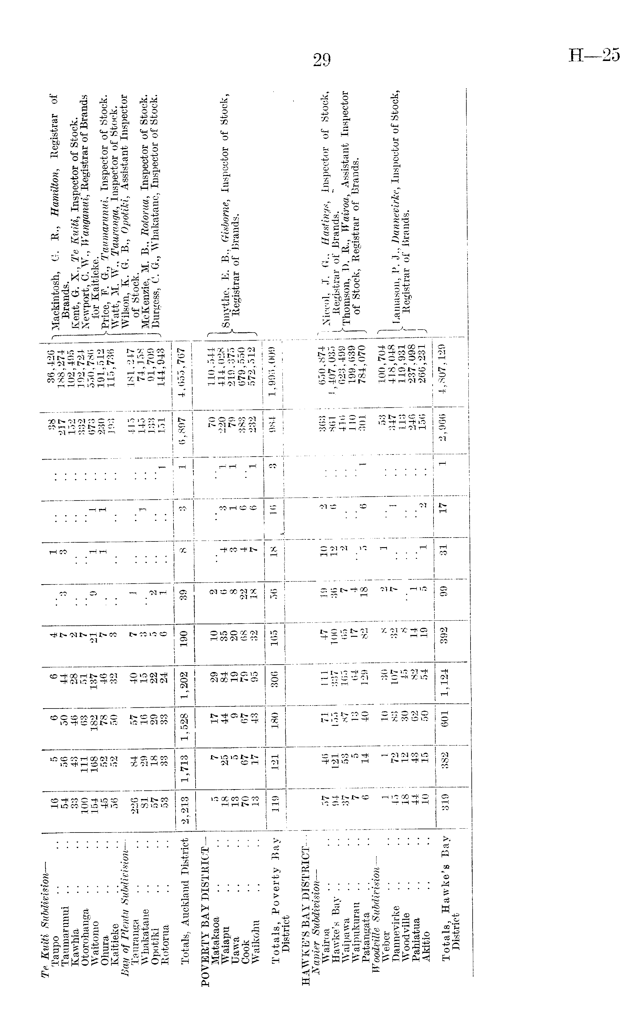 Te Kuiti Subdivision — 1 no „„ , 0 „ . Taupo .. .. 16 5 6 6 4 .. 1 .. .. 38 ,56,4-0 Mackintosh, 0. R., Hamilton, Registrar of' Taumarunui .. .. 54 56 50 44 7 3 3 .. 217 Brands. Kawhia .. .. 33 43 46 28 2 .. .. .. .. Ia2 102,495 Kent, G. X., Te Kuiti, Inspector of Stock. Otorohanga .. .. 100 111 63 51 7 .. .. .. .. 332 Newport, 0. W., Wanganui, Registrar of Brands Waitomo .. .. 154 168 182 137 21 9 1 1 673 550,786 for l Kaitieke. Ohura .. .. 45 52 78 46 7 1 1 230 1J1,512 tPrice, F. G., Taumarunui, Inspector of Stock. Kaitieke .. .. 56 52 50 32 3 .. .. .. .. 19-5 llo,7<So Watt, M. W., Tauranga, Inspector of Stock. Bay of Plenty Subdivision — , ,,. _ Wilson, K. Gr. B., Opotilci, Assistant Inspector Tauranga .. ..226 84 57 40 7 1 4 J o of Stock. Whaka-tane .. .. 81 29 16 15 3 .. 1 14u 74,ins McKenzie, M. B., Rotor ua, Inspector of Stock. Opotiki .. .. 57 18 29 22 5 2 .. .. .. 133 .11,703 Burgess, C. Gr., Whakatanc, Inspector of Stock. Rotorua .. .. 53 33 33 24 6 1 .. 1 151 144,943 Totals, Auckland District 2,213 1,713 1,528 1,202 190 39 8 3 1 6,897 4,655,767 I POVERTY BAY DISTRICT— 1 „ A 1ln ... . Matakaoa .. .. 5 7 17 29 10 2 .. .. .. 70 110 o44 1 Waiapu .. .. 18 25 44 84 35 6 4 3 1 220 414,028 s my the, E. B„ Gisborne, Inspector of Stock, Uawa .. ..13 5 9 19 20 8 3 1 1 79 219,375 y Registrar of Brands. Cook .. 70 67 67 79 68 22 4 6 383 679, 5o0 Waikohu .. .. 13 17 43 95 32 18 7 6 1 232 o72,ol2 J Totals, Poverty Bay 119 121 180 306 165 56 18 _ 16 3 984 1,996,009 District — j_— _ HAWKE'S BAY DISTRICT— Napier Subdivision — „ n-,\ ant U Wairoa .. .. 57 46 71 111 47 19 10 2 •• \ 363 6o0,874 5ficco i j j. (>.. Hastings, Inspector of Stock, Hawke's Bay .. .. 94 121 155 337 100 36 12 6 . . 861 1,407,0.55 , Registrar of Brands. * Waipawa .. .. 37 53 87 165 65 7 > 2 .. ■ • ! Thomson, D. R., Wairoa, Assistant Inspector Waipukurau .. .. 7 5 13 64 17 4 .. .. • • j 110 199,6,59 of Stock, Registrar of Brands. Patangata .. .. 6 14 40 129 82 18 5 6 1 j 301 784,070 J Woodville Subdivision — 1 ._ Weber .. .. 1 1 10 30 8 2 1 .. .. 53 100,704 1 Dannevirke .. .. 45 72 83 107 32 7 .. 1 347 418,048 j Lama son, 1'. J., Dannevirke, Inspector of Stock, Woodville .. .. 18 12 30 45 8 113 119,9.51 > Registrar of Brands. Pahiatua .. .. 44 43 62 82 14 1 .. .. 246 237,098 Akitio .. .. 10 15 50 54 19 5 1 2 .. 156 266,231 J Totals, Hawke's Bay 319 382 601 1,124 392 99 81 17 1 2,966 4,807,129 District