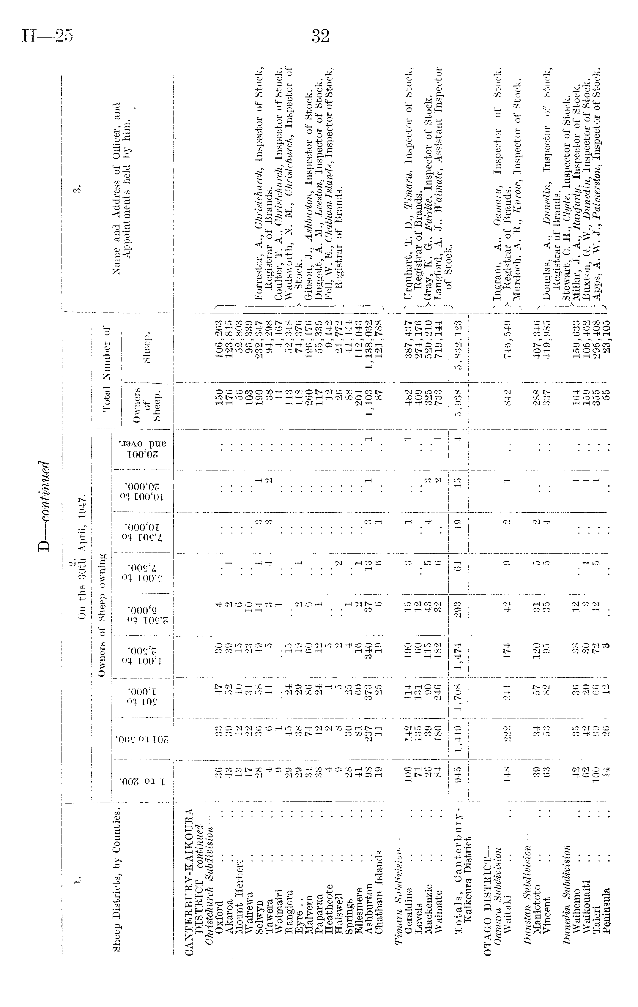 1 2. o On the 30th April, 1947. Owners of Sheep owning To t, a l Number of SheeD Districts, by Counties. Q - | . Name and Address of Officer, and § o 0 . .g . o - \ $ - S 6 Appointments held by him. N O "'o -HO rH§ gg go Owners o 0 © § 2 S <~c o <Orri of Sheep. g Sh glIS o„t- «o p«g S-g sheep. Gq CANTERBURY-KAIKOURA DISTRICT —continued Christchurch Subdivision — Oxford .. .. 36 33 47 30 4 150 106,263 1 Akaroa .. .. 43 39 52 39 2 1 . . . . 176 123,845 Mount Herbert .. 13 12 10 15 6 .. .. .. 56 52,803 Wairewa .. .. 17 22 31 23 10 103 96,339 Selwyn .. .. 28 36 58 49 14 1 3 1 190 232,347 Forrester, A., Christchurch, Inspector of Stock, Tawera .. .. 4 6 11 5 3 4 3 2.. 38 94,298 Registrar of Brands. Waimairi .. .. 9 1 .. .. 1 .. .. .. .. 11 4,467 Coulter, T. A., Christchurch, Inspector of Stock. Rangiora .. .. 29 45 24 15 .. .. .. .. .. 113 52,348 Wadsworth, N. M., Christchurch, Inspector of Eyre.. .. .. 29 38 29 19 2 1 118 74,376 V Stock. Malvern .. .. 34 74 86 60 6 .. .. .. .. 260 196,176 Gibson, J., Ashburton, Inspector of Stock. Paparua .. .. 38 42 24 12 1 .. .. .. .. 117 55,335 Doggett, A. M., Leeston, Inspector of Stock. Heathcote .. .. 4 2 1 5 .. .. .. .. .. 12 9,142 Fell, W. E., Chatham Islands, Inspector of Stock, Halswell .. .. 9 8 5 2 .. 2 .. .. .. 26 21,772 Registrar of Brands. Springs .. .. 28 30 25 4 1 .. .. .. .. 88 41,444 Ellesmere .. .. 41 81 60 16 2 1 201 112,043 Ashburton .. .. 98 237 373 340 37 13 3 1 1 1,103 1,138,032 Chatham Islands .. 19 11 25 19 6 6 1 .. 87 121,788 J Timaru Subdivision— Geraldine .. .. 106 142 114 100 15 3 1 1 482 387,437 1 Urquhart, T. D., Timaru, Inspector of Stock, Levels .. .. 71 135 131 60 12 .. .. .. .. 409 274,176 1 Registrar of Brands. Mackenzie .. .. 26 39 90 115 43 5 4 3 325 520,210 VGray, K. Fairlie, Inspector of Stock. Waimate .. .. 84 180 246 182 32 6 2 1 733 719,144 Langford, A. J., Wuimate, Assistant Inspector J of Stock. Totals, Canterbury- 945 1,419 1,708 1,474 293 61 19 15 4 5,938 5,832,123 Kaikoura District OTAGO DISTRICT —• Oamaru Subdivision — "1 Ingram, A., Oamaru, Inspector of Stock, Waitaki .. .. 148 222 244 174 42 9 2 1 842 746,549 5- Registrar of Brands. j Murdoch, A. R., Kurow, Inspector of Stock. Dunstan Subdivision — ■ Maniototo .. .. 39 34 57 120 31 5 2 .. 288 407,346 -s Vincent .. .. 63 53 82 95 35 5 4 .. 337 419,985 Douglas, A., Dunedin, Inspector of Stock, Registrar of Brands. Dunedin Subdivision — I Stewart, C. H., Clyde, Inspector of Stock. Waihemo .. .. 42 35 30 38 12 .. 1 164 159,633 [Millar, J. A„ Ranfurly, Inspector of Stock. Waikouaiti .. .. 62 42 20 30 3 1 1 .. 159 105,462 Buxton, G-. W., Dunedin, Inspector of Stock. Taieri .. ..100 99 66 72 12 5 1 355 295,408 Apps, A. W. J., Palmerston, Inspector of Stock. Peninsula .. .. 14 1 26 12 3 .. .. .. .. .. 55 23,105 J