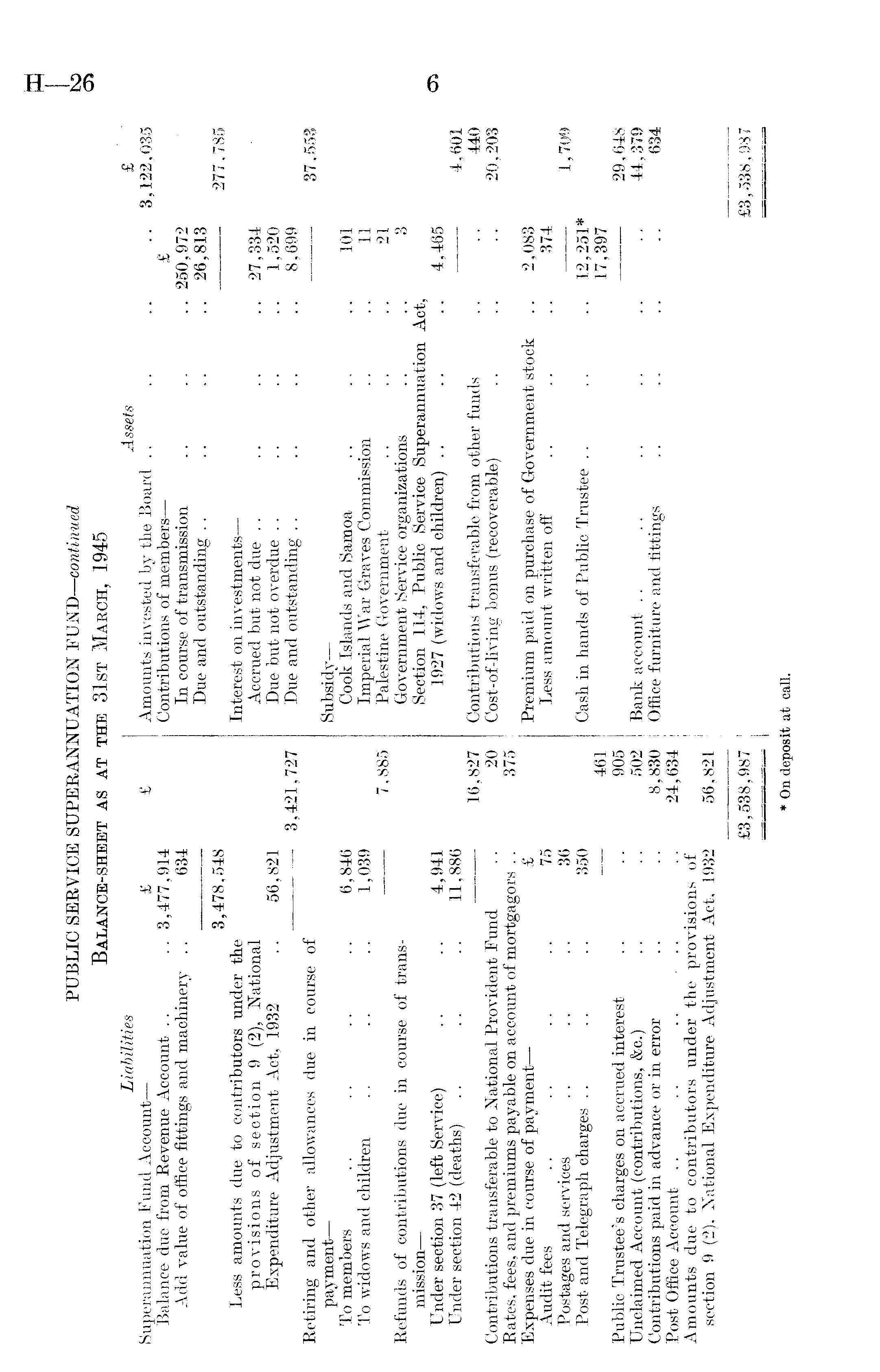 PUBLIC SERVICE SUPERANNUATION FUND— continued Balance-sheet as at the 31st March, 1945 Liabilities Assets £ Superannuation Fund Account— £ £ Amounts invested by the Board .. .. .. .. 3,122,035 Balance due from Revenue Account .. .. 3,477,914 Contributions of members— £ Add value of office fittings and machinery .. 634 In course of transmission .. .. .. 250,972 Due and outstanding . . .. .. .. 26,813 3,478,548 277,785 Less amounts due to contributors under the Interest on investments— provisions of section 9 (2), National Accrued but not due .. .. .. .. 27,334 Expenditure Adjustment Act, 1932 .. 56,821 Due but not overdue .. .. .. .. 1,520 3,421,727 Due and outstanding . . .. .. .. 8,699 Retiring and other allowances due in course of 37,553 payment— Subsidy— To members .. . . . . .. 6,846 Cook Islands and Samoa .. .. .. 101 To widows and children . . .. .. 1,039 Imperial War Graves Commission .. .. 11 7,885 Palestine Government .. .. .. 21 Refunds of contributions due in course of trans- Government Service organizations .. .. 3 mission— Section 114, Public Service Superannuation Act, Under section 37 (left Service) .. .. 4,941 1927 (widows and children) .. .. .. 4,465 Under section 42 (deaths) .. .. .. 11,886 4,601 16,827 Contributions transferable from other funds .. .. 440 Contributions transferable to National Provident Fund .. 20 Cost-of-living bonus (recoverable) .. .. .. 20,203 Rates, fees, and premiums payable on account of mortgagors .. 375 Expenses due in course of payment— £ Premium paid on purchase of Government stock .. 2,083 Audit fees .. . . . . .. 75 Less amount written off .. .. . . 374 Postages and services .. .. .. 36 1,709 Post and Telegraph charges .. .. .. 350 Cash in hands of Public Trustee .. .. .. 12,251* 461 17,397 Public Trustee's charges on accrued interest .. .. 905 29,648 Unclaimed Account (contributions, &c.) .. .. 502 Bank account .. .. .. .. .. .. 44,379 Contributions paid in advance or in error .. .. 8,830 Office furniture and fittings .. .. .. .. 634 Post Office Account .. .. .. ... .. 24,634 Amounts due to contributors under the provisions of section 9 (2), National Expenditure Adjustment Act, 1932 56,821 £3,538,987 £3,538,987