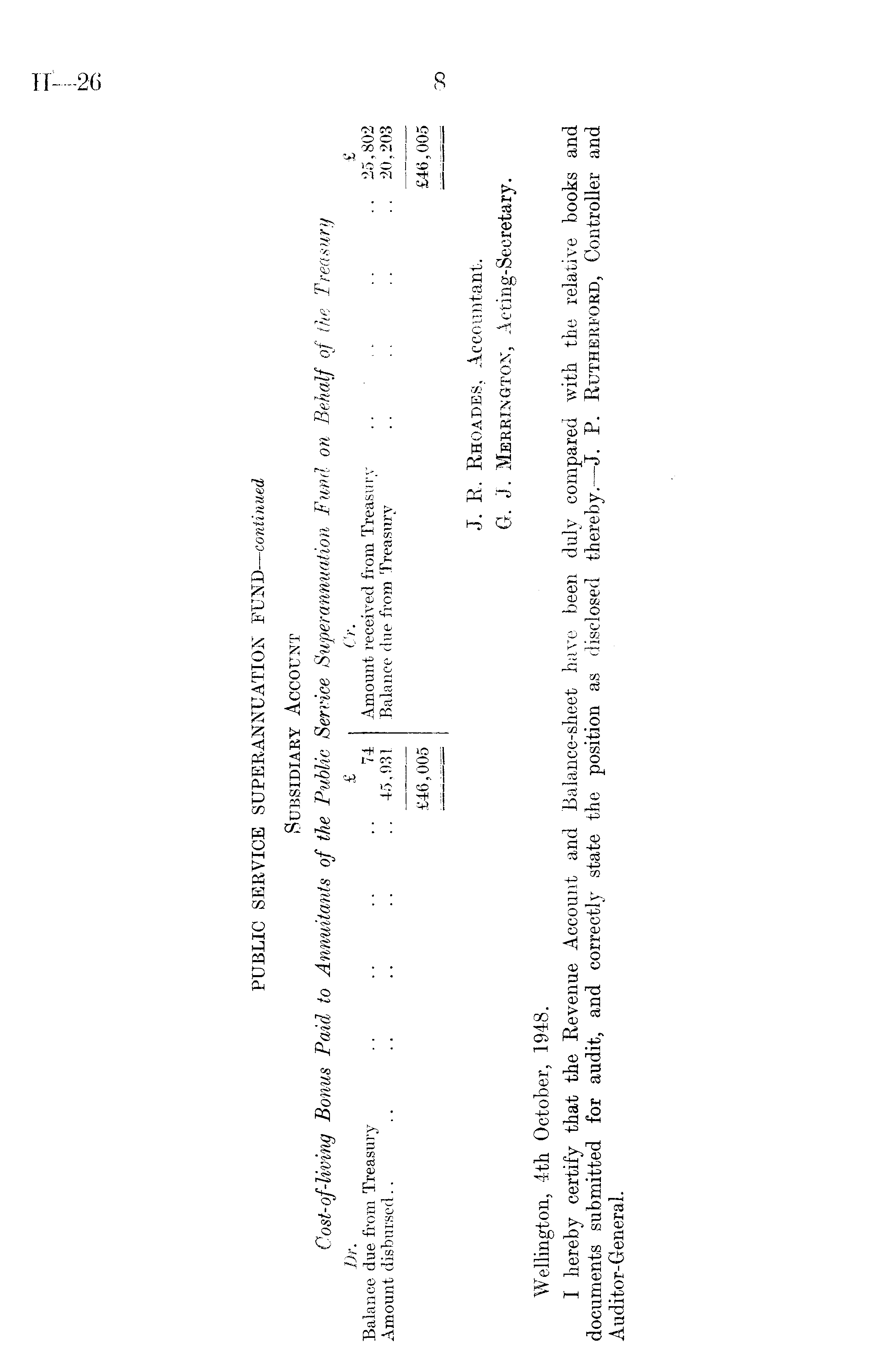 PUBLIC SERVICE SUPERANNUATION FUND— continued Subsidiary Account Cost-of-living Bonus Paid to Annuitants of the Public Service Superannuation Fund on Behalf of the Treasury Dr. £ Cr. £ Balance due from Treasury .. . . .. .. 74 Amount received from Treasury .. ... .. .. 25,802 Amount disbursed.. .. .. .. .. ..45,931 Balance due from Treasury .. .. .. .. 20,203 £46,005 £46,005 J. R. Rhoades, Accountant. G. J. Merrington, Acting-Secretary. Wellington, 4th October, 1948. I hereby certify that the Revenue Account and Balance-sheet have been duly compared with the relative books and documents submitted for audit, and correctly state the position as disclosed thereby.— J. P. Rutherford, Controller and Auditor-General.
