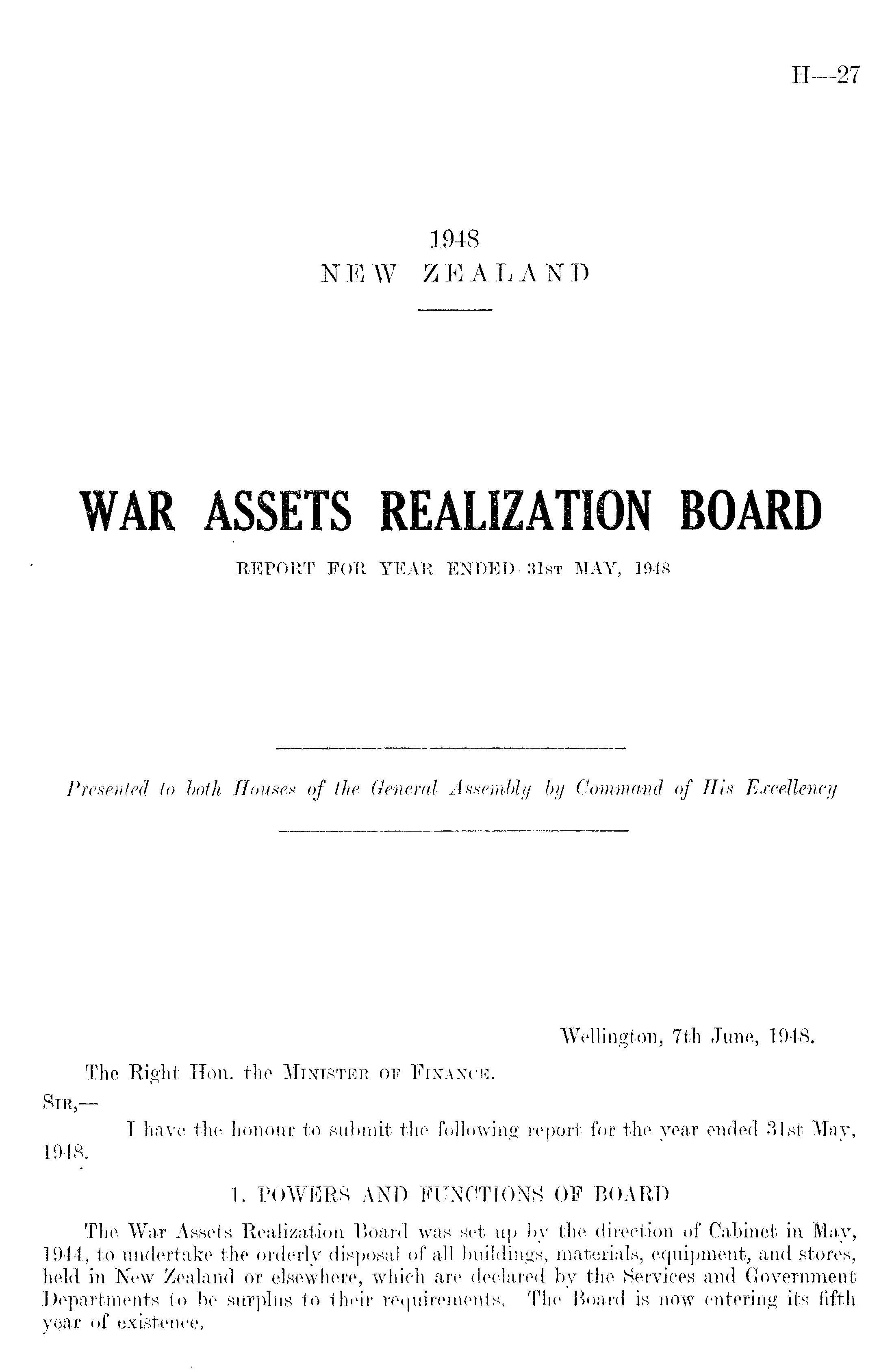 Wellington, 7th June, 1948. The Right Hon. the Minister of Finance. Sir, — T have the honour to submit the following report for the year ended 31st May, 1948. 1. POWERS AND FUNCTIONS OF BOARD The War Assets Realization Board was set up by the direction of Cabinet in May, 1944, to undertake the orderly disposal of all buildings, materials, equipment, and stores, held in New Zealand or elsewhere, which are declared by the Services and Government Departments to be surplus to their requirements. The Board is now entering its fifth year of existence.