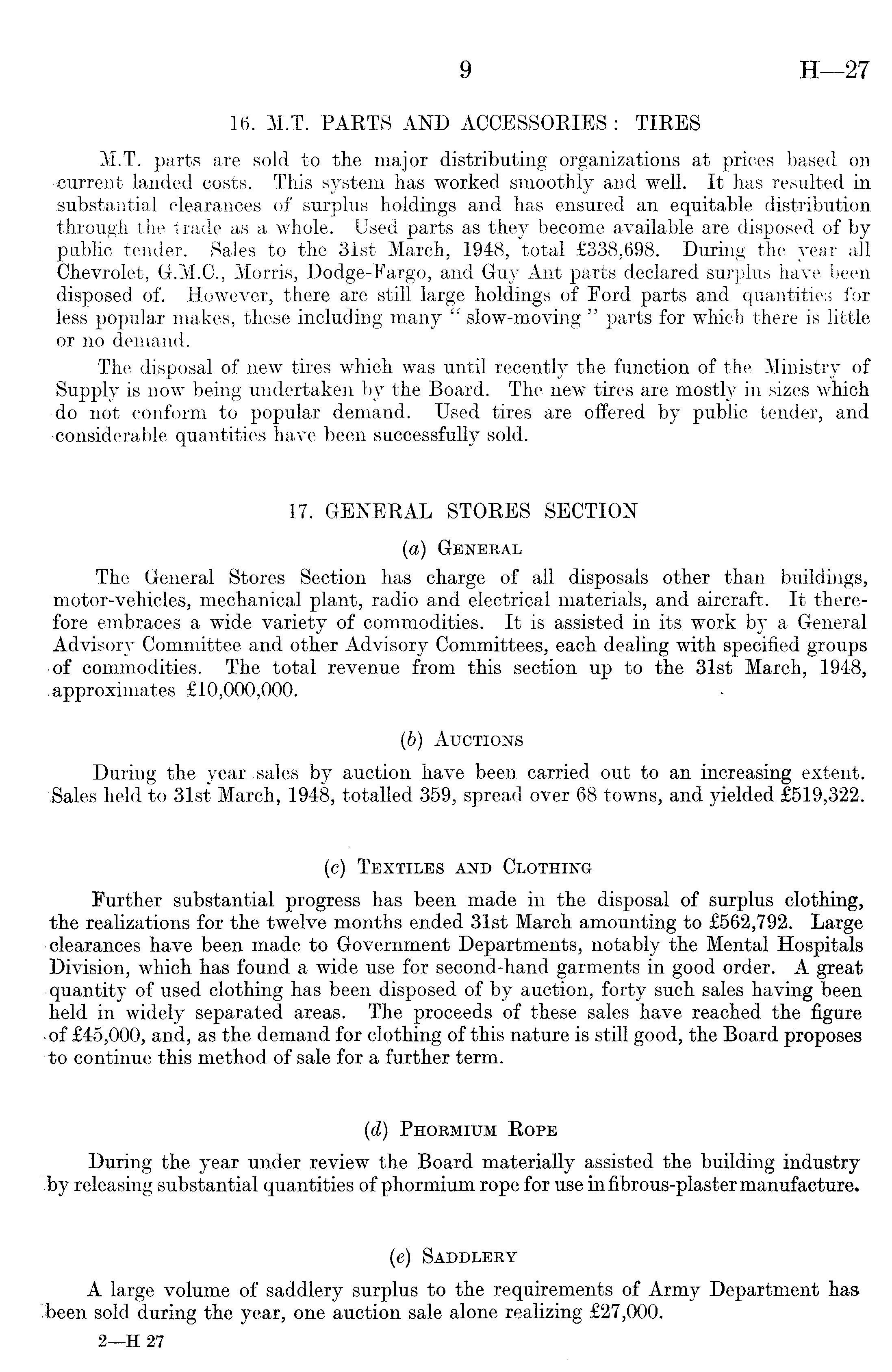 16. M.T. PARTS AND ACCESSORIES : TIRES M.T. parts are sold to the major distributing organizations at prices based on current landed costs. This system has worked smoothly and well. It has resulted in ..substantial clearances of surplus holdings and has ensured an equitable distribution through the trade as a whole. Used parts as they become available are disposed of by public tender. Sales to the 31st March, 1948, total £338,698. During the year all Chevrolet, G.M.C., Morris, Dodge-Fargo, and Guy Ant parts declared surplus have been disposed of. However, there are still large holdings of Ford parts and quantities for less popular makes, these including many " slow-moving " parts for which there is little or no demand. The disposal of new tires which was until recently the function of the Ministry of Supply is now being undertaken by the Board. The new tires are mostly in sizes which -do not conform to popular demand. Used tires are offered by public tender, and -considerable quantities have been successfully sold. 17. GENERAL STORES SECTION (а) General The General Stores Section has charge of all disposals other than buildings, motor-vehicles, mechanical plant, radio and electrical materials, and aircraft. It therefore embraces a wide variety of commodities. It is assisted in its work by a General Advisory Committee and other Advisory Committees, each dealing with specified groups of commodities. The total revenue from this section up to the 31st March, 1948, approximates £10,000,000. (б) Auctions During the year sales by auction have been carried out to an increasing extent. Sales held to 31st March, 1948, totalled 359, spread over 68 towns, and yielded £519,322. (c) Textiles and Clothing Further substantial progress has been made in the disposal of surplus clothing, the realizations for the twelve months ended 31st March amounting to £562,792. Large clearances have been made to Government Departments, notably the Mental Hospitals Division, which has found a wide use for second-hand garments in good order. A great quantity of used clothing has been disposed of by auction, forty such sales having been held in widely separated areas. The proceeds of these sales have reached the figure of £45,000, and, as the demand for clothing of this nature is still good, the Board proposes to continue this method of sale for a further term. (d) Phormium Rope During the year under review the Board materially assisted the building industry by releasing substantial quantities of phormium rope for use in fibrous-plaster manufacture. (e) Saddlery A large volume of saddlery surplus to the requirements of Army Department has ■been sold during the year, one auction sale alone realizing £27,000.