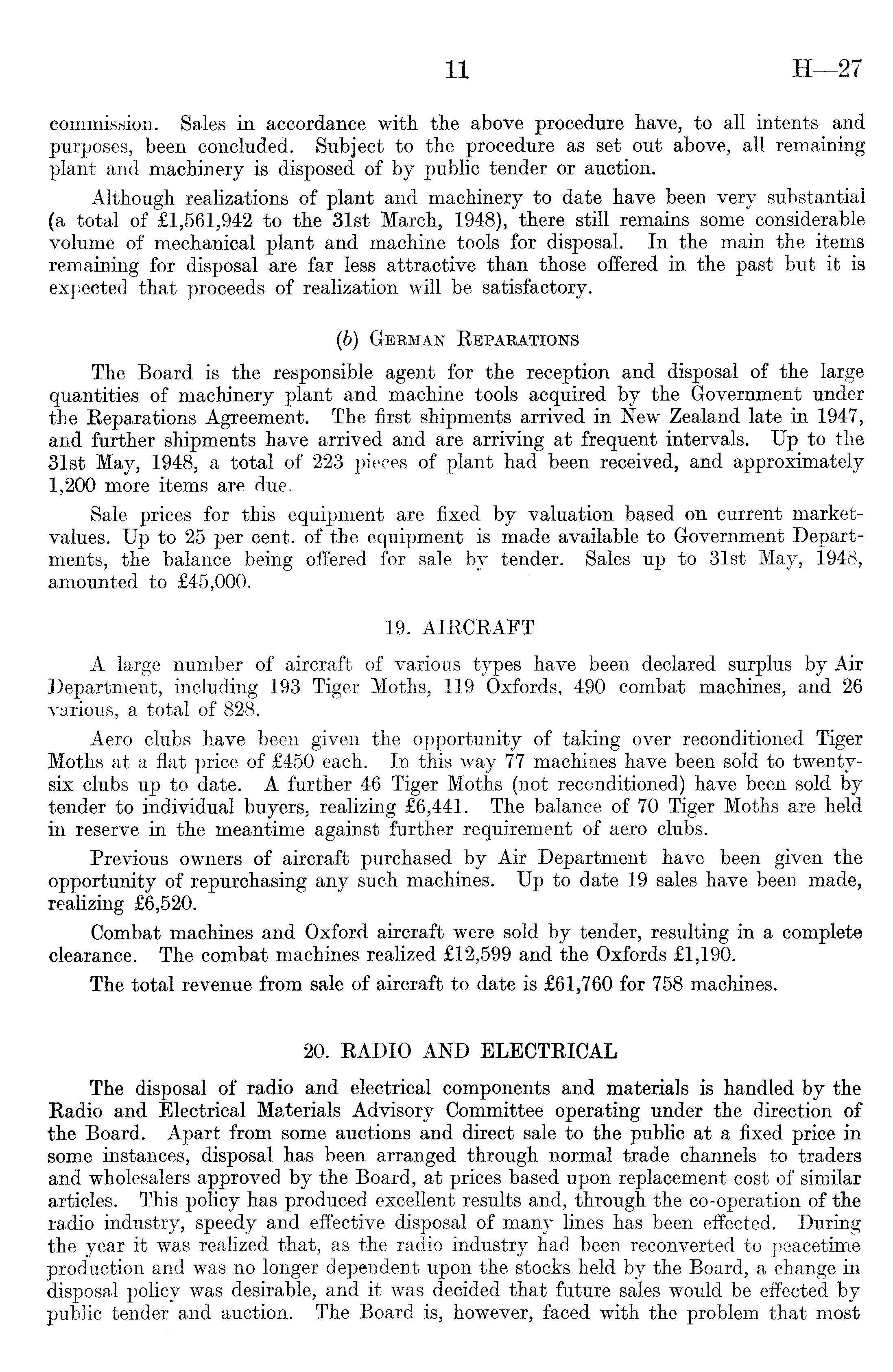 commission. Sales in accordance with the above procedure have, to all intents and purposes, been concluded. Subject to the procedure as set out above, all remaining plant and machinery is disposed of by public tender or auction. Although realizations of plant and machinery to date have been very substantial (a total of £1,561,942 to the 31st March, 1948), there still remains some considerable volume of mechanical plant and machine tools for disposal. In the main the items remaining for disposal are far less attractive than those offered in the past but it is expected that proceeds of realization will be satisfactory. (b) German Reparations The Board is the responsible agent for the reception and disposal of the large quantities of machinery plant and machine tools acquired by the Government under the Reparations Agreement. The first shipments arrived in New Zealand late in 1947, and further shipments have arrived and are arriving at frequent intervals. Up to the 31st May, 1948, a total of 223 pieces of plant had been received, and approximately 1,200 more items are due. Sale prices for this equipment are fixed by valuation based on current marketvalues. Up to 25 per cent, of the equipment is made available to Government Departments, the balance being offered for sale by tender. Sales up to 31st May, 1948, amounted to £45,000. 19. AIRCRAFT A large number of aircraft of various types have been declared surplus by Air Department, including 193 Tiger Moths, 119 Oxfords, 490 combat machines, and 26 various, a total of 828. Aero clubs have been given the opportunity of taking over reconditioned Tiger Moths at a flat price of £450 each. In this way 77 machines have been sold to twentysix clubs up to date. A further 46 Tiger Moths (not reconditioned) have been sold by tender to individual buyers, realizing £6,441. The balance of 70 Tiger Moths are held in reserve in the meantime against further requirement of aero clubs. Previous owners of aircraft purchased by Air Department have been given the opportunity of repurchasing anv such machines. Up to date 19 sales have been made, realizing £6,520. Combat machines and Oxford aircraft were sold by tender, resulting in a complete clearance. The combat machines realized £12,599 and the Oxfords £1,190. The total revenue from sale of aircraft to date is £61,760 for 758 machines. 20. RADIO AND ELECTRICAL The disposal of radio and electrical components and materials is handled by the Radio and Electrical Materials Advisory Committee operating under the direction of the Board. Apart from some auctions and direct sale to the public at a fixed price in some instances, disposal has been arranged through normal trade channels to traders and wholesalers approved by the Board, at prices based upon replacement cost of similar articles. This policy has produced excellent results and, through the co-operation of the radio industry, speedy and effective disposal of many lines has been effected. During the year it was realized that, as the radio industry had been reconverted to peacetime production and was no longer dependent upon the stocks held by the Board, a change in disposal policy was desirable, and it was decided that future sales would be effected by public tender and auction. The Board is, however, faced with the problem that most