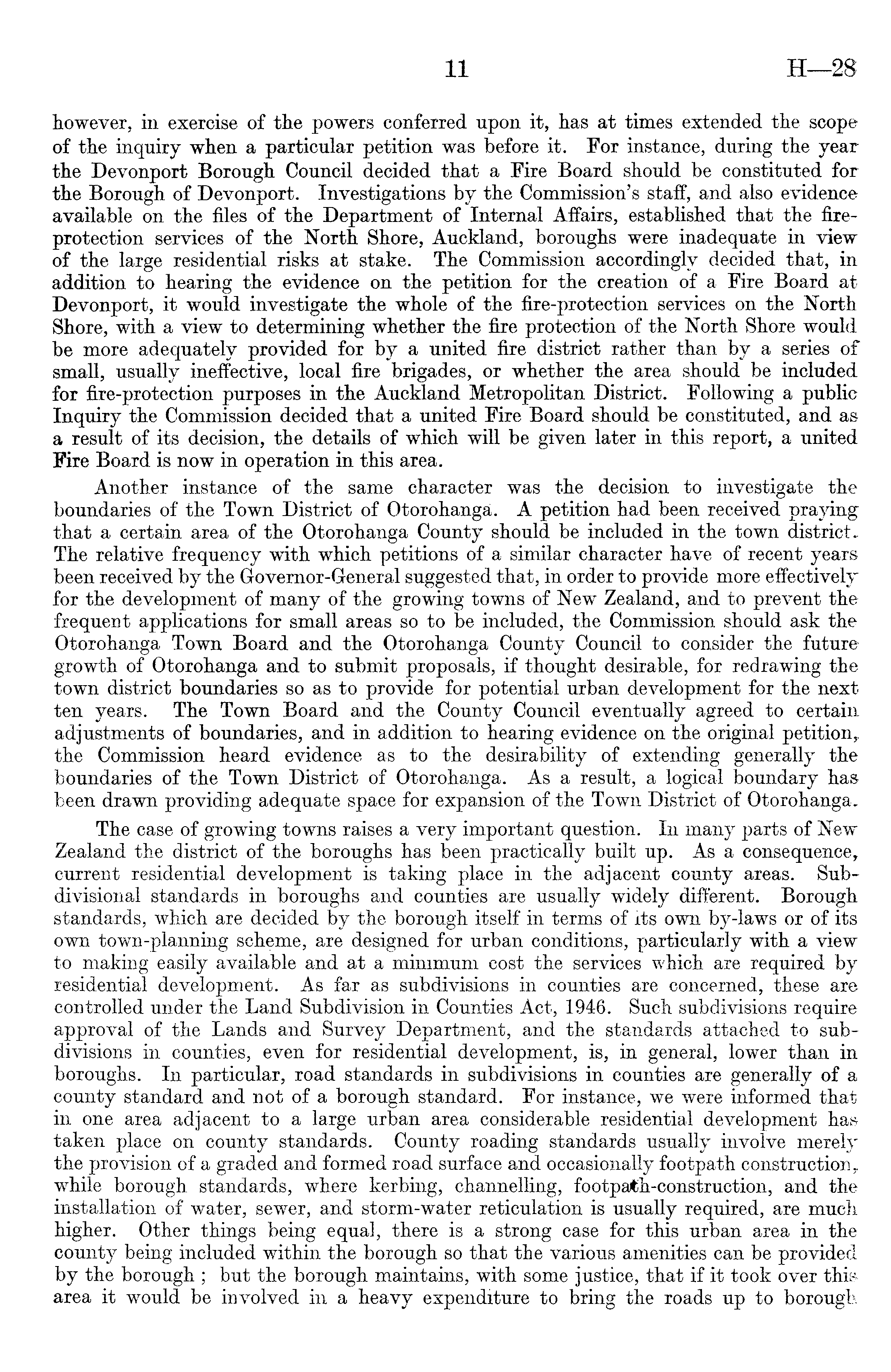 however, in exercise of the powers conferred upon it, has at times extended the scope of the inquiry when a particular petition was before it. For instance, during the year the Devonport Borough Council decided that a Fire Board should be constituted for the Borough of Devonport. Investigations by the Commission's staff, and also evidence available on the files of the Department of Internal Affairs, established that the fireprotection services of the North Shore, Auckland, boroughs were inadequate in view of the large residential risks at stake. The Commission accordingly decided that, in addition to hearing the evidence on the petition for the creation of a Fire Board at Devonport, it would investigate the whole of the fire-protection services on the North Shore, with a view to determining whether the fire protection of the North Shore would be more adequately provided for by a united fire district rather than by a series of small, usually ineffective, local fire brigades, or whether the area should be included for fire-protection purposes in the Auckland Metropolitan District. Following a public Inquiry the Commission decided that a united Fire Board should be constituted, and as a result of its decision, the details of which will be given later in this report, a united Fire Board is now in operation in this area. Another instance of the same character was the decision to investigate the boundaries of the Town District of Otorohanga. A petition had been received praying that a certain area of the Otorohanga County should be included in the town district . The relative frequency with which petitions of a similar character have of recent years been received by the Governor-General suggested that, in order to provide more effectively for the development of many of the growing towns of New Zealand, and to prevent the frequent applications for small areas so to be included, the Commission should ask the Otorohanga Town Board and the Otorohanga County Council to consider the future growth of Otorohanga and to submit proposals, if thought desirable, for redrawing the town district boundaries so as to provide for potential urban development for the next ten years. The Town Board and the County Council eventually agreed to certain adjustments of boundaries, and in addition to hearing evidence on the original petition, the Commission heard evidence as to the desirability of extending generally the boundaries of the Town District of Otorohanga. As a result, a logical boundary has been drawn providing adequate space for expansion of the Town District of Otorohanga. The case of growing towns raises a very important question. In many parts of New Zealand the district of the boroughs has been practically built up. As a consequence, current residential development is taking place in the adjacent county areas. Subdivisional standards in boroughs and counties are usually widely different. Borough standards, which are decided by the borough itself in terms of its own by-laws or of its own town-planning scheme, are designed for urban conditions, particularly with a view to making easily available and at a minimum cost the services which are required by residential development. As far as subdivisions in counties are concerned, these are controlled under the Land Subdivision in Counties Act, 1946. Such subdivisions require approval of the Lands and Survey Department, and the standards attached to subdivisions in counties, even for residential development, is, in general, lower than in boroughs. In particular, road standards in subdivisions in counties are generally of a county standard and not of a borough standard. For instance, we were informed that in one area adjacent to a large urban area considerable residential development has taken place on county standards. County roading standards usually involve merely the provision of a graded and formed road surface and occasionally footpath construction, while borough standards, where kerbing, channelling, footpath-construction, and the installation of water, sewer, and storm-water reticulation is usually required, are much higher. Other things being equal, there is a strong case for this urban area in the county being included within the borough so that the various amenities can be provided by the borough ; but the borough maintains, with some justice, that if it took over this area it would be involved in a heavy expenditure to bring the roads up to borough