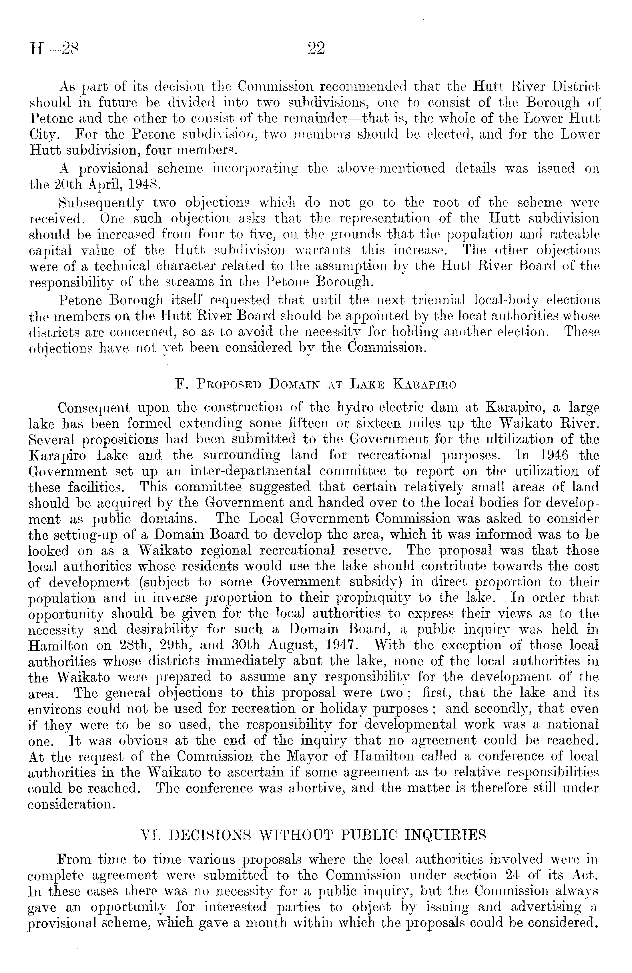 As part of its decision the Commission recommended that the Hutt River District should in future be divided into two subdivisions, one to consist of the Borough of Petone and the other to consist of the remainder—that is, the whole of the Lower Hutt City. For the Petone subdivision, two members should be elected, and for the Lower Hutt subdivision, four members. A provisional scheme incorporating the above-mentioned details was issued on the 20th April, 1948. Subsequently two objections which do not go to the root of the scheme were received. One such objection asks that the representation of the Hutt subdivision should be increased from four to five, on the grounds that the population and rateable capital value of the Hutt subdivision warrants this increase. The other objections were of a technical character related to the assumption by the Hutt River Board of the responsibility of the streams in the Petone Borough. Petone Borough itself requested that until the next triennial local-body elections the members on the Hutt River Board should be appointed by the local authorities whose districts are concerned, so as to avoid the necessity for holding another election. These objections have not yet been considered by the Commission. F. Proposed Domain at Lake Karapiro Consequent upon the construction of the hydro-electric dam at Karapiro, a large lake has been formed extending some fifteen or sixteen miles up the Waikato River. Several propositions had been submitted to the Government for the ultilization of the Karapiro Lake and the surrounding land for recreational purposes. In 1946 the Government set up an inter-departmental committee to report on the utilization of these facilities. This committee suggested that certain relatively small areas of land should be acquired by the Government and handed over to the local bodies for development as public domains. The Local Government Commission was asked to consider the setting-up of a Domain Board to develop the area, which it was informed was to be looked on as a Waikato regional recreational reserve. The proposal was that those local authorities whose residents would use the lake should contribute towards the cost of development (subject to some Government subsidy) in direct proportion to their population and in inverse proportion to their propinquity to the lake. In order that opportunity should be given for the local authorities to express their views as to the necessity and desirability for such a Domain Board, a public inquiry was held in Hamilton on 28th, 29th, and 30th August, 1947. With the exception of those local authorities whose districts immediately abut the lake, none of the local authorities in the Waikato were prepared to assume any responsibility for the development of the area. The general objections to this proposal were two ; first, that the lake and its environs could not be used for recreation or holiday purposes; and secondly, that even if they were to be so used, the responsibility for developmental work was a national one. It was obvious at the end of the inquiry that no agreement could be reached. At the request of the Commission the Mayor of Hamilton called a conference of local authorities in the Waikato to ascertain if some agreement as to relative responsibilities could be reached. The conference was abortive, and the matter is therefore still under consideration. VI. DECISIONS WITHOUT PUBLIC INQUIRIES From time to time various proposals where the local authorities involved were in complete agreement were submitted to the Commission under section 24 of its Act. In these cases there was no necessity for a public inquiry, but the Commission always gave an opportunity for interested parties to object by issuing and advertising a provisional scheme, which gave a month within which the proposals could be considered.