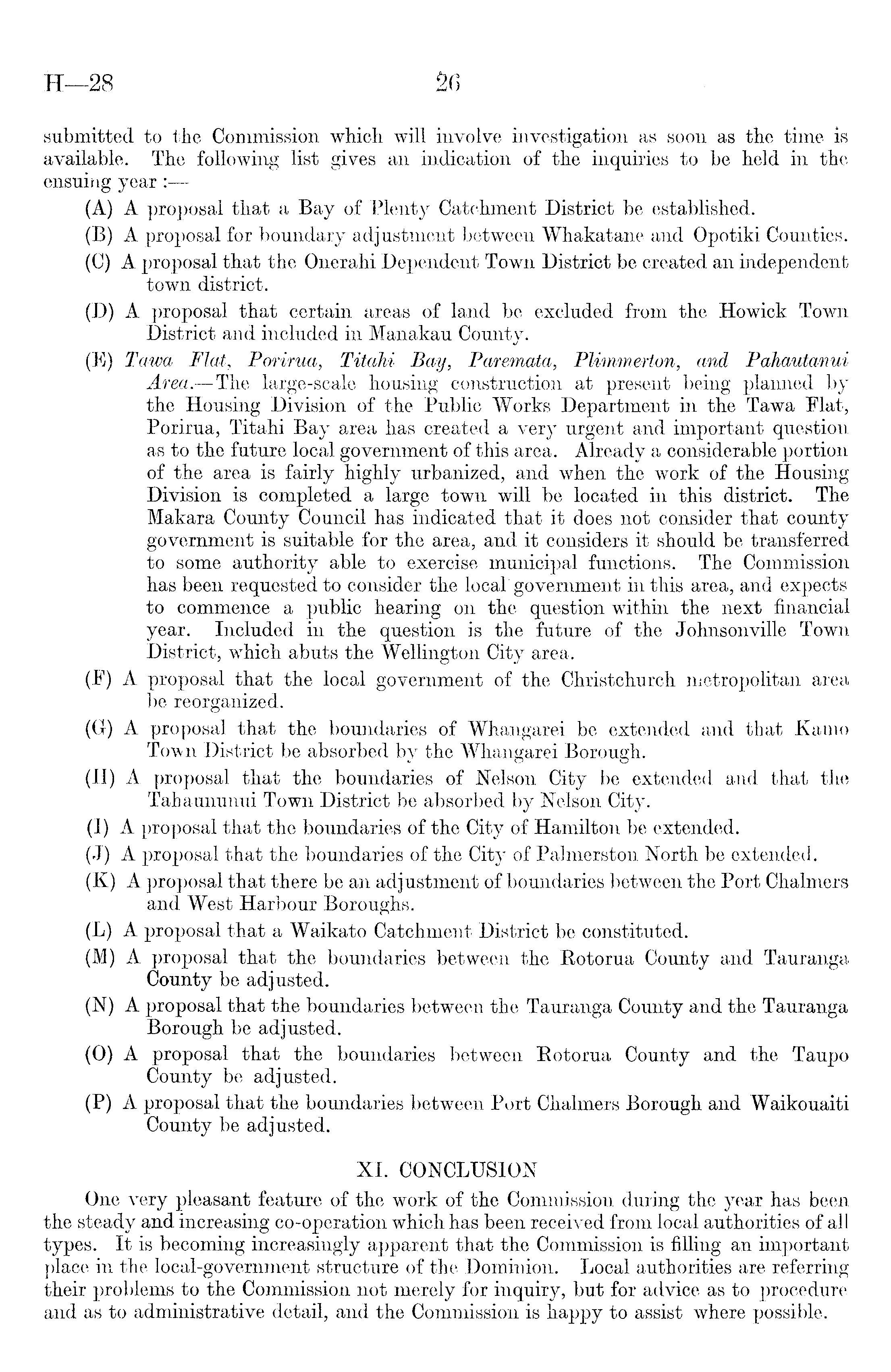 submitted to the Commission which will involve investigation as soon as the time is available. The following list gives an indication of the inquiries to be held in the ensuing year:— (A) A proposal that a Bay of Plenty Catchment District be established. (B) A proposal for boundary adjustment betweeu Whakatane and Opotiki Counties. (C) A proposal that the Onerahi Dependent Town District be created an independent town district. (D) A proposal that certain areas of land be excluded from the Howick Town District and included in Manakau County. (E) Tawa Flat, Porirua, Titahi Bay, Paremata, Plimmerton, and Pahautanui Area. —The large-scale housing construction at present being planned by the Housing Division of the Public Works Department in the Tawa Flat, Porirua, Titahi Bay area has created a very urgent and important question as to the future local government of this area. Already a considerable portion of the area is fairly highly urbanized, and when the work of the Housing Division is completed a large town will be located in this district. The Makara County Council has indicated that it does not consider that county government is suitable for the area, and it considers it should be transferred to some authority able to exercise municipal functions. The Commission has been requested to consider the local government in this area, and expects to commence a public hearing on the question within the next financial year. Included in the question is the future of the Johnsonville Town District, which abuts the Wellington City area. (F) A proposal that the local government of the Christchurch metropolitan area be reorganized. (G) A proposal that the boundaries of Whangarei be extended and that Kamo Town District be absorbed by the Whangarei Borough. (H) A proposal that the boundaries of Nelson City be extended and that the Tahaununui Town District be absorbed by Nelson City. (I) A proposal that the boundaries of the City of Hamilton be extended. (J) A proposal that the boundaries of the City of Palmerston North be extended. (K) A proposal that there be an adjustment of boundaries between the Port Chalmers and West Harbour Boroughs. (L) A proposal that a Waikato Catchment District be constituted. (M) A proposal that the boundaries between the Rotorua County and Tauranga County be adjusted. (N) A proposal that the boundaries between the Tauranga County and the Tauranga Borough be adjusted. (0) A proposal that the boundaries between Rotorua County and the Taupo County be adjusted. (P) A proposal that the boundaries between Port Chalmers Borough and Waikouaiti County be adjusted. XI. CONCLUSION One very pleasant feature of the work of the Commission during the year has been the steady and increasing co-operation which has been received from local authorities of all types. It is becoming increasingly apparent that the Commission is filling an important place in the local-government structure of the Dominion. Local authorities are referring their problems to the Commission not merely for inquiry, but for advice as to procedure and as to administrative detail, and the Commission is happy to assist where possible.