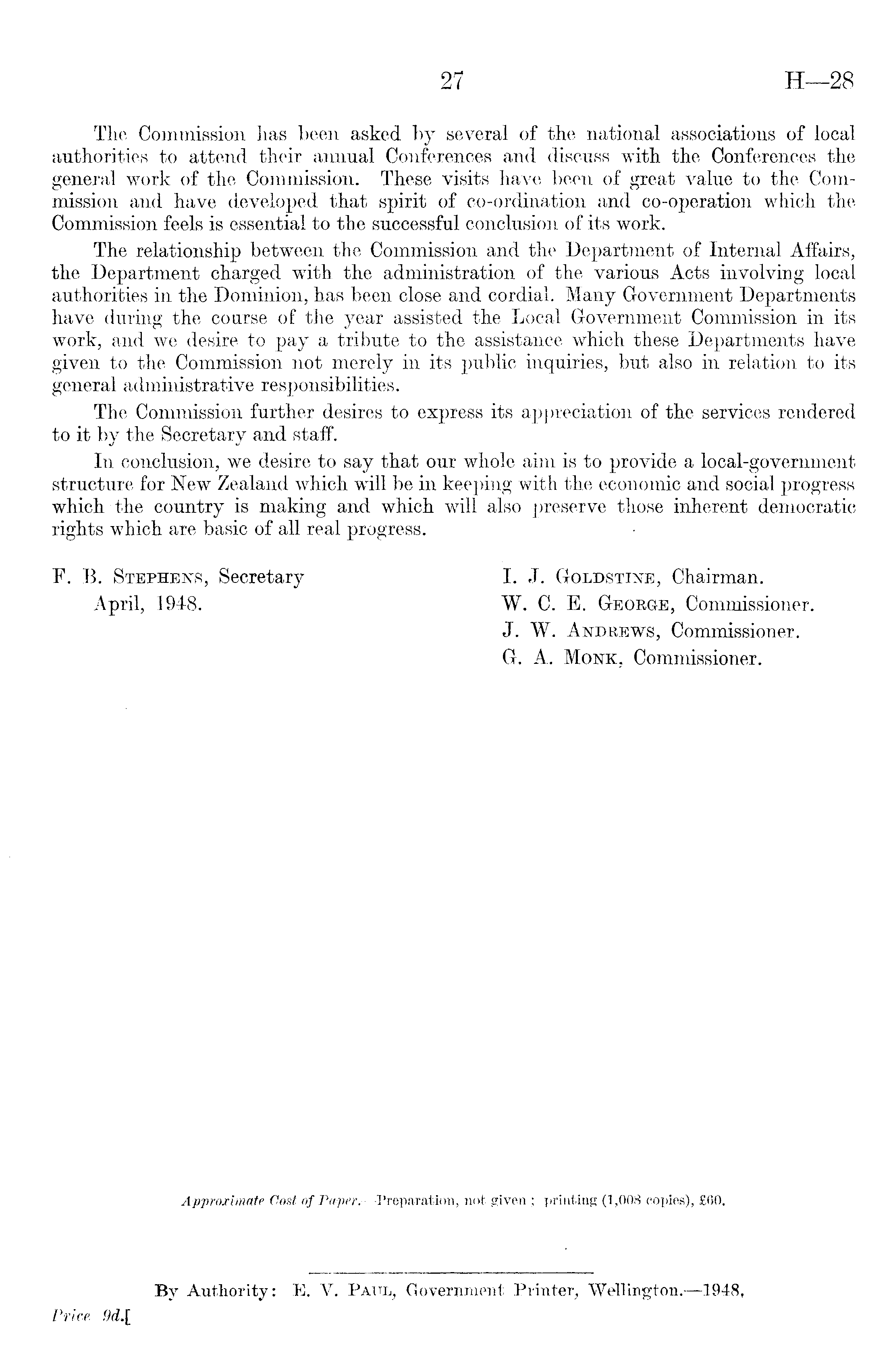 The Commission has been asked by several of the national associations of local authorities to attend their annual Conferences and discuss with the Conferences the general work of the Commission. These visits have been of great value to the Commission and have developed that spirit of co-ordination and co-operation which the Commission feels is essential to the successful conclusion of its work. The relationship between the Commission and the Department of Internal Affairs, the Department charged with the administration of the various Acts involving local authorities in the Dominion, has been close and cordial. Many Government Departments have during the course of the year assisted the Local Government Commission in its work, and we desire to pay a tribute to the assistance which these Departments have given to the Commission not merely in its public inquiries, but also in relation to its general administrative responsibilities. The Commission further desires to express its appreciation of the services rendered to it by the Secretary and staff. In conclusion, we desire to say that our whole aim is to provide a local-government structure for New Zealand which will be in keeping with the economic and social progress which the country is making and which will also preserve those inherent democratic rights which are basic of all real progress. F. B. Stephens, Secretary I. J. Goldstine, Chairman. April, 1948. W. C. E. George, Commissioner. J. W. Andrews, Commissioner. G. A. Monk, Commissioner.