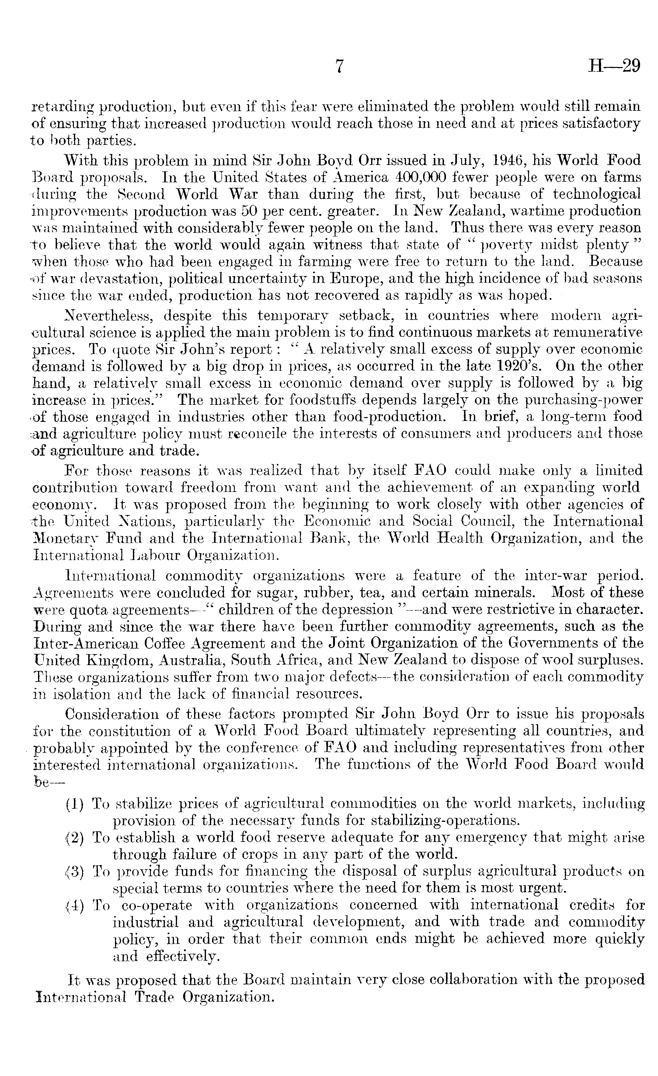retarding production, but even if this fear were eliminated the problem would still remain of ensuring that increased production would reach those in need and at prices satisfactory to both parties. With this problem in mind Sir John Boyd Orr issued in July, 1946, his World Food Board proposals. In the United States of America 400,000 fewer people were on farms •during the Second World War than during the first, but because of technological improvements production was 50 per cent, greater. In New Zealand, wartime production was maintained with considerably fewer people on the land. Thus there was every reason "to believe that the world would again witness that state of " poverty midst plenty " when those who had been engaged in farming were free to return to the land. Because •of war devastation, political uncertainty in Europe, and the high incidence of bad seasons since the war ended, production has not recovered as rapidly as was hoped. Nevertheless, despite this temporary setback, in countries where modern agricultural science is applied the main problem is to find continuous markets at remunerative prices. To quote Sir John's report: " A relatively small excess of supply over economic demand is followed by a big drop in prices, as occurred in the late 1920'5. On the other hand, a relatively small excess in economic demand over supply is followed by a big increase in prices." The market for foodstuffs depends largely on the purchasing-power ■of those engaged in industries other than food-production. In brief, a long-term food and agriculture policy must reconcile the interests of consumers and producers and those of agriculture and trade. For those reasons it was realized that by itself FAO could make only a limited contribution toward freedom from want and the achievement of an expanding world economy. It was proposed from the beginning to work closely with other agencies of <the United Nations, particularly the Economic and Social Council, the International Monetary Fund and the International Bank, the World Health Organization, and the International Labour Organization. International commodity organizations were a feature of the inter-war period. Agreements were concluded for sugar, rubber, tea, and certain minerals. Most of these were quota agreements—" children of the depression " —and were restrictive in character. During and since the war there have been further commodity agreements, such as the Inter-American Coffee Agreement and the Joint Organization of the Governments of the United Kingdom, Australia, South Africa, and New Zealand to dispose of wool surpluses. These organizations suffer from two major defects —the consideration of each commodity in isolation and the lack of financial resources. Consideration of these factors prompted Sir John Boyd Orr to issue his proposals for the constitution of a World Food Board ultimately representing all countries, and probably appointed by the conference of FAO and including representatives from other interested international organizations. The functions of the World Food Board would be—(1) To stabilize prices of agricultural commodities on the world markets, including provision of the necessary funds for stabilizing-operations. (2) To establish a world food reserve adequate for any emergency that might arise through failure of crops in any part of the world. (3) To provide funds for financing the disposal of surplus agricultural products on special terms to countries where the need for them is most urgent. (4) To co-operate with organizations concerned with international credits for industrial and agricultural development, and with trade and commodity policy, in order that their common ends might be achieved more quickly and effectively. It was proposed that the Board maintain very close collaboration with the proposed International Trade Organization.