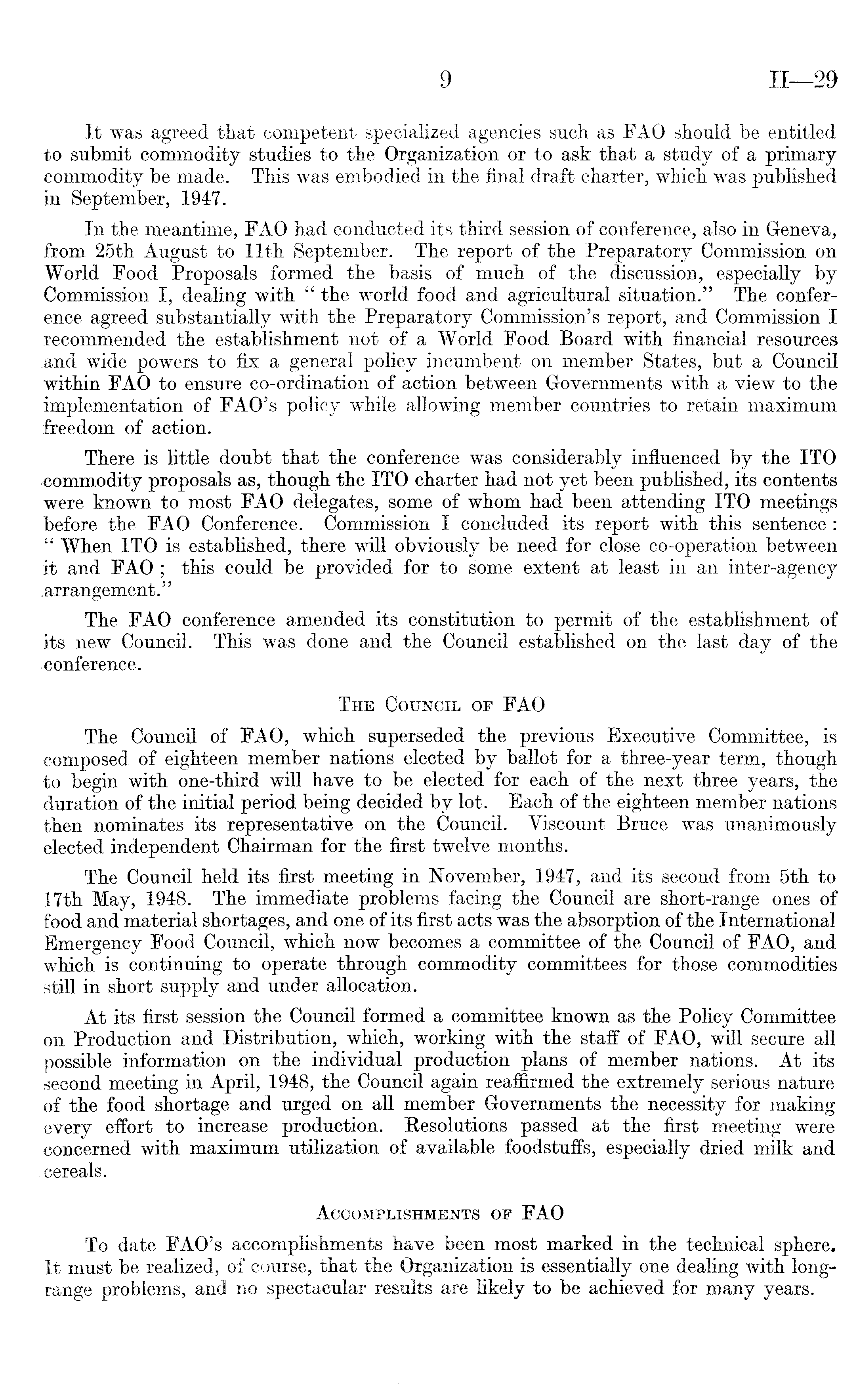 It was agreed that competent specialized agencies such as FAO should be entitled to submit commodity studies to the Organization or to ask that a study of a primary commodity be made. This was embodied in the final draft charter, which was published in September, 1947. In the meantime, FAO had conducted its third session of conference, also in Geneva, from 25th August to 11th September. The report of the Preparatory Commission on World Food Proposals formed the basis of much of the discussion, especially by Commission I, dealing with " the world food and agricultural situation." The conference agreed substantially with the Preparatory Commission's report, and Commission I recommended the establishment not of a World Food Board with financial resources and wide powers to fix a general policy incumbent on member States, but a Council within FAO to ensure co-ordination of action between Governments with a view to the implementation of FAO's policy while allowing member countries to retain maximum freedom of action. There is little doubt that the conference was considerably influenced by the ITO commodity proposals as, though the ITO charter had not yet been published, its contents were known to most FAO delegates, some of whom had been attending ITO meetings before the FAO Conference. Commission I concluded its report with this sentence : " When ITO is established, there will obviously be need for close co-operation between it and FAO ; this could be provided for to some extent at least in an inter-agency .arrangement." The FAO conference amended its constitution to permit of the establishment of its new Council. This was done and the Council established on the last day of the •conference. The Council of FAO The Council of FAO, which superseded the previous Executive Committee, is composed of eighteen member nations elected by ballot for a three-year term, though to begin with one-third will have to be elected for each of the next three years, the duration of the initial period being decided by lot. Each of the eighteen member nations then nominates its representative on the Council. Viscount Bruce was unanimously -elected independent Chairman for the first twelve months. The Council held its first meeting in November, 1947, and its second from sth to 17th May, 1948. The immediate problems facing the Council are short-range ones of food and material shortages, and one of its first acts was the absorption of the International Emergency Food Council, which now becomes a committee of the Council of FAO, and which is continuing to operate through commodity committees for those commodities still in short supply and under allocation. At its first session the Council formed a committee known as the Policy Committee on Production and Distribution, which, working with the staff of FAO, will secure all possible information on the individual production plans of member nations. At its second meeting in April, 1948, the Council again reaffirmed the extremely serious nature of the food shortage and urged on all member Governments the necessity for making every effort to increase production. Resolutions passed at the first meeting were concerned with maximum utilization of available foodstuffs, especially dried milk and cereals. Accomplishments of FAO To date FAO's accomplishments have been most marked in the technical sphere. It must be realized, of course, that the Organization is essentially one dealing with longrange problems, and no spectacular results are likely to be achieved for many years.