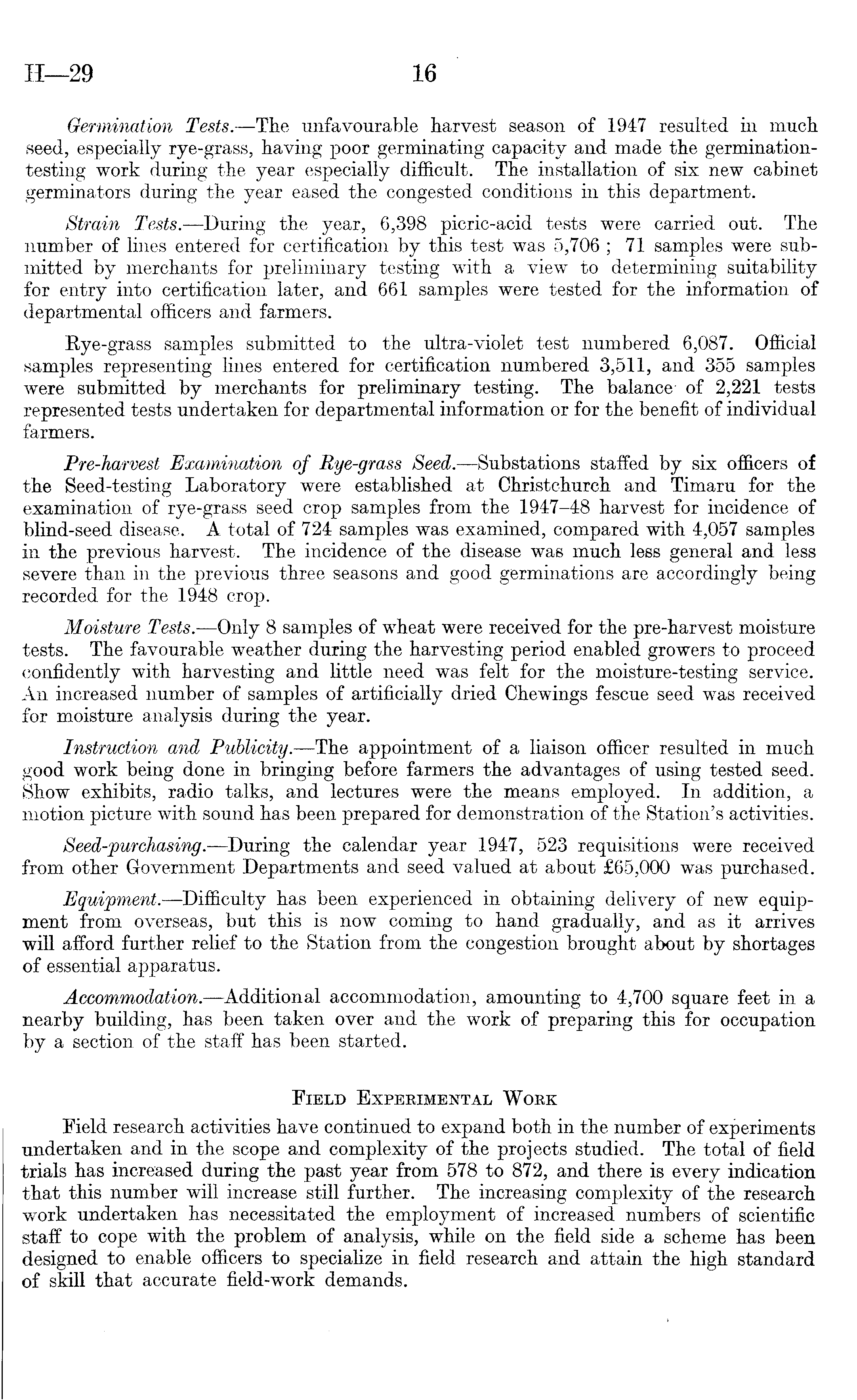 Germination Tests. —The unfavourable harvest season of 1947 resulted in much seed, especially rye-grass, having poor germinating capacity and made the germinationtesting work during the year especially difficult. The installation of six new cabinet germinators during the year eased the congested conditions in this department. Strain Tests. —During the year, 6,398 picric-acid tests were carried out. The number of lines entered for certification by this test was 5,706 ; 71 samples were submitted by merchants for preliminary testing with a view to determining suitability for entry into certification later, and 661 samples were tested for the information of departmental officers and farmers. Rye-grass samples submitted to the ultra-violet test numbered 6,087. Official samples representing lines entered for certification numbered 3,511, and 355 samples were submitted by merchants for preliminary testing. The balance of 2,221 tests represented tests undertaken for departmental information or for the benefit of individual farmers. Pre-harvest Examination of Rye-grass Seed. —Substations staffed by six officers of the Seed-testing Laboratory were established at Christchurch and Timaru for the examination of rye-grass seed crop samples from the 1947-48 harvest for incidence of blind-seed disease. A total of 724 samples was examined, compared with 4,057 samples in the previous harvest. The incidence of the disease was much less general and less severe than in the previous three seasons and good germinations are accordingly being recorded for the 1948 crop. Moisture Tests. —Only 8 samples of wheat were received for the pre-harvest moisture tests. The favourable weather during the harvesting period enabled growers to proceed confidently with harvesting and little need was felt for the moisture-testing service. An increased number of samples of artificially dried Chewings fescue seed was received for moisture analysis during the year. Instruction and Publicity. —The appointment of a liaison officer resulted in much good work being done in bringing before farmers the advantages of using tested seed. Show exhibits, radio talks, and lectures were the means employed. In addition, a motion picture with sound has been prepared for demonstration of the Station's activities. Seed-purchasing. —During the calendar year 1947, 523 requisitions were received from other Government Departments and seed valued at about £65,000 was purchased. Equipment. —Difficulty has been experienced in obtaining delivery of new equipment from overseas, but this is now coming to hand gradually, and as it arrives will afford further relief to the Station from the congestion brought about by shortages of essential apparatus. Accommodation. —Additional accommodation, amounting to 4,700 square feet in a nearby building, has been taken over and the work of preparing this for occupation by a section of the staff has been started. Field Experimental Work Field research activities have continued to expand both in the number of experiments undertaken and in the scope and complexity of the projects studied. The total of field trials has increased during the past year from 578 to 872, and there is every indication that this number will increase still further. The increasing complexity of the research work undertaken has necessitated the employment of increased numbers of scientific staff to cope with the problem of analysis, while on the field side a scheme has been designed to enable officers to specialize in field research and attain the high standard of skill that accurate field-work demands.
