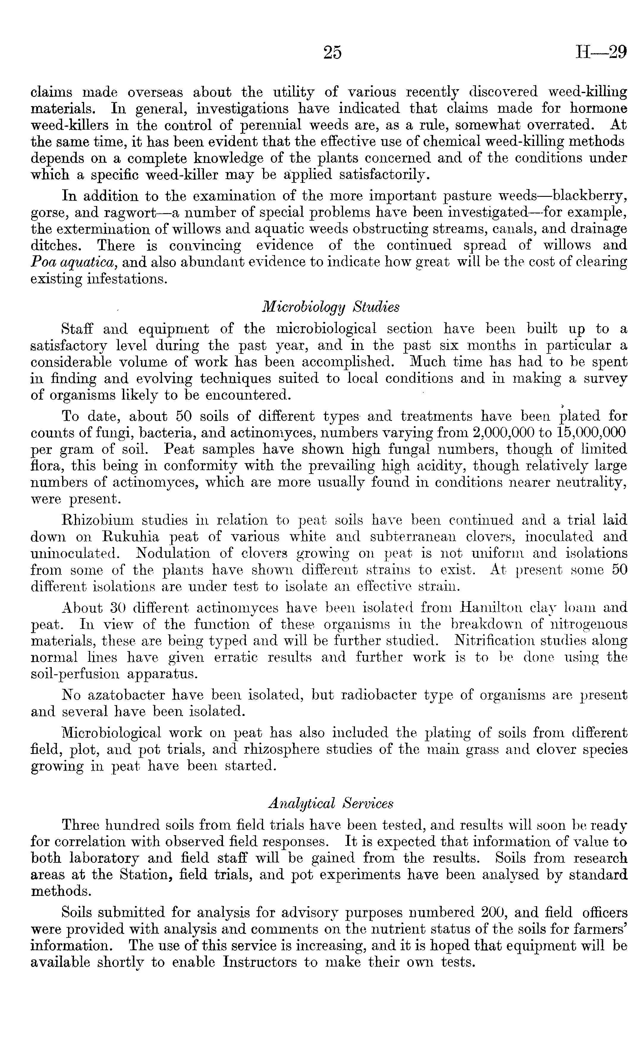 claims made overseas about the utility of various recently discovered weed-killing materials. In general, investigations have indicated that claims made for hormone weed-killers in the control of perennial weeds are, as a rule, somewhat overrated. At the same time, it has been evident that the effective use of chemical weed-killing methods depends on a complete knowledge of the plants concerned and of the conditions under which a specific weed-killer may be applied satisfactorily. In addition to the examination of the more important pasture weeds —blackberry, gorse, and ragwort —a number of special problems have been investigated—for example, the extermination of willows and aquatic weeds obstructing streams, canals, and drainage ditches. There is convincing evidence of the continued spread of willows and Poa aquatica, and also abundant evidence to indicate how great will be the cost of clearing existing infestations. Microbiology Studies Staff and equipment of the microbiological section have been built up to a satisfactory level during the past year, and in the past six months in particular a considerable volume of work has been accomplished. Much time has had to be spent in finding and evolving techniques suited to local conditions and in making a survey of organisms likely to be encountered. To date, about 50 soils of different types and treatments have been plated for counts of fungi, bacteria, and actinomyces, numbers varying from 2,000,000 to 15,000,000 per gram of soil. Peat samples have shown high fungal numbers, though of limited flora, this being in conformity with the prevailing high acidity, though relatively large numbers of actinomyces, which are more usually found in conditions nearer neutrality, were present. Rhizobium studies in relation to peat soils have been continued and a trial laid down on Rukuhia peat of various white and subterranean clovers, inoculated and uninoculated. Nodulation of clovers growing on peat is not uniform and isolations from some of the plants have shown different strains to exist. At present some 50 different isolations are under test to isolate an effective strain. About 30 different actinomyces have been isolated from Hamilton clay loam and peat. In view of the function of these organisms in the breakdown of nitrogenous materials, these are being typed and will be further studied. Nitrification studies along normal lines have given erratic results and further work is to be done using the soil-perfusion apparatus. No azatobacter have been isolated, but radiobacter type of organisms are present and several have been isolated. Microbiological work on peat has also included the plating of soils from different field, plot, and pot trials, and rhizosphere studies of the main grass and clover species growing in peat have been started. Analytical Services Three hundred soils from field trials have been tested, and results will soon be ready iox correlation with observed field responses. It is expected that information of value to both laboratory and field staff will be gained from the results. Soils from research areas at the Station, field trials, and pot experiments have been analysed by standard methods. Soils submitted for analysis for advisory purposes numbered 200, and field officers were provided with analysis and comments on the nutrient status of the soils for farmers' information. The use of this service is increasing, and it is hoped that equipment will be available shortly to enable Instructors to make their own tests.