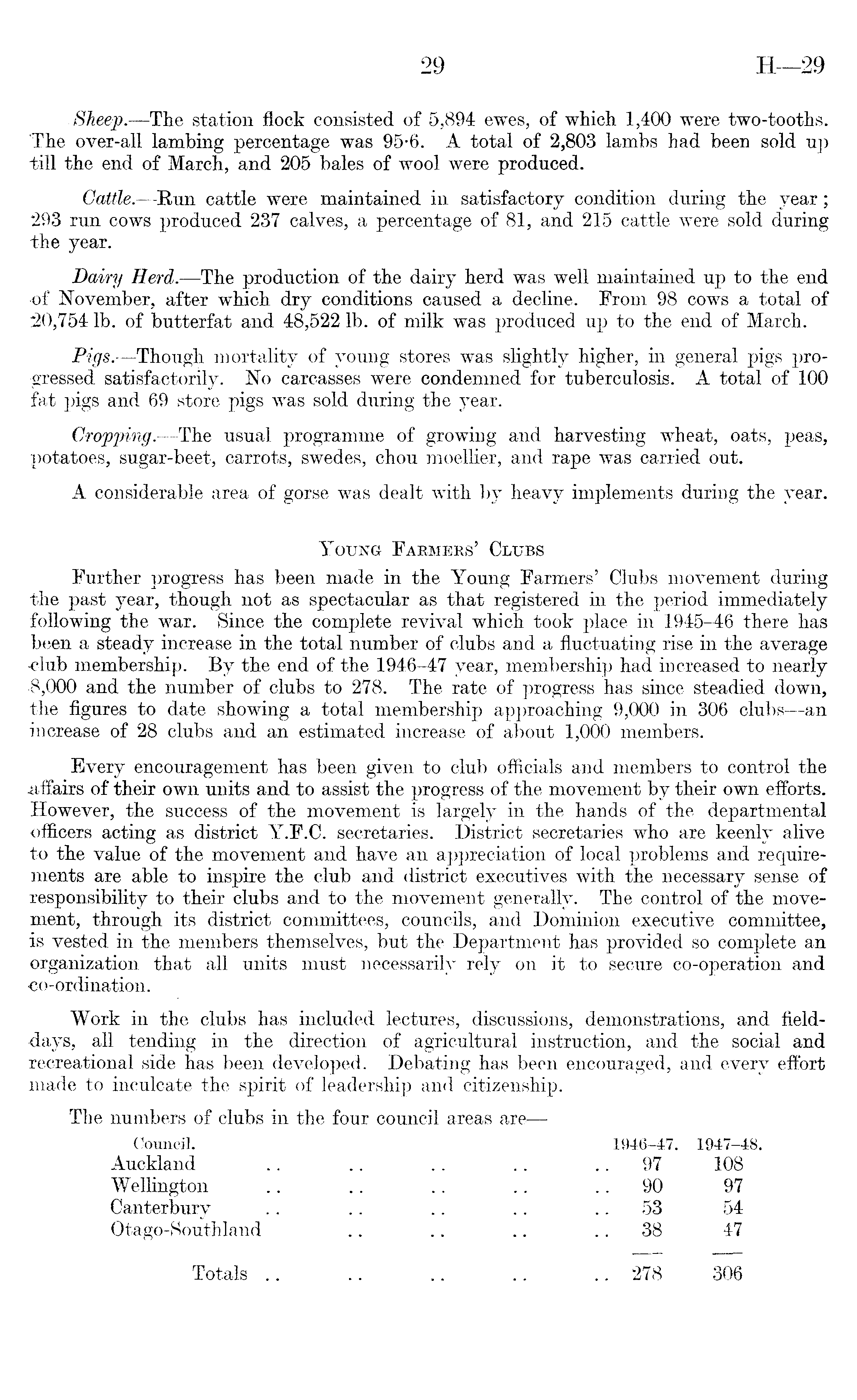 Sheep.—The station flock consisted of 5,894 ewes, of which 1,400 were two-tooths. The over-all lambing percentage was 95*6. A total of 2,803 lambs had been sold up till the end of March, and 205 bales of wool were produced. Cattle.—Run cattle were maintained in satisfactory condition during the year; 293 run cows produced 237 calves, a percentage of 81, and 215 cattle were sold during the year. Dairy Herd.-—The production of the dairy herd was well maintained up to the end of November, after which dry conditions caused a decline. From 98 cows a total of 20,754 lb. of butterfat and 48,522 lb. of milk was produced up to the end of March. Pigs.—Though mortality of young stores was slightly higher, in general pigs progressed satisfactorily. No carcasses were condemned for tuberculosis. A total of 100 fat pigs and 69 store pigs was sold during the year. Cropping.—The usual programme of growing and harvesting wheat, oats, peas, potatoes, sugar-beet, carrots, swedes, chou moellier, and rape was carried out. A considerable area of gorse was dealt with by heavy implements during the year. Young Farmers' Clubs Further progress has been made in the Young Farmers' Clubs movement during the past year, though not as spectacular as that registered in the period immediately following the war. Since the complete revival which took place in 1945-46 there has been a steady increase in the total number of clubs and a fluctuating rise in the average ■club membership. By the end of the 1946-47 year, membership had increased to nearly •8,000 and the number of clubs to 278. The rate of progress has since steadied down, the figures to date showing a total membership approaching 9,000 in 306 clubs —an increase of 28 clubs and an estimated increase of about 1,000 members. Every encouragement has been given to club officials and members to control the .affairs of their own units and to assist the progress of the movement by their own efforts. However, the success of the movement is largely in the hands of the departmental officers acting as district Y.F.C. secretaries. District secretaries who are keenly alive to the value of the movement and have an appreciation of local problems and requirements are able to inspire the club and district executives with the necessary sense of responsibility to their clubs and to the movement generally. The control of the movement, through its district committees, councils, and Dominion executive committee, is vested in the members themselves, but the Department has provided so complete an organization that all units must necessarily rely on it to secure co-operation and co-ordination. Work in the clubs has included lectures, discussions, demonstrations, and fielddays, all tending in the direction of agricultural instruction, and the social and recreational side has been developed. Debating has been encouraged, and every effort made to inculcate the spirit of leadership and citizenship. The numbers of clubs in the four council areas are— Council. 1946-47. 1947-48. Auckland .. .. .. .. 97 108 Wellington .. .. .. .. 90 97 Canterbury .. .. .. .. 53 54 Otago-Southland .. .. .. 38 47 Totals .. .. .. .. ..278 306